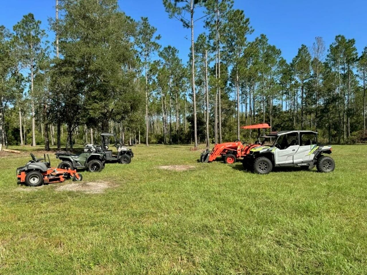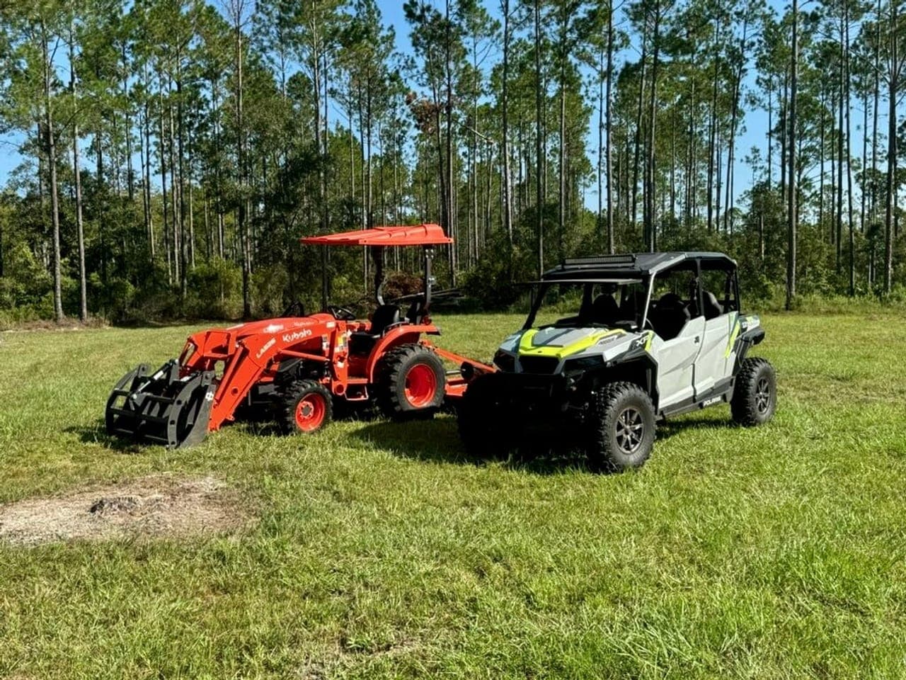 - 2024 Kubota tractor with front-end loader, grapple rake, 5' land pride mower, root rake, and bucket