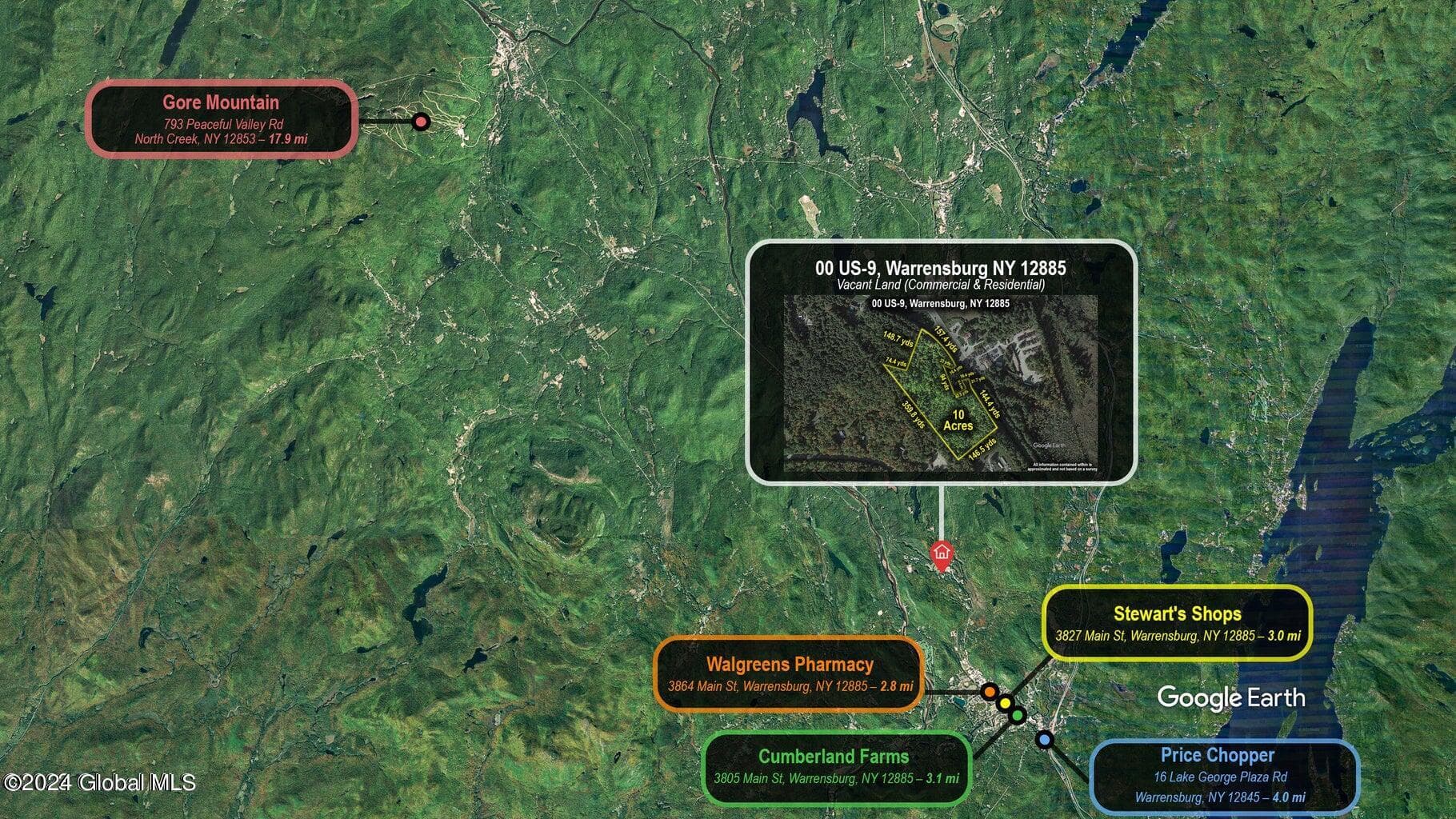 10.26 acres of prime unimproved vacant land with 885 sq feet of road frontage located at the busy intersection of Route 9 and 28, across from Discoveries USA. 20 mins to Gore Mtn, 15 Mins to Lake George, close to the Adirondacks. Zoned commercial and residential. Site is approved for development plans of a 6500+ sf building with 30 parking spaces. Lease terms and owner financing options available, surveys complete, versatility and scope, endless opportunities and ideal investment are just a few of the key features this location has to offer!