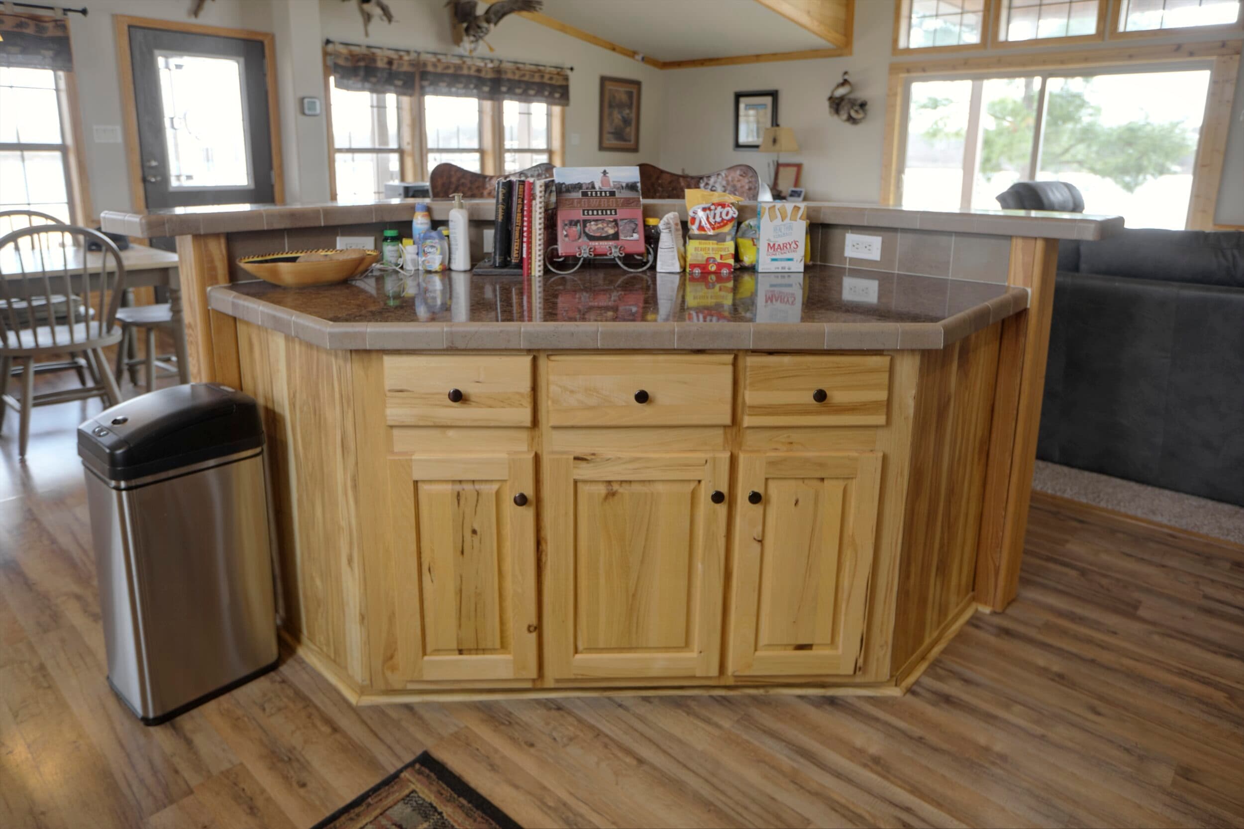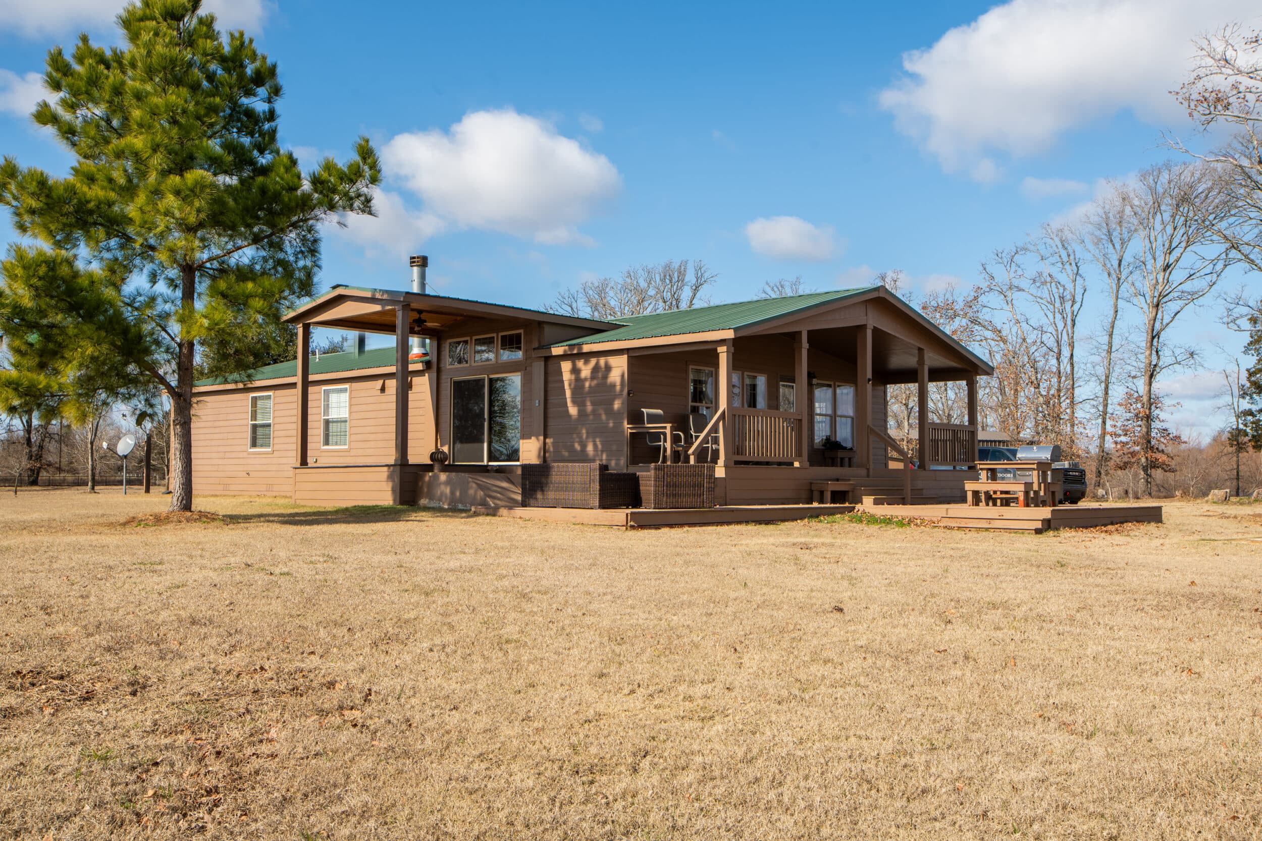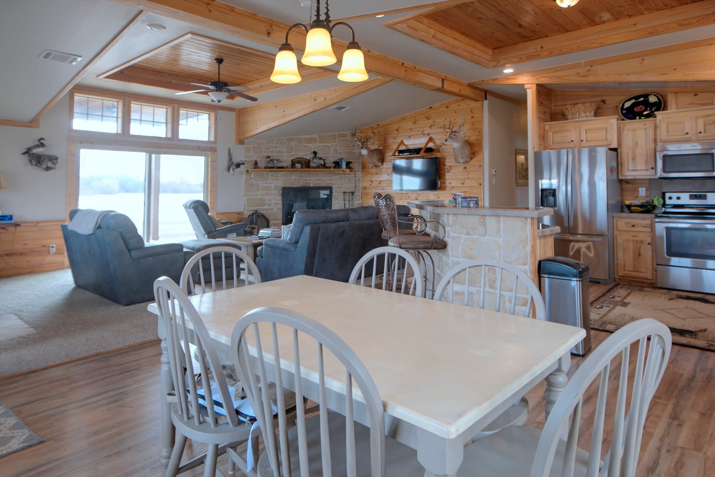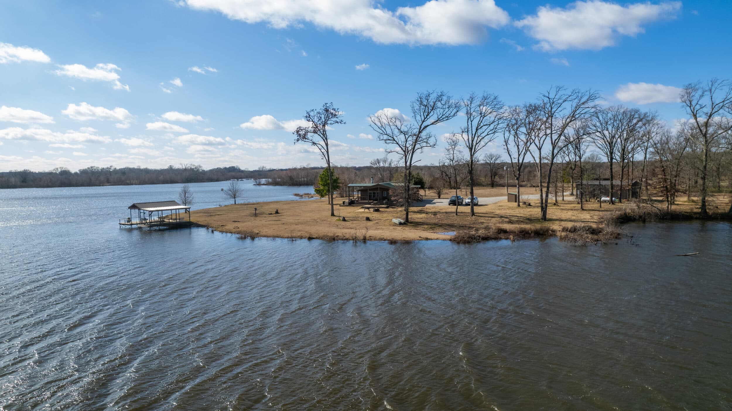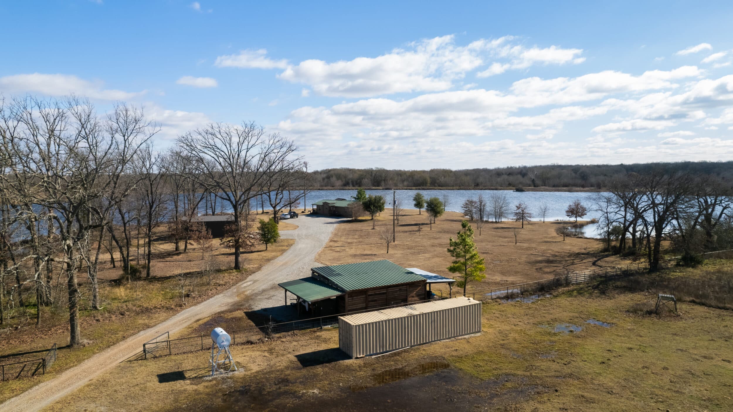 A cozy and comfortable three bedroom and two bathroom home sits at the end of a one mile long driveway to the pinnacle of the lake and is set at a perfect angle to enjoy the sunrises and sunsets throughout the seasons. The home sets up perfectly as either a full time residence or as a weekend/vacation home. As you enter the home, your eyes immediately shift to the limestone that frames the wood burning fireplace anchoring the living area. The vaulted ceilings and the pine woodwork that flows throughout the home gives it a rustic cabin feel. The well appointed kitchen has a large island wrapped in limestone matching the fireplace, stainless steel appliances and plenty of cabinet space. The master suite, two spare bedrooms, hall bath and laundry room round out the home. Dependent upon how you arrange the home, you could easily sleep 6 to 8 people. Stepping outside, the home has two strategically positioned covered decks that allow for over-watch of the lake and its inhabitants. For safety, there is an underground concrete storm shelter and a whole home backup generator. Just like the rest of the property, the entire home is solid, clean and well designed and easy to manage and maintain from afar. The metal roof, concrete board siding and gated entrance allow you to utilize this as a second home without worry.