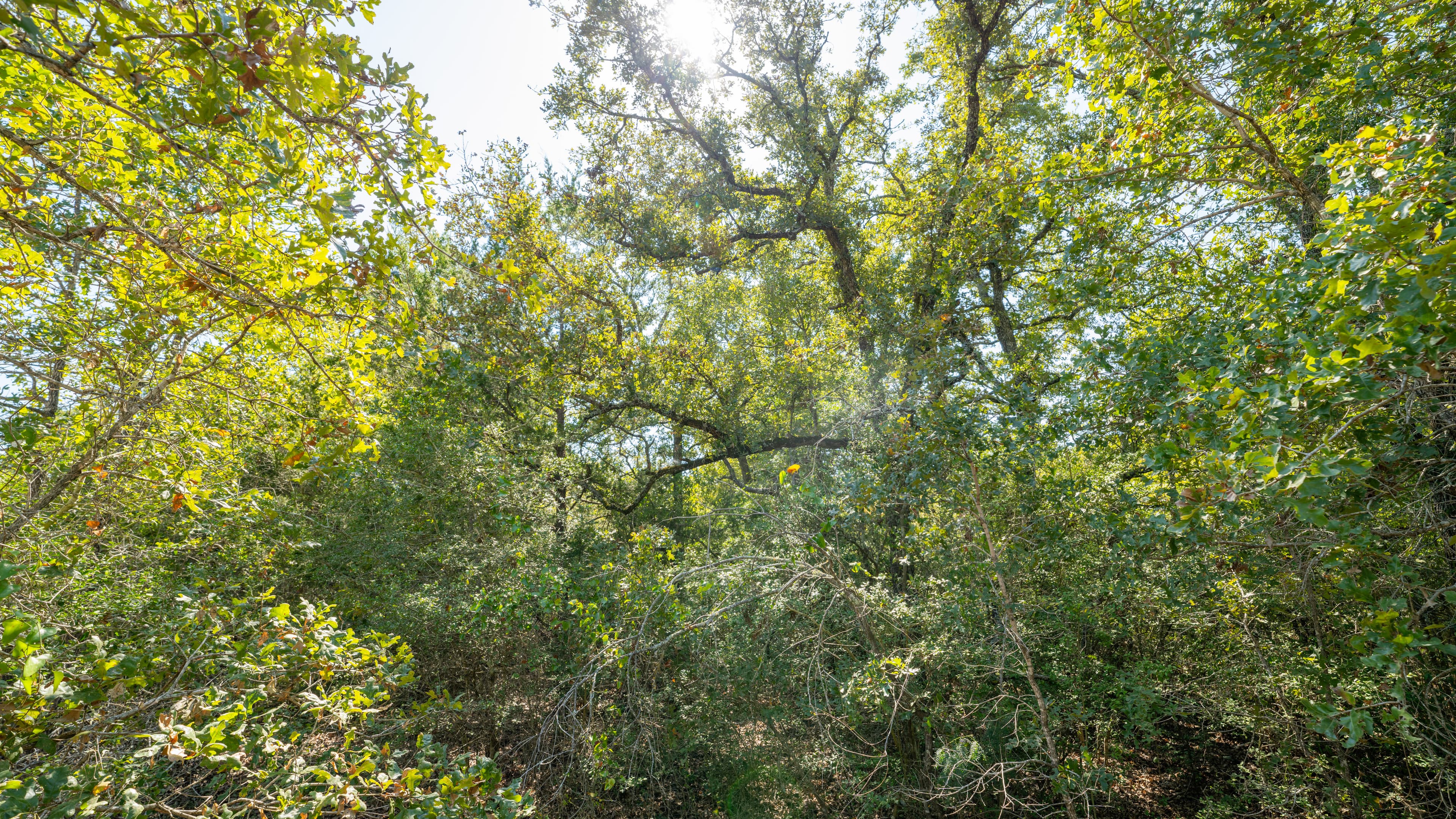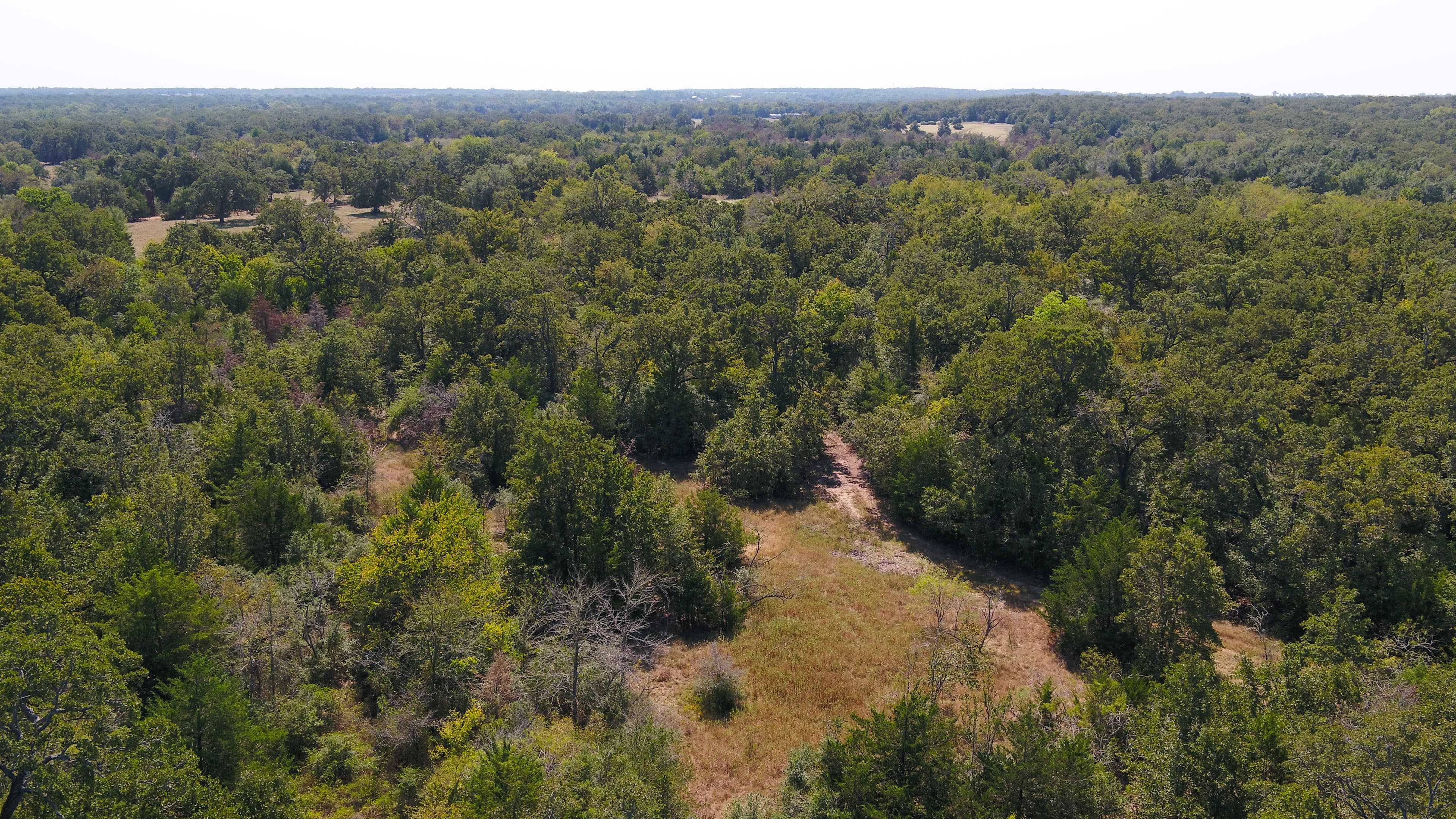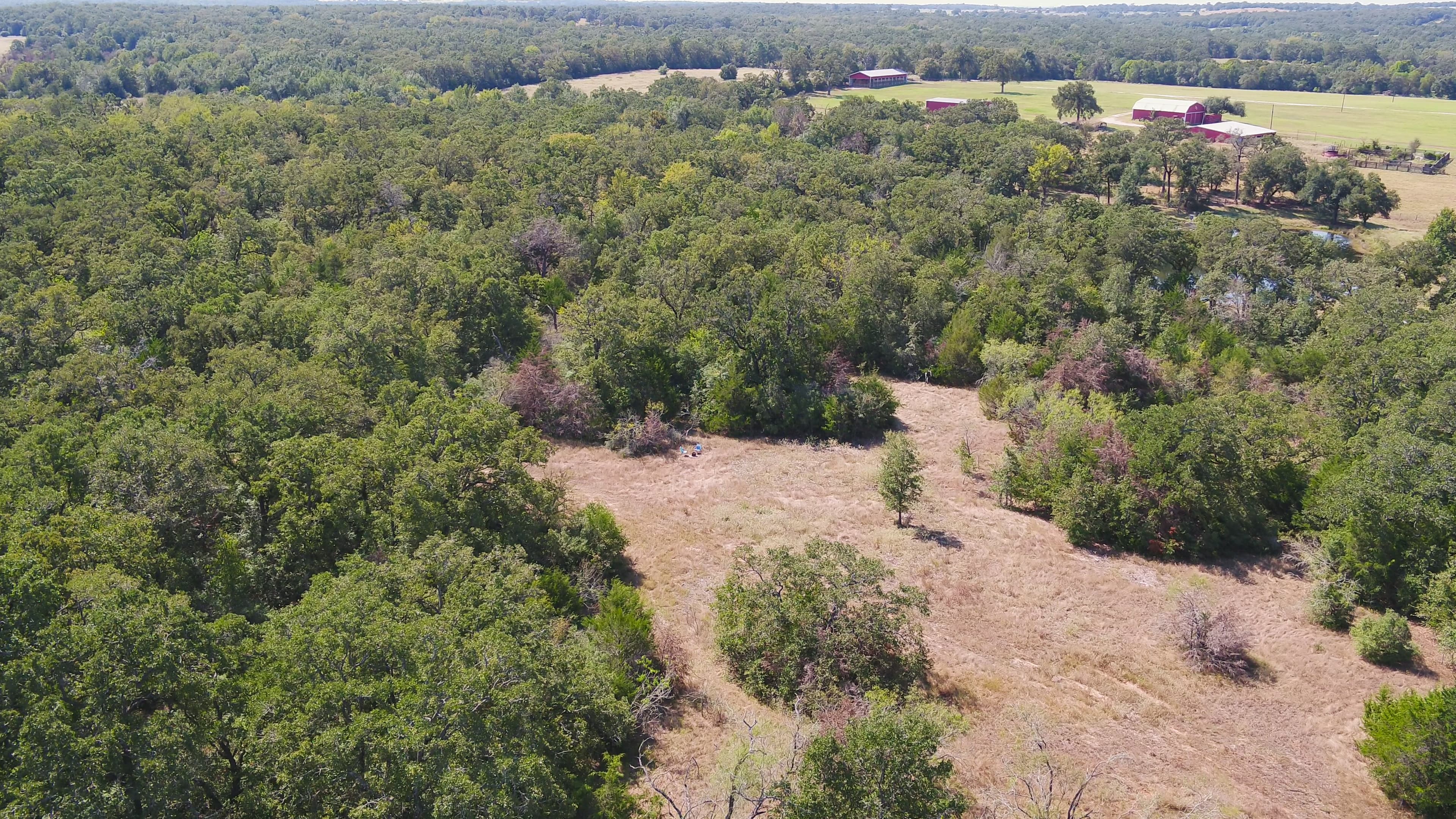 The property features heavily wooded areas filled with oak trees, with several scattered openings.