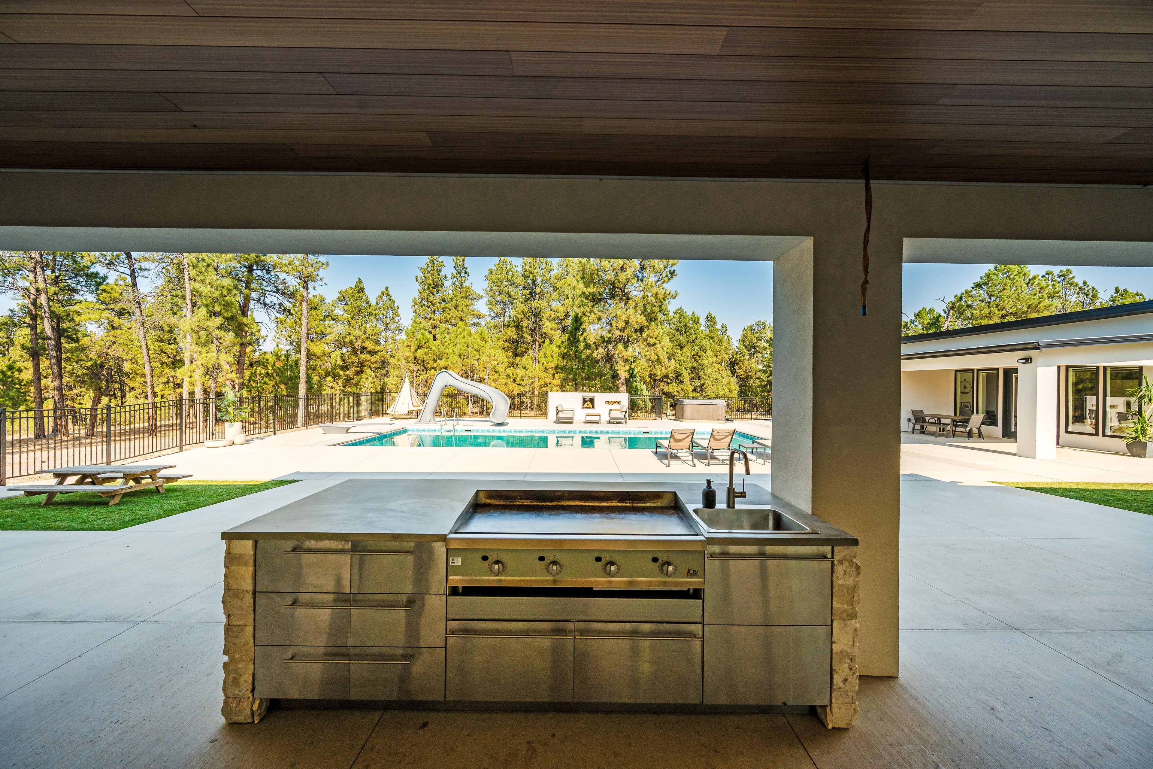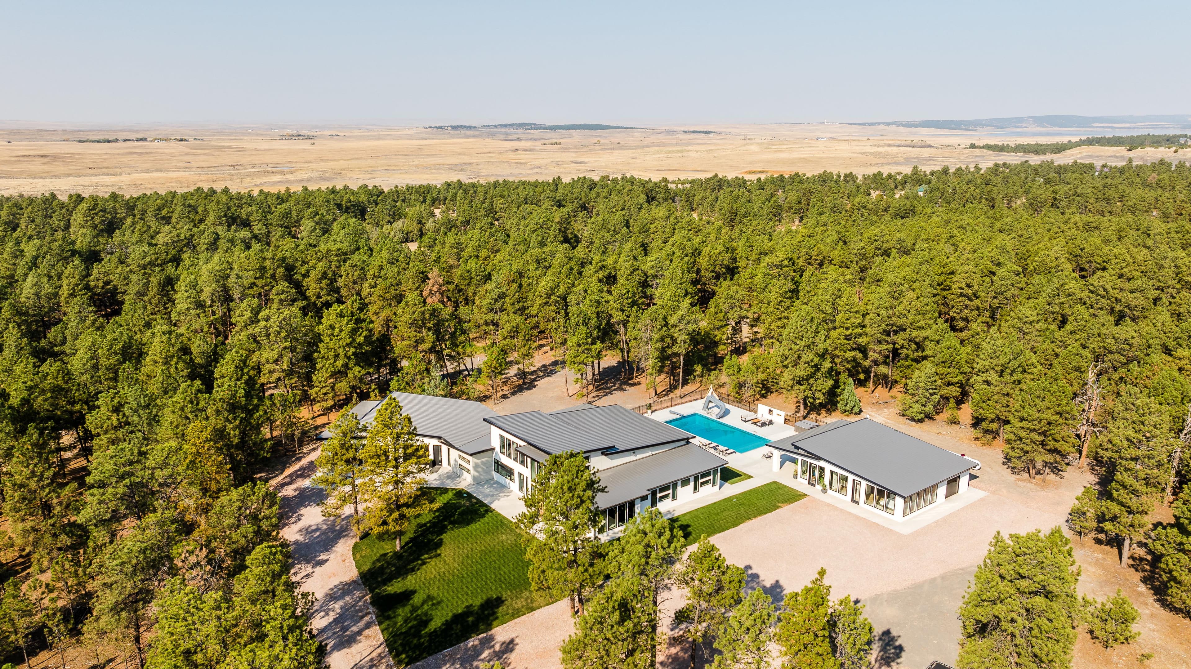 Nestled amongst the pines on the western edge of the Black Hills sits a secluded custom retreat with 5,765± square feet of indoor living space. Finished in 2024, the improvements feature a main home with 4 bedrooms and 3.5 bathrooms, an outdoor pool, a pool house with an additional bedroom, 2 full bathrooms, a kitchen area, and a sauna. Boasting exceptional privacy and surrounded by 7.81 acres of pine trees, you feel as if you are miles away from it all.