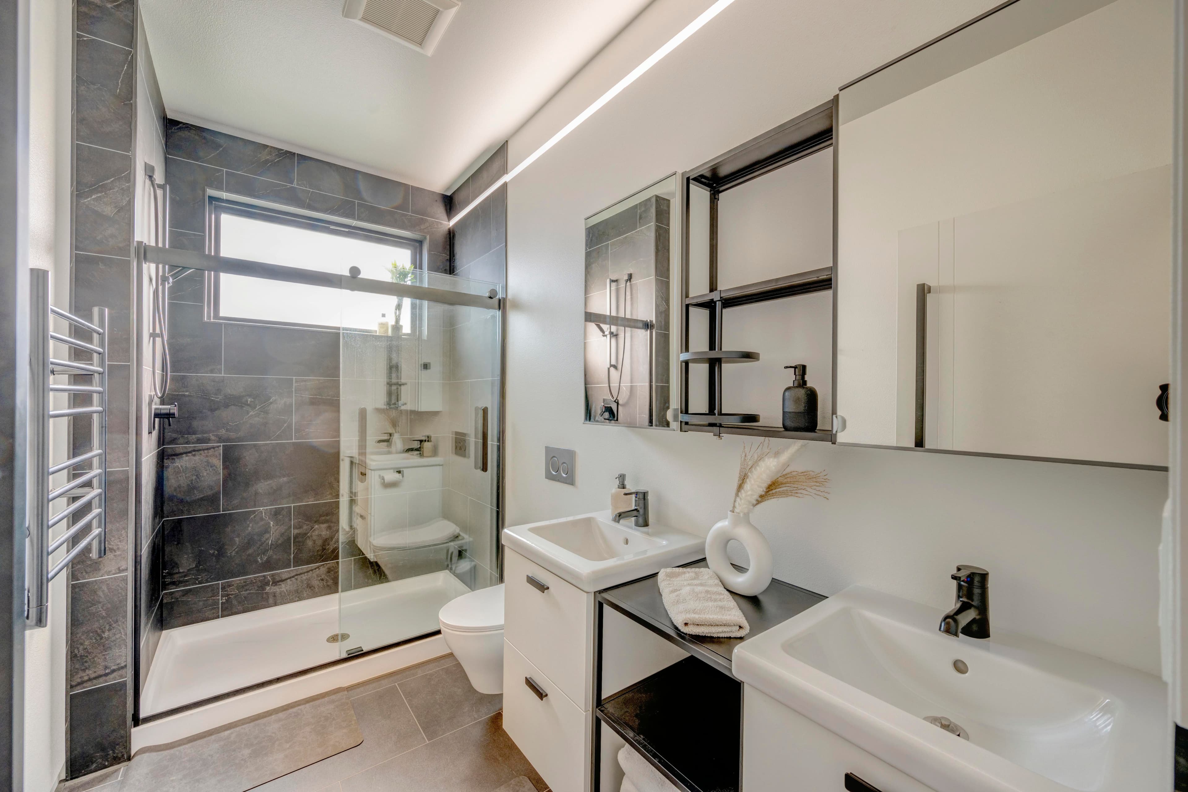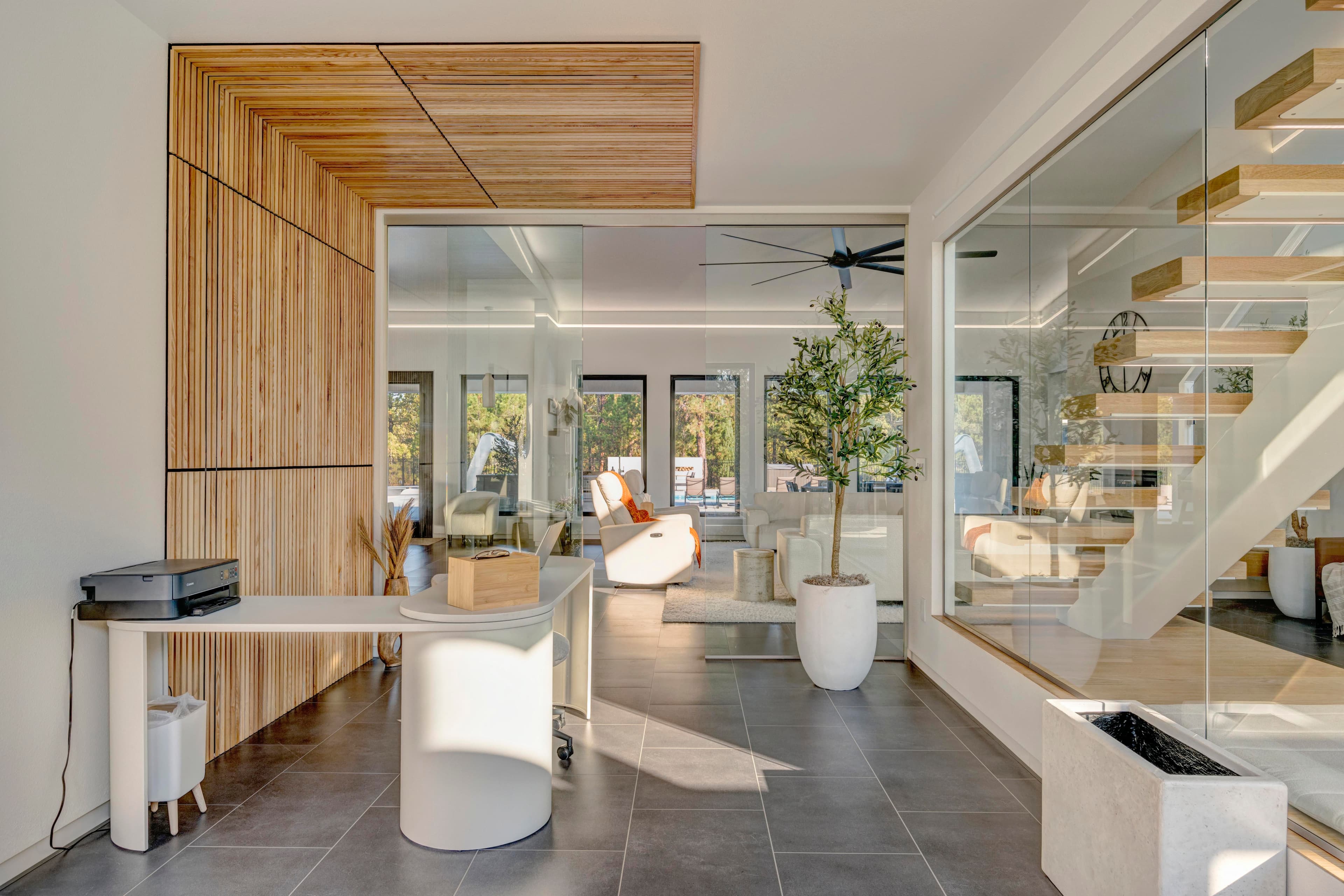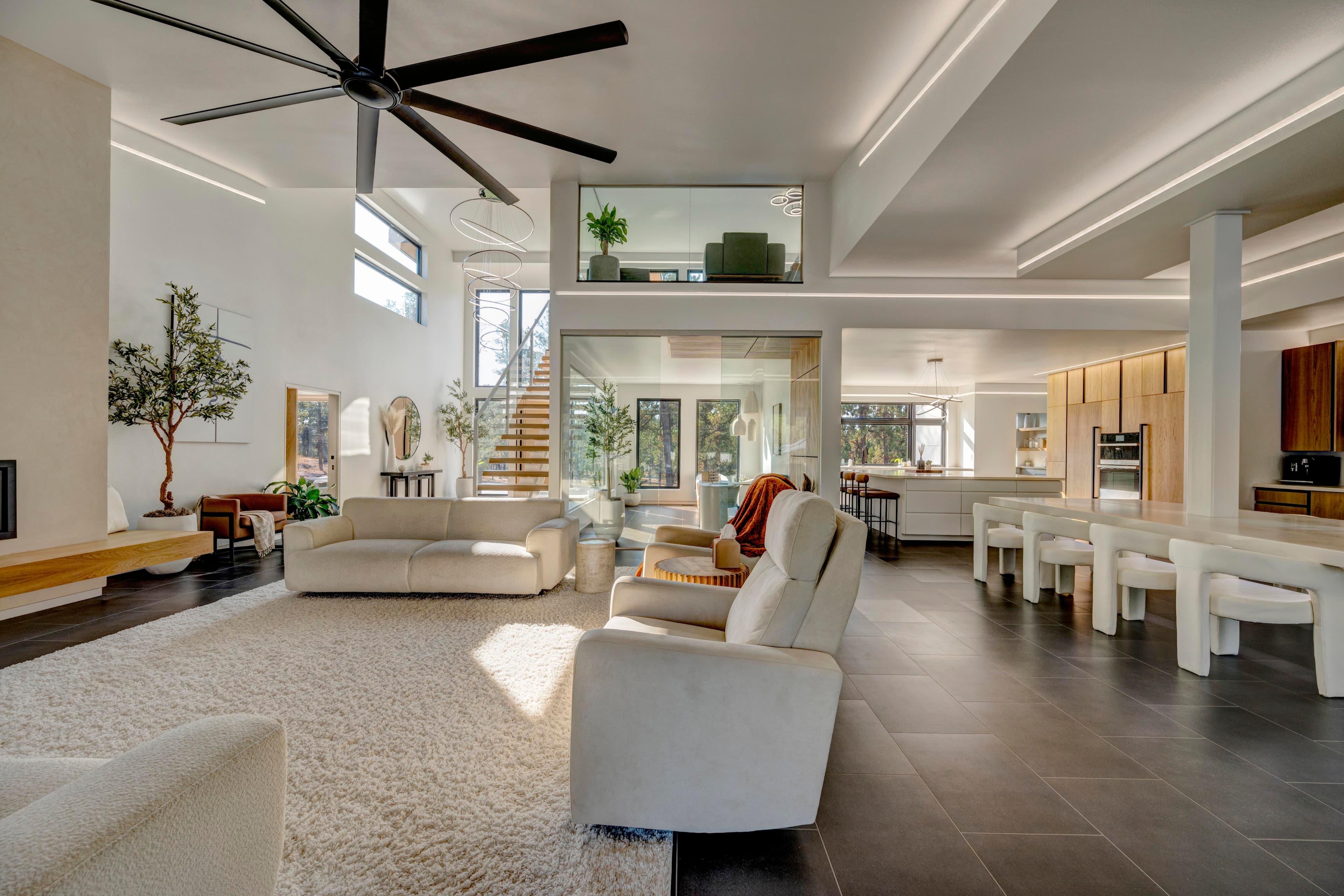 This modern home with abundant natural light is loaded with modern smart home features, including a fully automated sprinkler-and-lawn-mowing system, creating a perfectly manicured lawn.