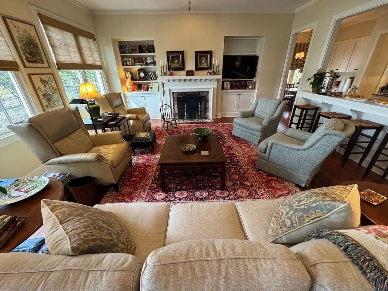 Spacious living room with gas fireplace and full-length picture windows overlooking the water