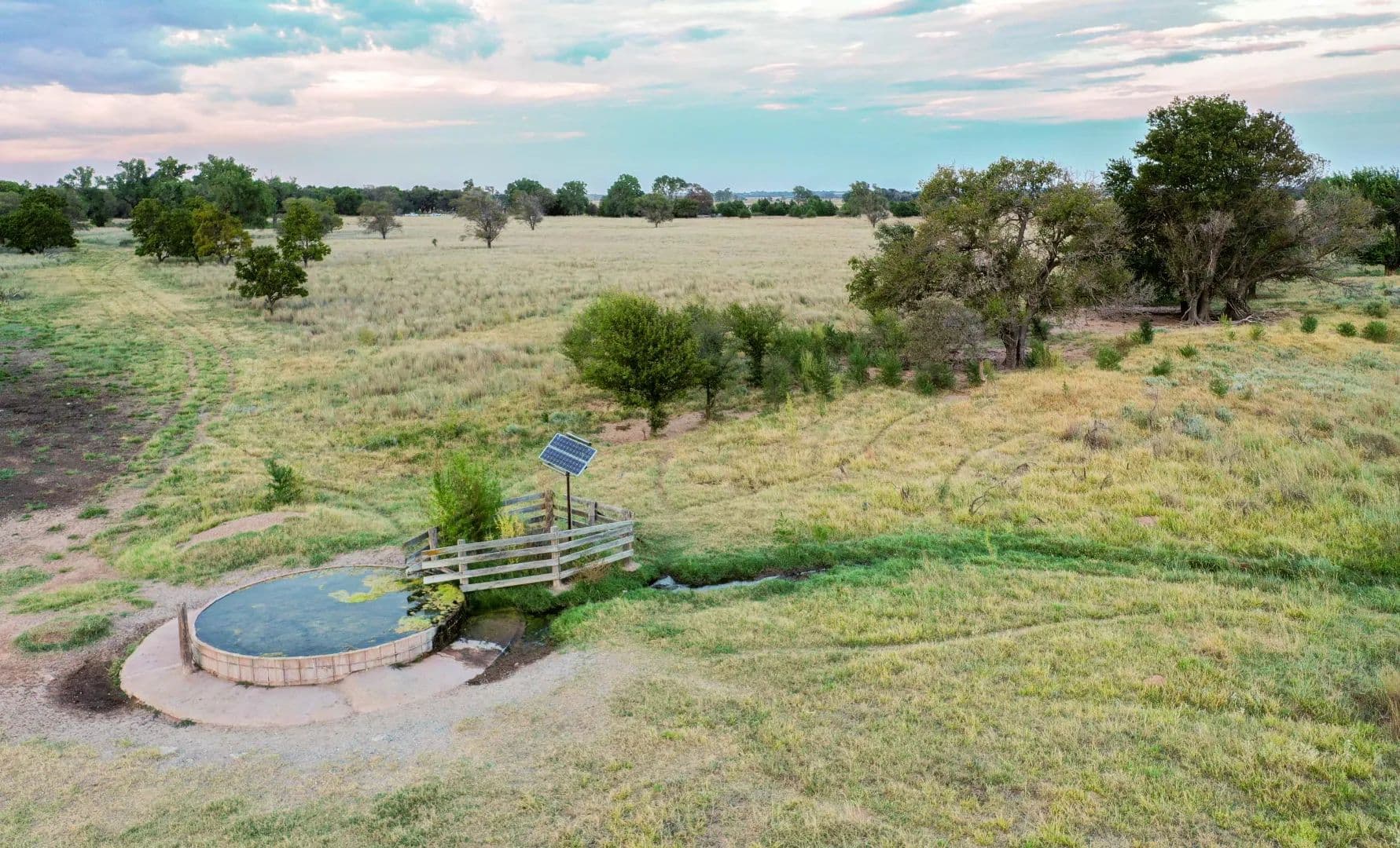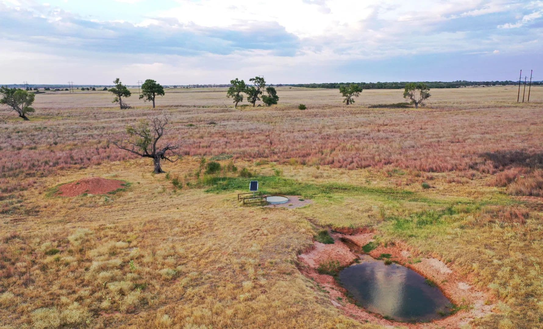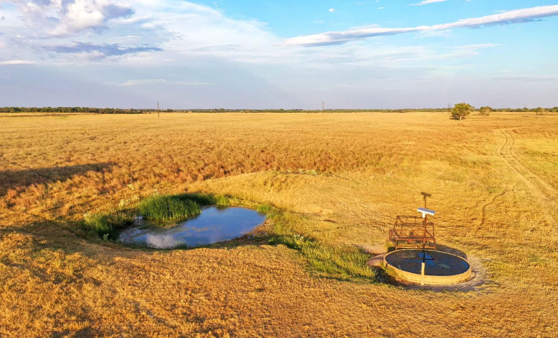 The property is considered to be extremely well watered. There are approximately 6 operating solar wells, along with two earthen ponds. Groundwater is shallow, being only 25–30 feet deep.