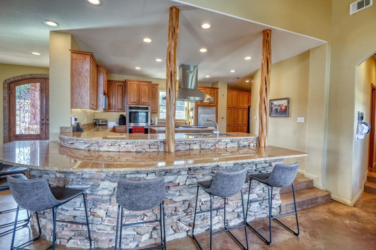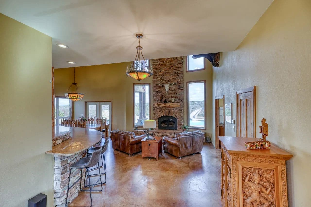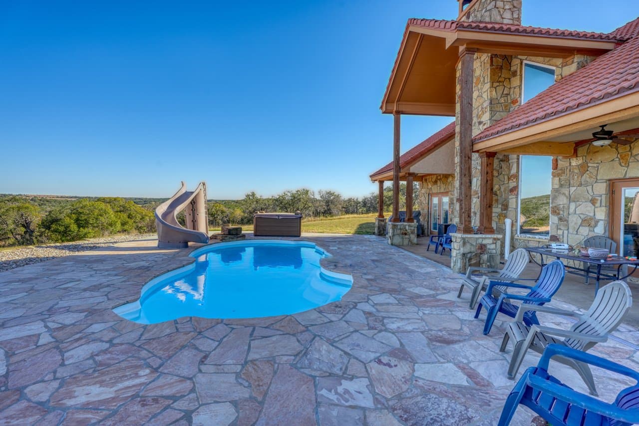 The centerpiece of Mason Ranch is a stunning 3,007 sq. ft. custom stone home built in 2005. The residence features stained concrete floors, granite countertops, and a gourmet kitchen equipped with a double oven and JennAir cooktop. With 4 spacious bedrooms and 3 bathrooms, the home offers ample comfort and style. Cozy up by the fireplace on cool evenings, or step outside to enjoy your private oasis—a swimming pool with a slide, a hot tub, and panoramic views from the hilltop setting.