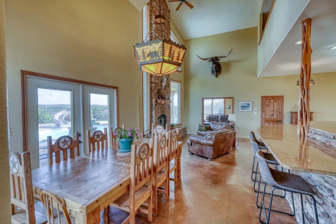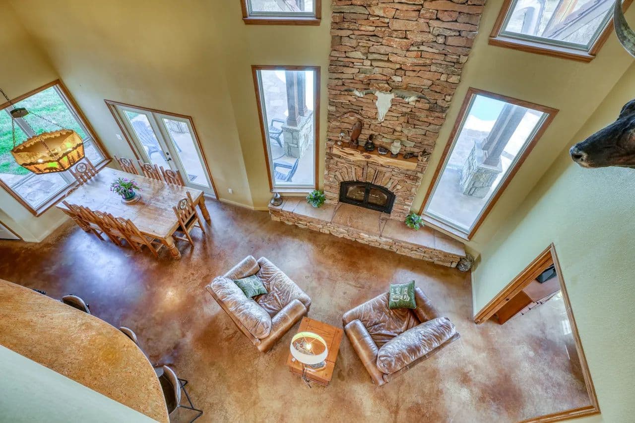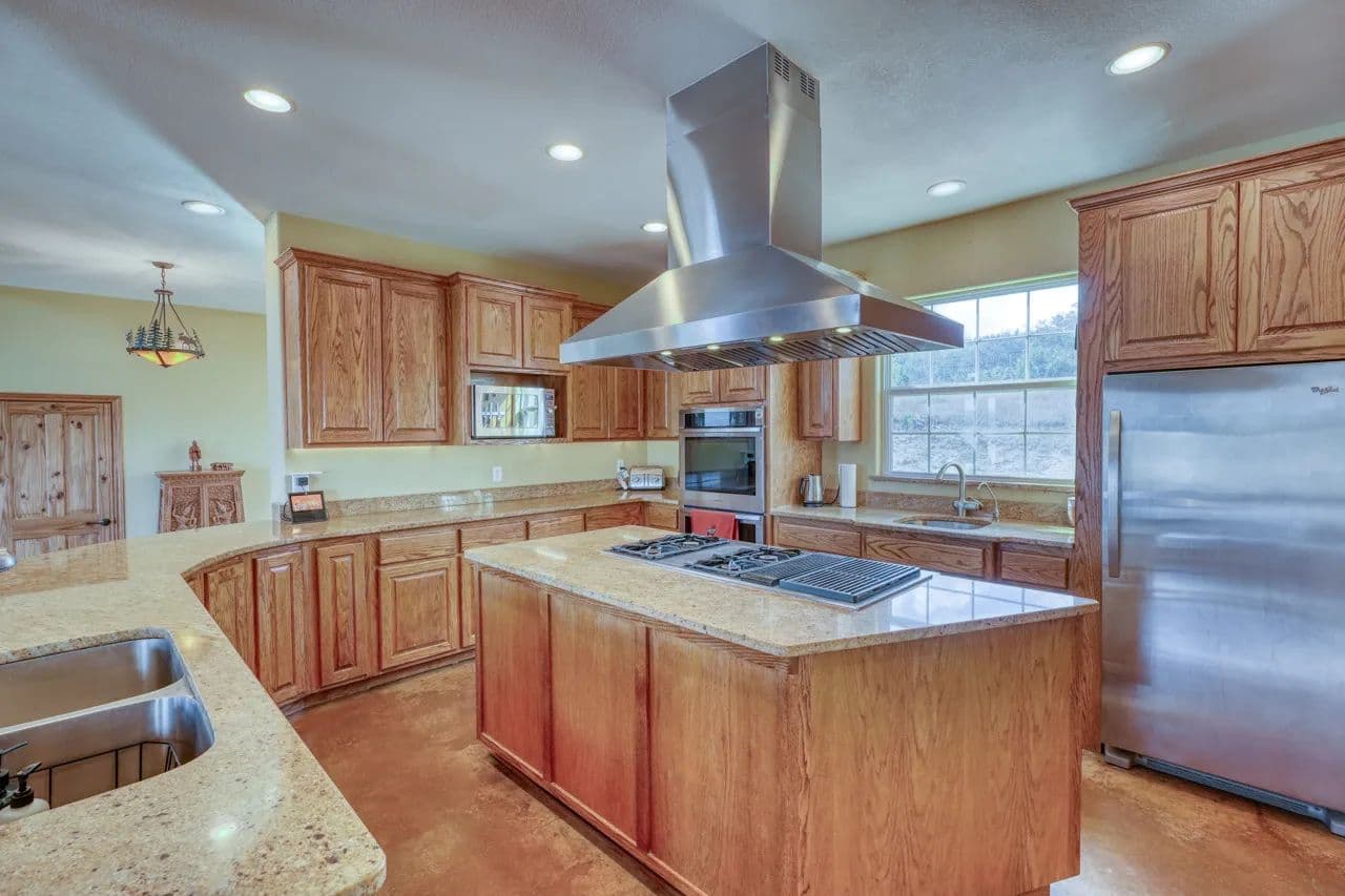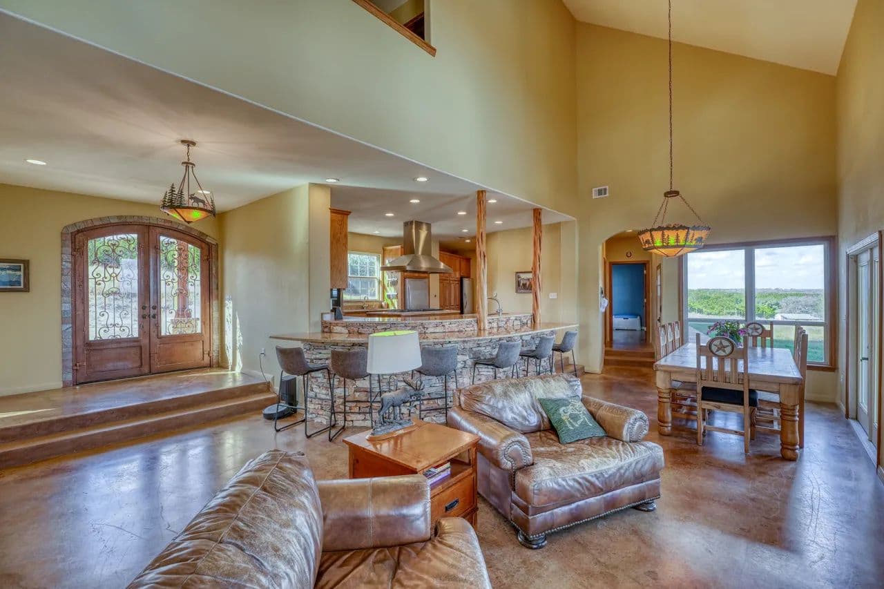 The centerpiece of Mason Ranch is a stunning 3,007 sq. ft. custom stone home built in 2005. The residence features stained concrete floors, granite countertops, and a gourmet kitchen equipped with a double oven and JennAir cooktop. With 4 spacious bedrooms and 3 bathrooms, the home offers ample comfort and style. Cozy up by the fireplace on cool evenings, or step outside to enjoy your private oasis—a swimming pool with a slide, a hot tub, and panoramic views from the hilltop setting.