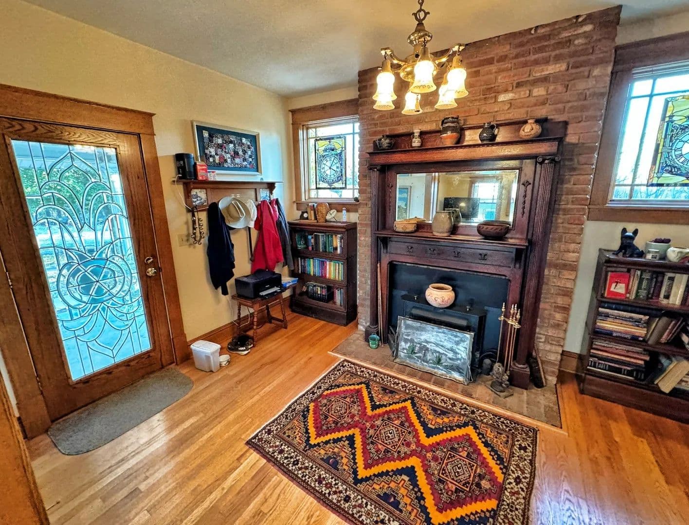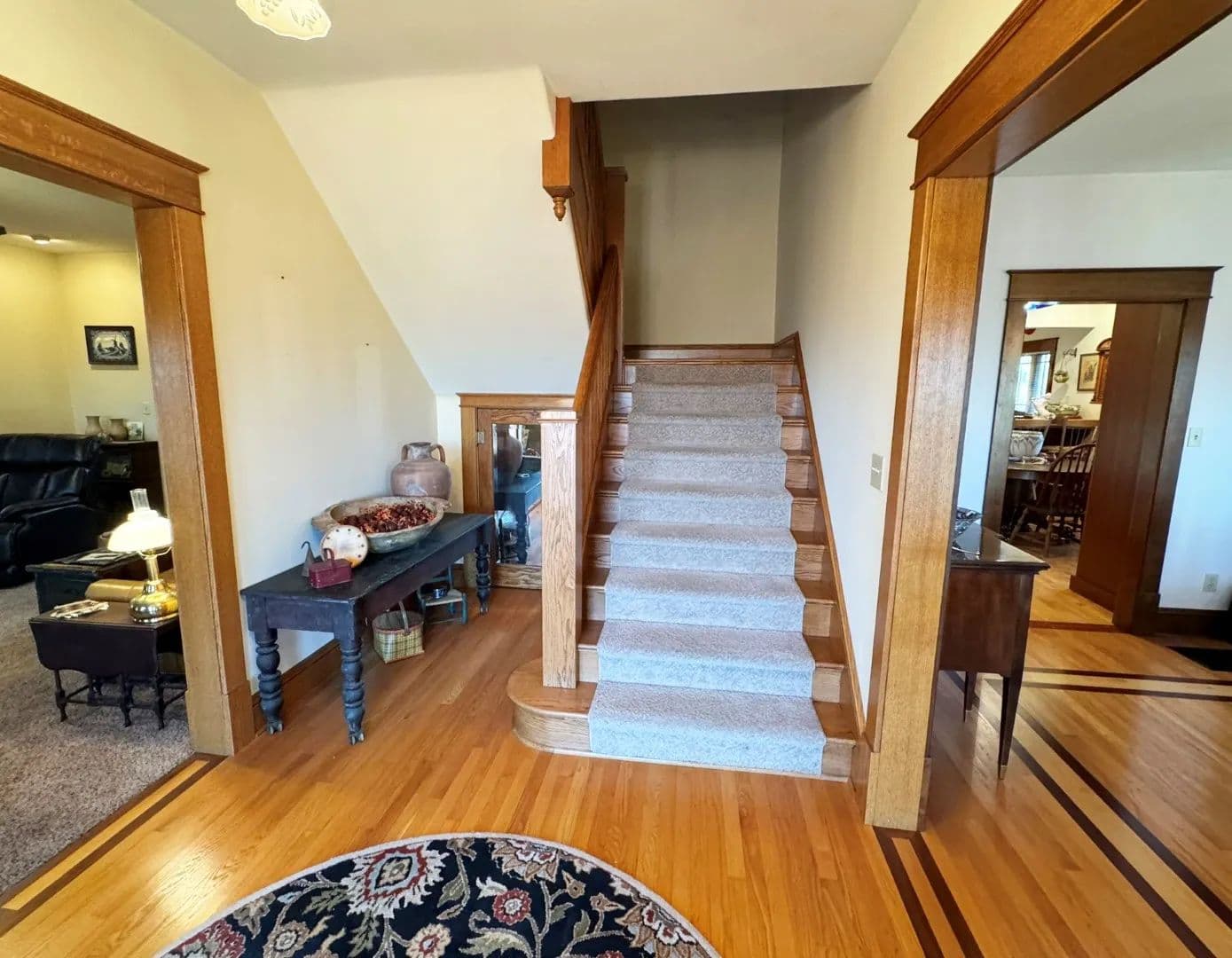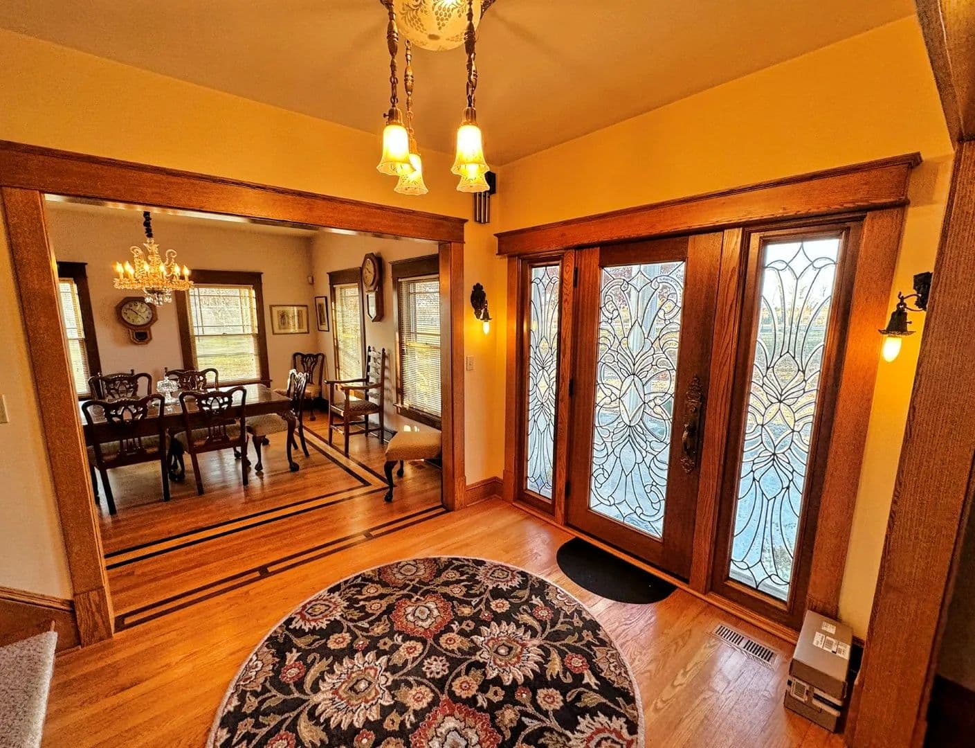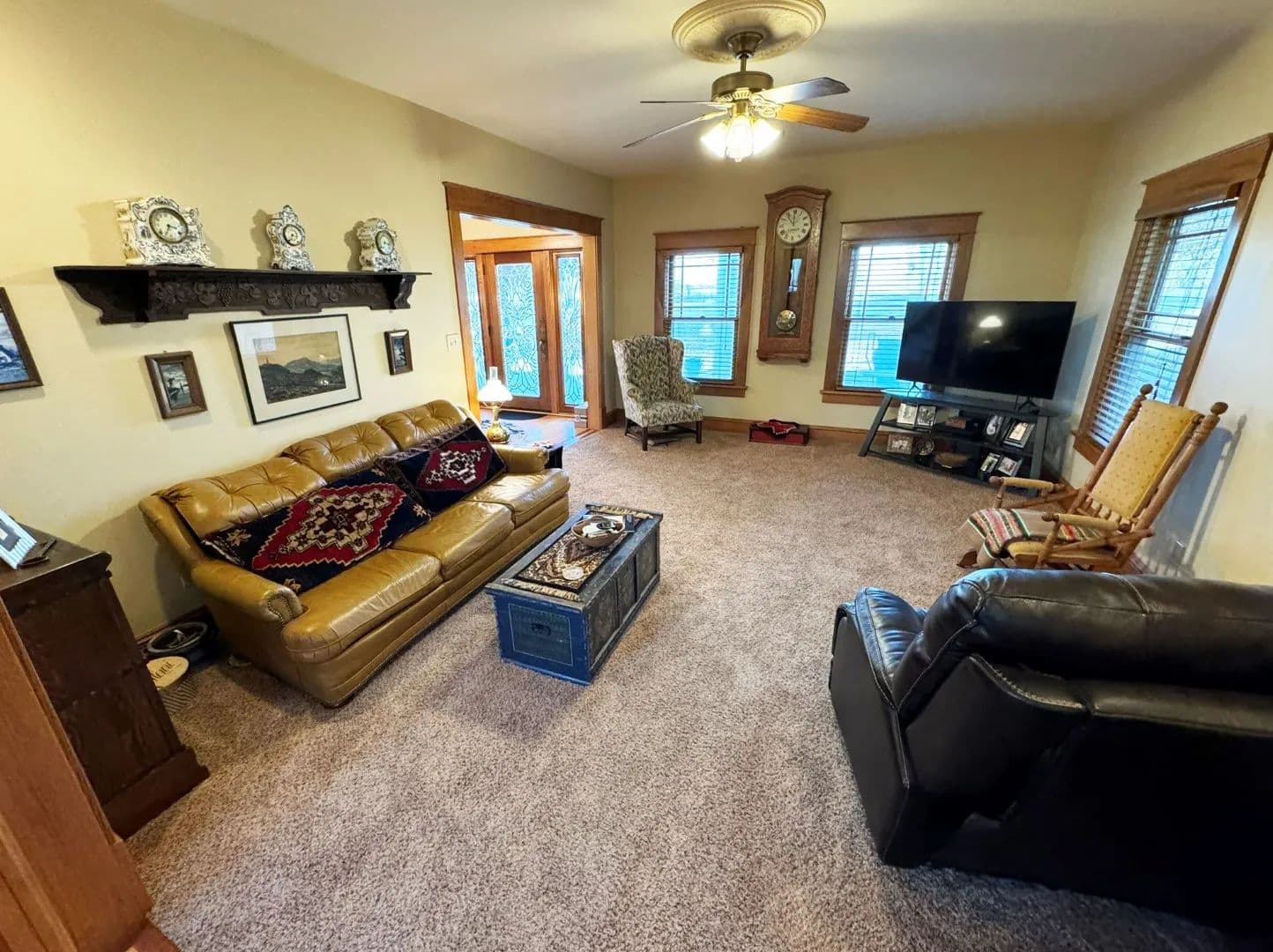 The home commands your attention as you walk up to the expansive front porch with it’s towering clock. The clock was saved from a building in Nebraska and moved to its current location where it stands as a sentinel along I-70 between Topeka and Lawrence.