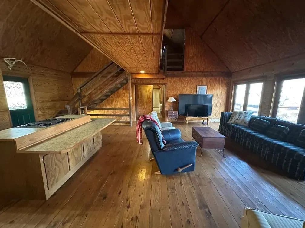 The cozy 4 bedroom, 2 bath, main level guest cabin includes an open floor-plan with amazing lakefront views, a loft overlooking the great room, walkout basement on the lake side, wrap-around porch, and a dock for fishing on the lake. The detached double overhead door building situated across from the cabin is the perfect place to use as a garage or for storing your outdoor toys