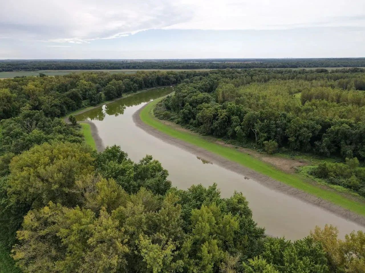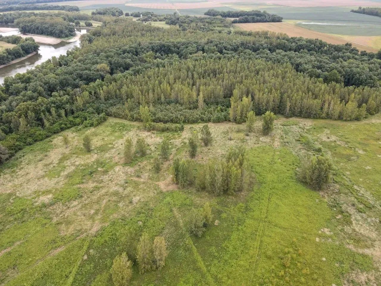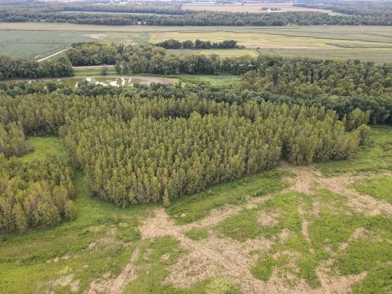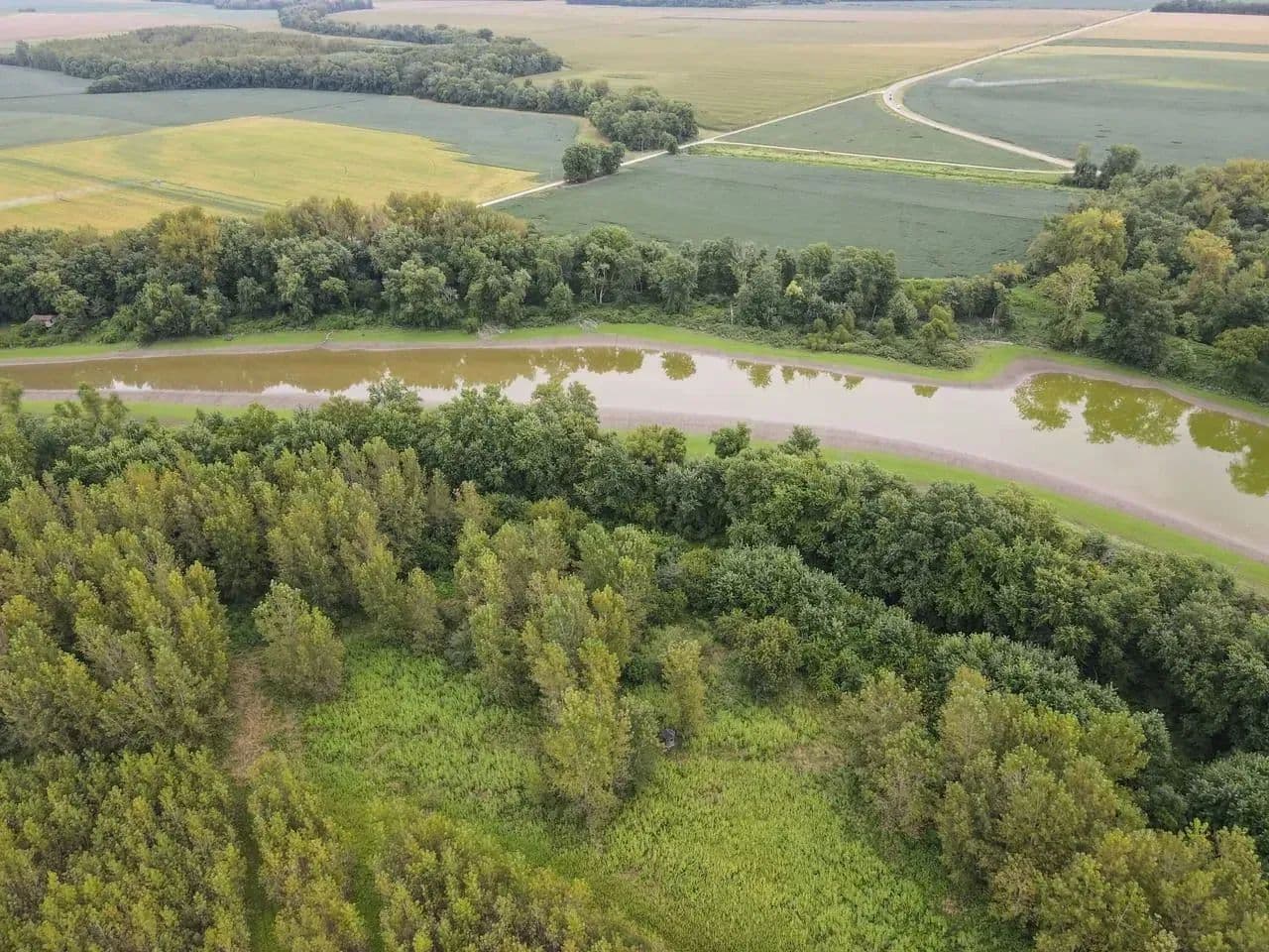 Expansive Slough and Boundaries: The old river channel forms a large slough, defining the property’s eastern and southern boundaries and providing excellent waterfowl habitat.