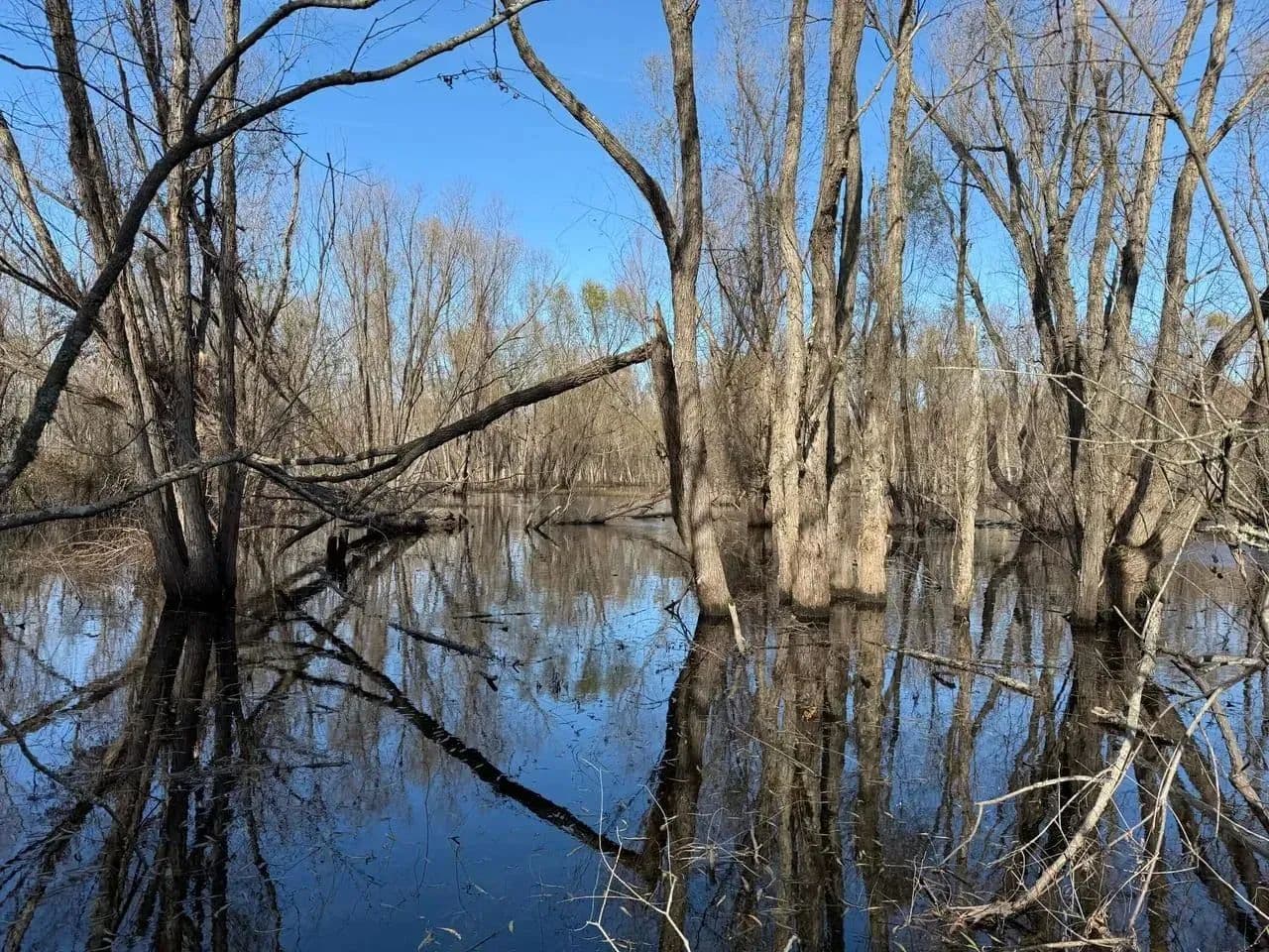 Moist-Soil Area (Northern End): This area holds water during wetter seasons and is covered with native grasses and moist-soil plants, creating a habitat rich in biodiversity.