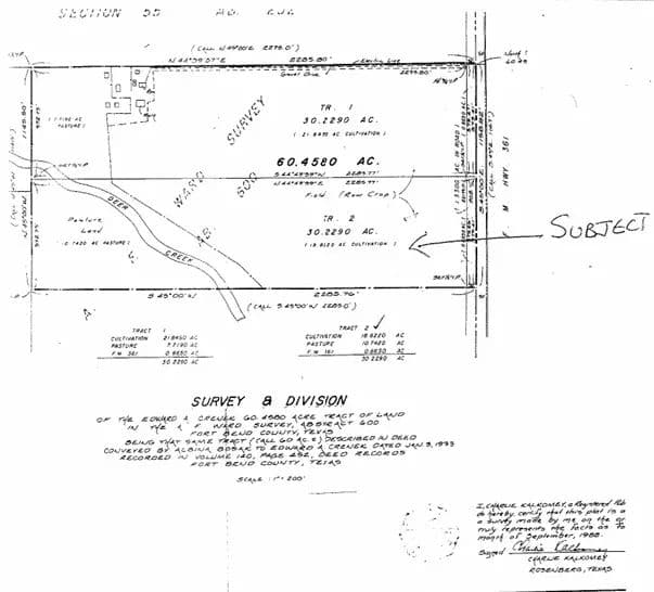 Prime Investment Opportunity in Fort Bend County, between Long Point and Fairchilds. Partial fence and current use is Farmland. Property Highlights: The area is experiencing significant growth with numerous developments relatively close by due to the potential future enhancement from the proposed continuation of Fort Bend Parkway and The Grand Parkway (SH 99) through Fort Bend County. With the ongoing and planned development in the area, this property could hold substantial promise for investors looking to capitalize on the region’s growth. There are two short term verbal surface leases in place, one for cotton and one for cattle grazing. Deer Creek runs through the back half of the property, thus a small portion of flood plain is present around that Creek. Invest in a piece of Fort Bend County’s promising future. Whether you’re considering residential development, farming, or simply a serene escape, this 30.229-acre parcel offers endless possibilities. Don't miss out on this fantastic opportunity! May carry a Needville address, TBD.