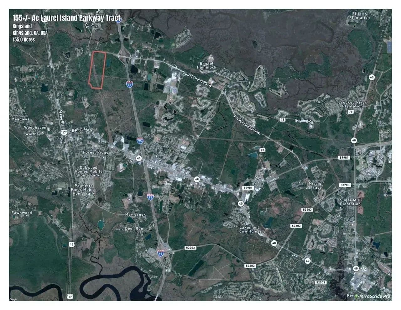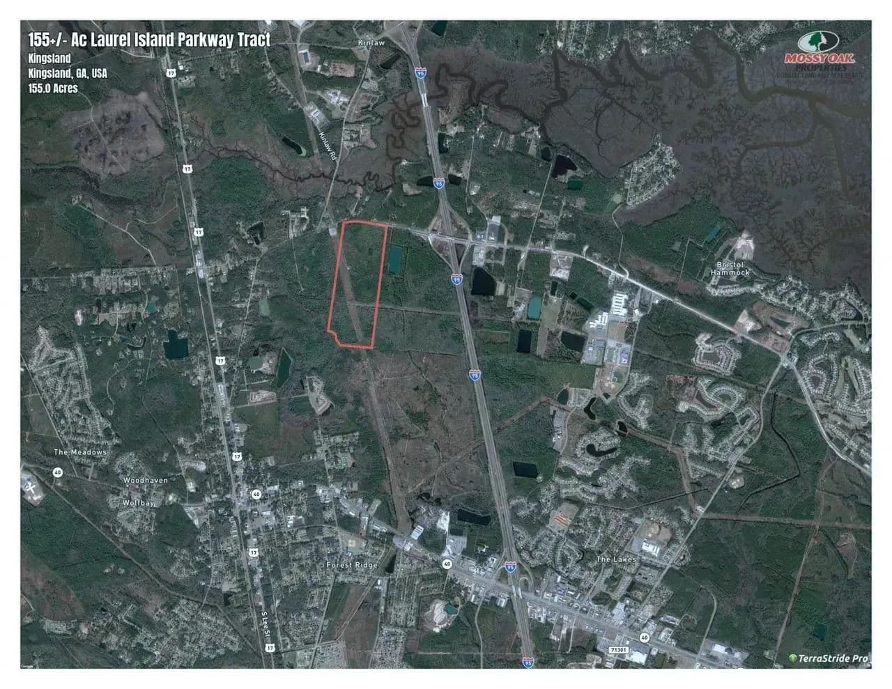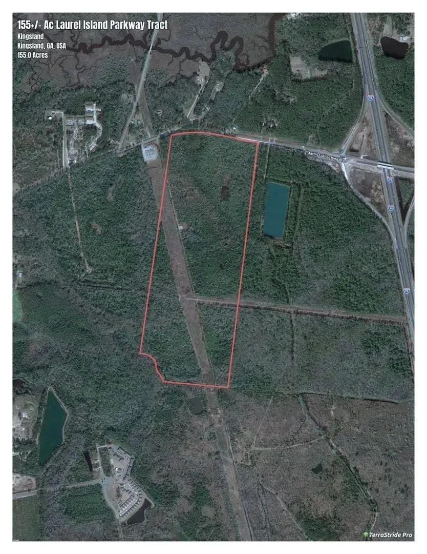 155+/- Ac Development Tract located in Kingsland, GA just of I-95 on Laure Island Parkway. The property is currently zoned A-F in Camden County, but is surrounded by the City of Kingsland allowing for easy annexaction. The City of Kingsland is developer friendly and ready for growth. The property can be zoned for Interstate Commercial, Industrial,RV Development, Multi-Family or Residential. The immediate proximity to the I-95 Interchange at Exit 6 allows for a variety of uses. There is a new Lift Station on the property as well as an Adjacent GA Power Substation for ample power supply. Close proxcimity to the expanding Kings Bay Naval Base gives a great demand for all sectors of development.