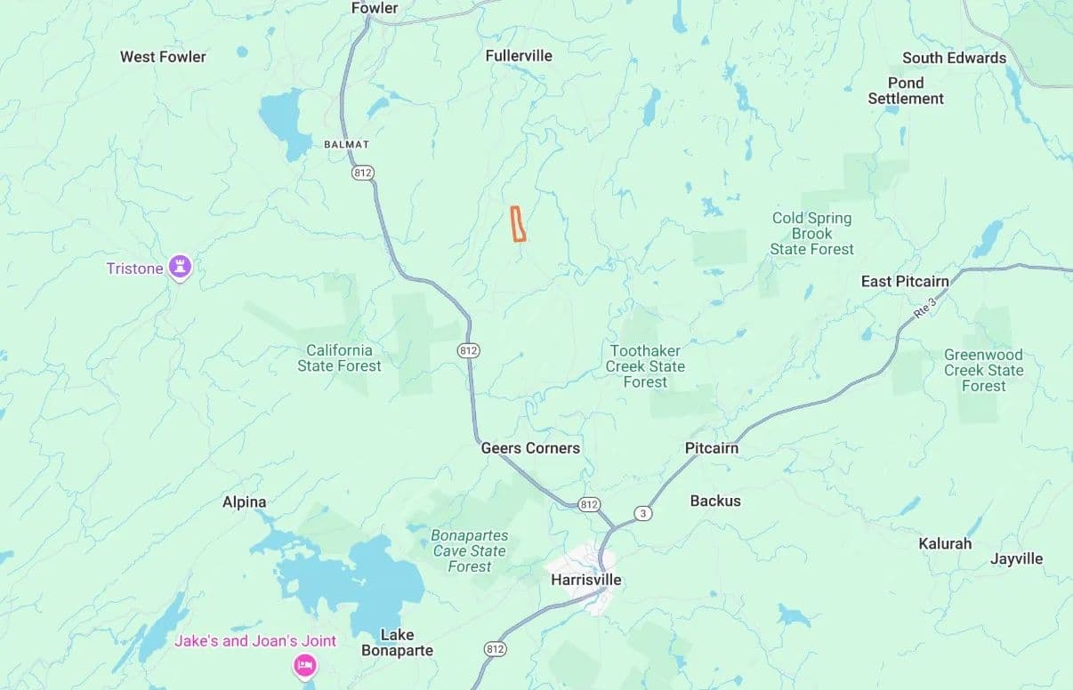 Located in the town of Pitcairn St. Lawrence County. This 38-acre lot sits in a remote location and is easily accessed by a year-round, town-maintained gravel road. There is 2690 feet of road frontage and power lines run along the whole road front. It offers a few choice settings for a country home or a cabin in the woods. Suppose it’s outdoor recreation that you are looking for. In that case, the surrounding area offers an abundance of opportunities with thousands of acres of State Forest lands within a short drive in any direction.