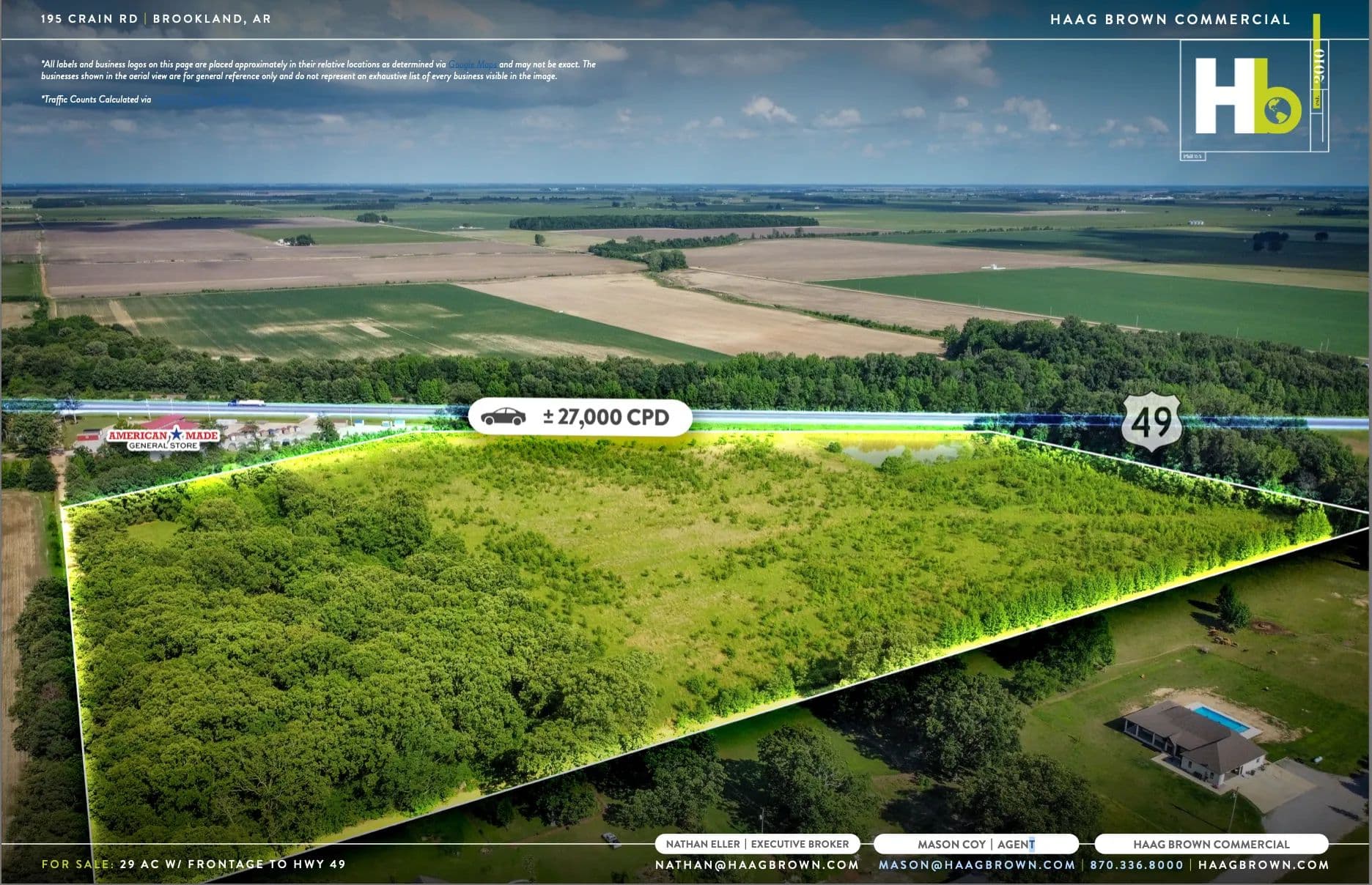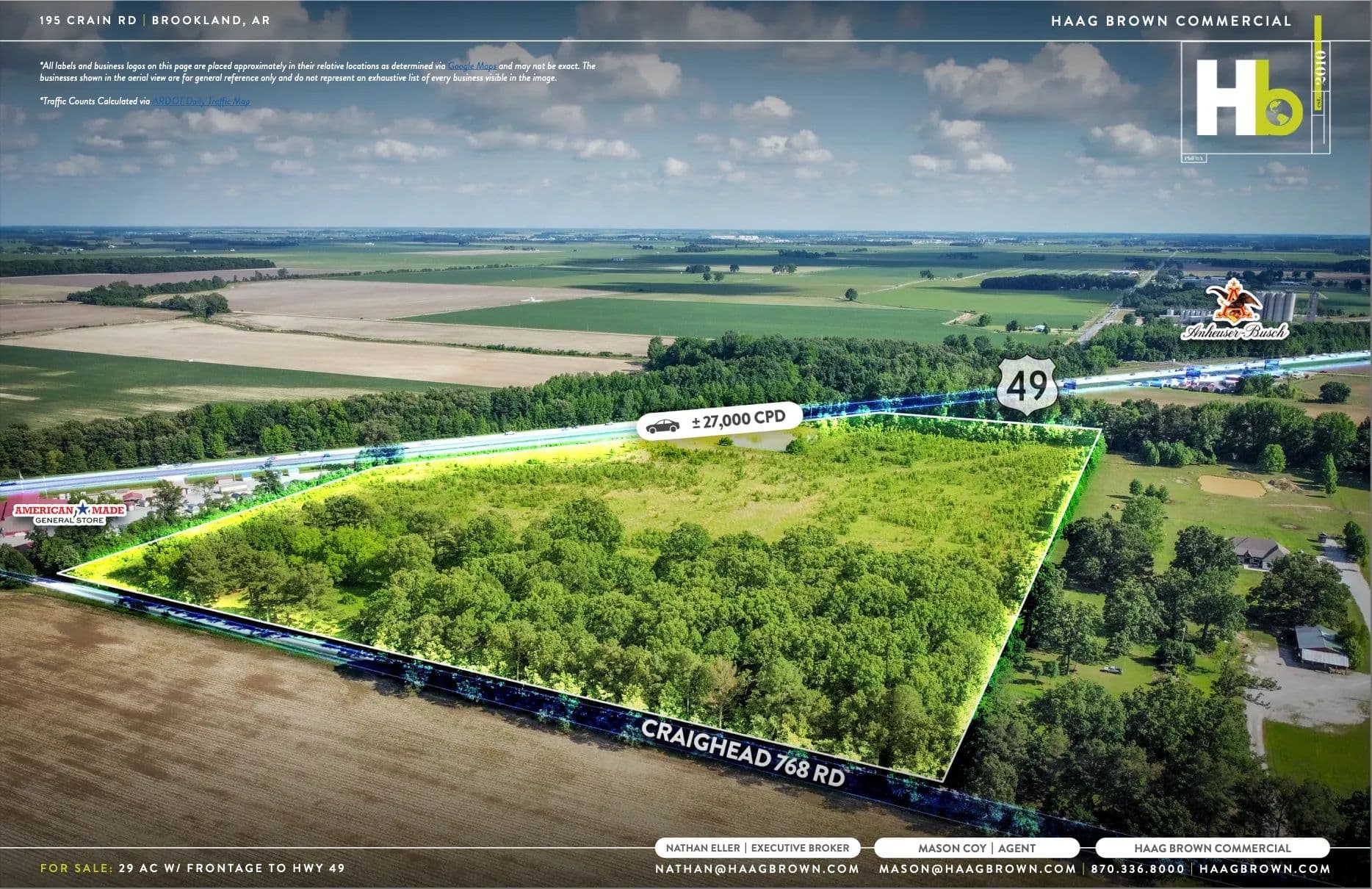 Brookland is situated directly in between Jonesboro and Paragould and is one of the fast growing cities in Arkansas, with it's population doubling in the past 4 years alone. The school systems has evolved into one of the fastest growing schools in Arkansas. This 29 acre tract is primed for development featuring over 770 linear feet of frontage on Highway 49. Highway 49 carries over 27,000 cars per day, giving this tract prime exposure.