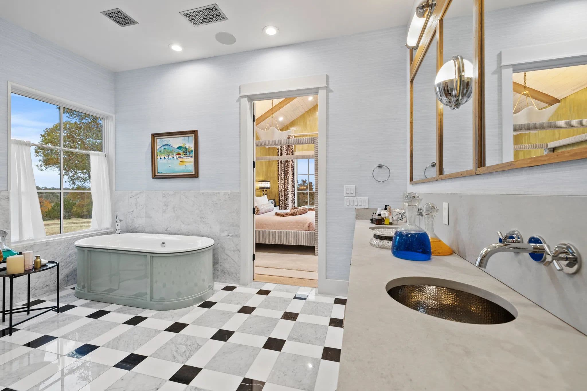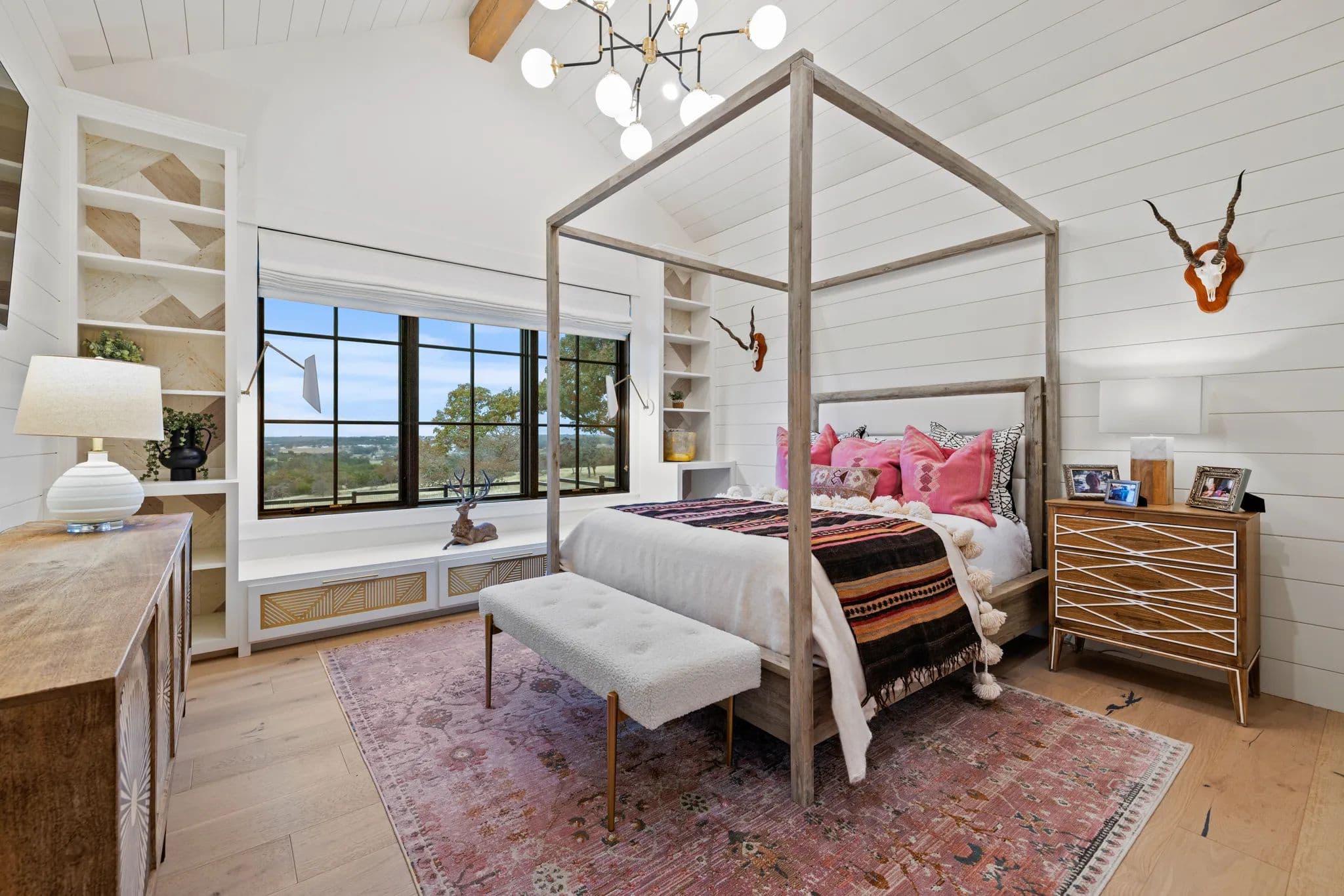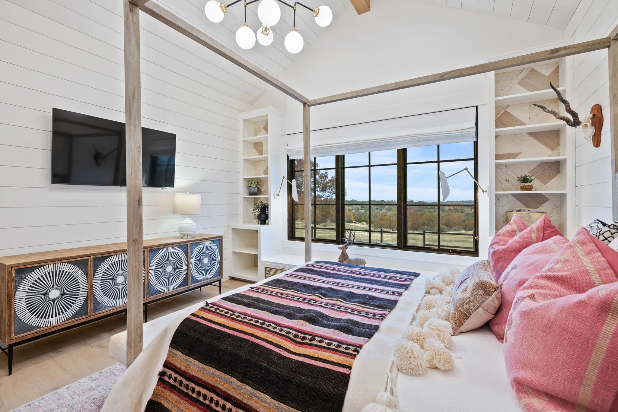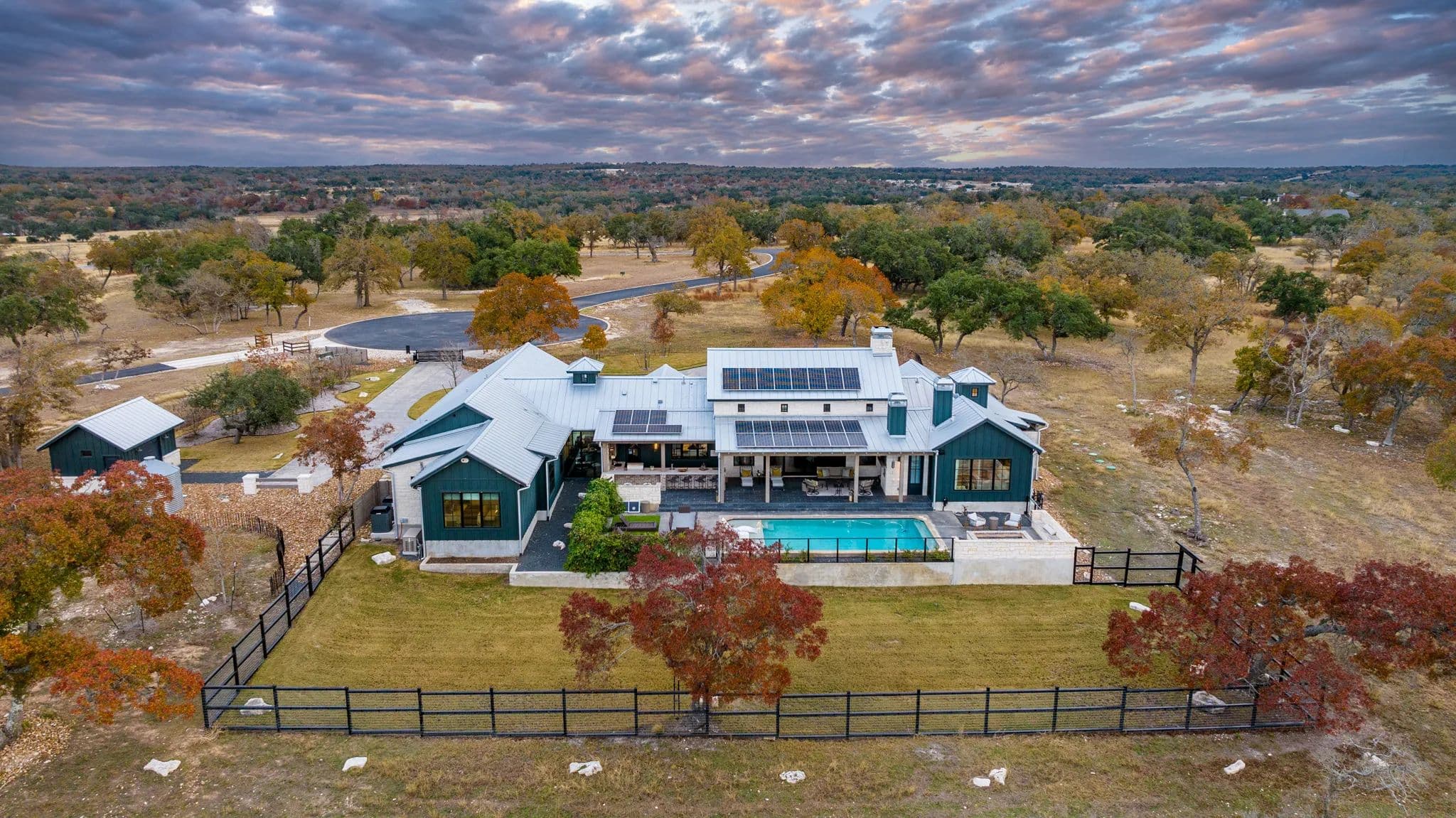 This luxurious home, located in Hidden Springs, Fredericksburg was designed by and featured on the cover of HOUSE BEAUTIFUL, Oct 2021. This 4BR 4.5BA, 3,923 SQ Ft home sits on 10 acres in Gillespie and Kendall counties with outstanding with long distant views to the South looking down toward the ranch below. Trees and vegetation offer beautiful colors and privacy..