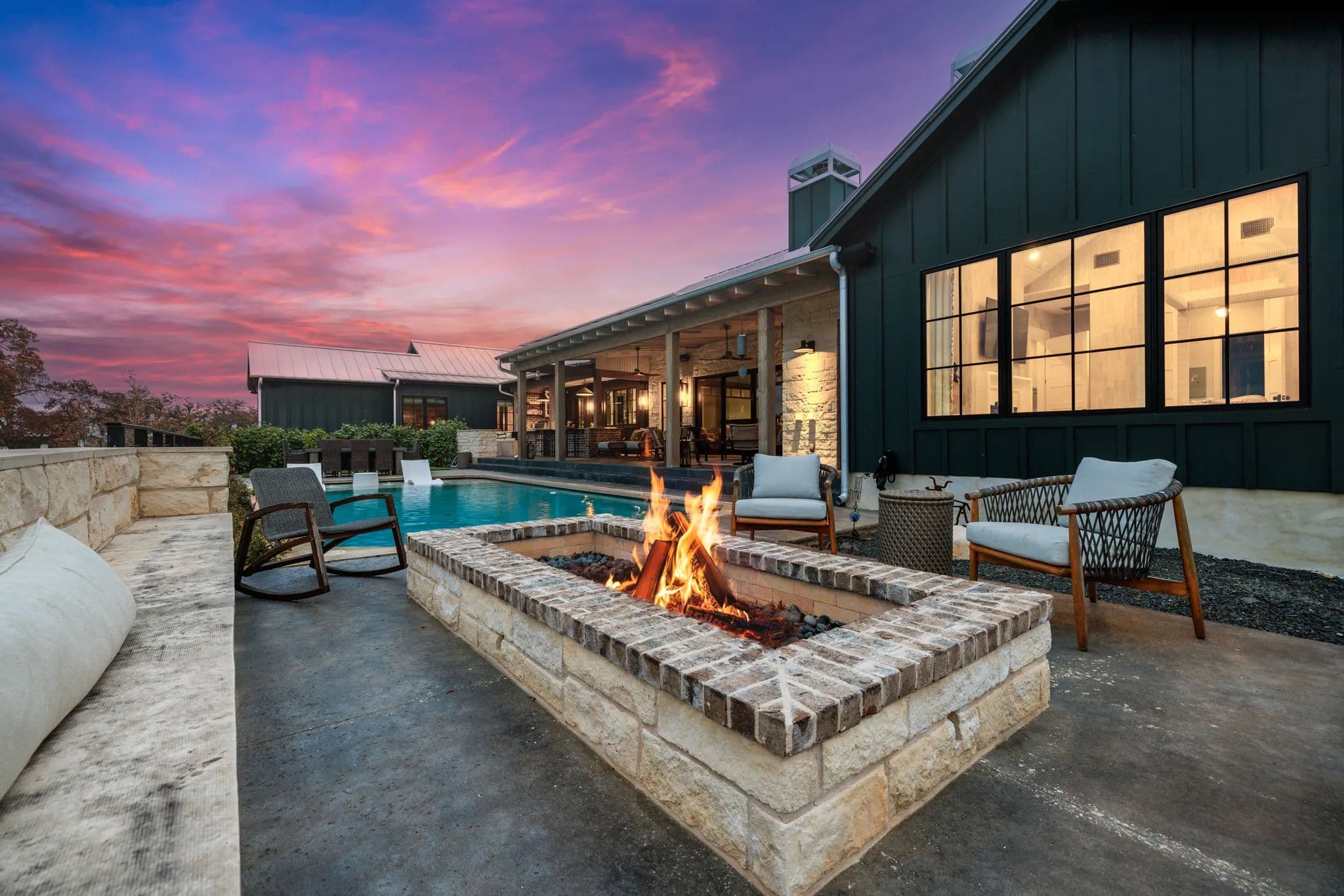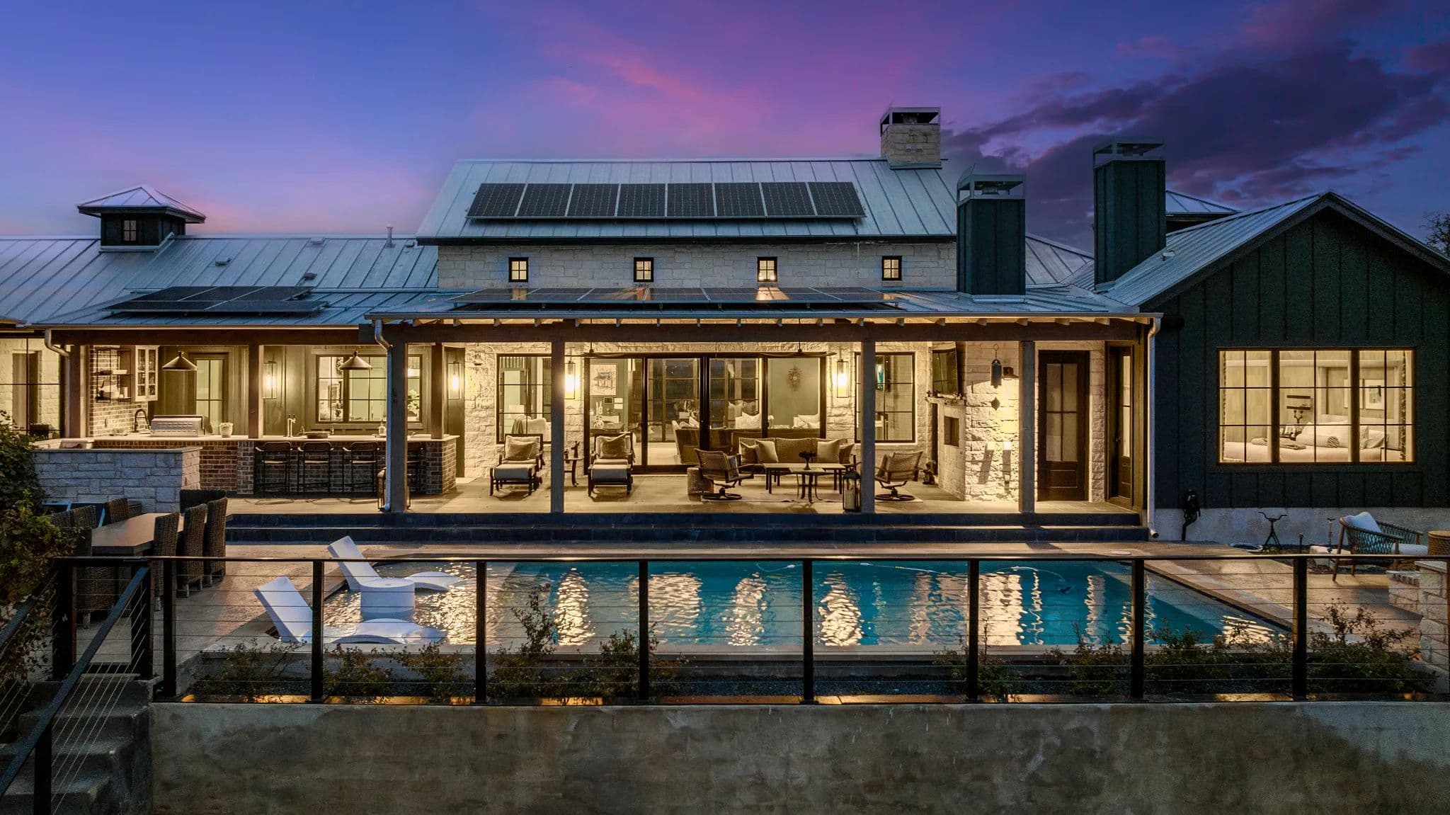 Outside, there is a covered living area with an outdoor kitchen, 2 sinks, a Renaissance Cooking system, 2 cold drawers, 2 beer taps, 2 wine fridges, a fireplace, TV, and leathered quartz countertops. The outdoor space also includes a fire pit, pool, table, chairs, and many great extras. Solar panels are in place and the large 3-car garage includes a water softener and 2 extra large batteries for solar panel back-up. There is a 20KW generator and 2-500 gallon propane tanks. Additionally, there is fiber optic cable for high-speed internet.