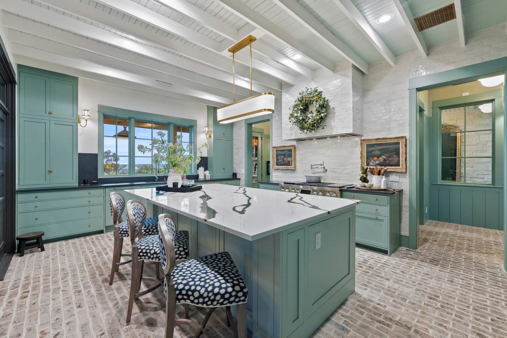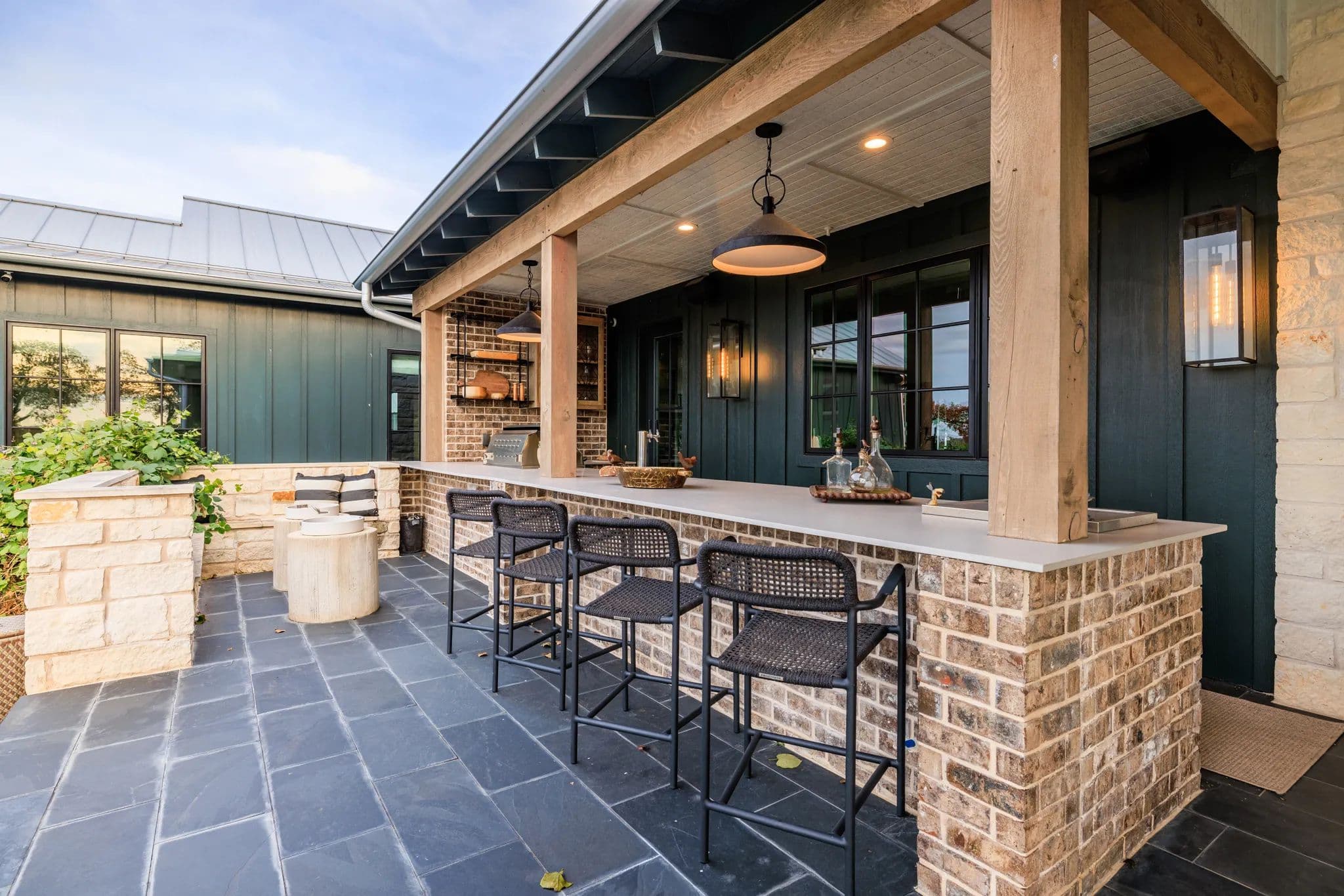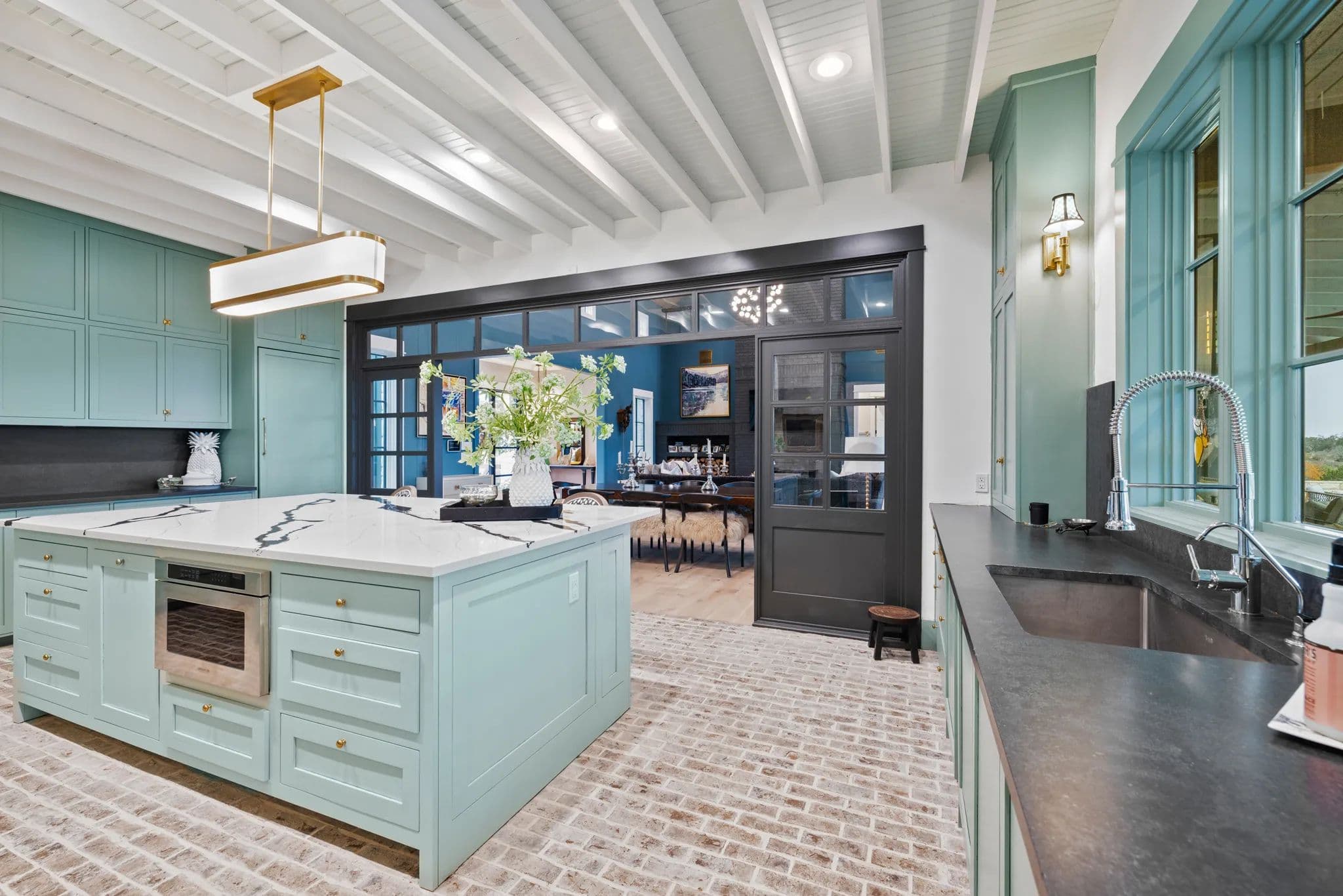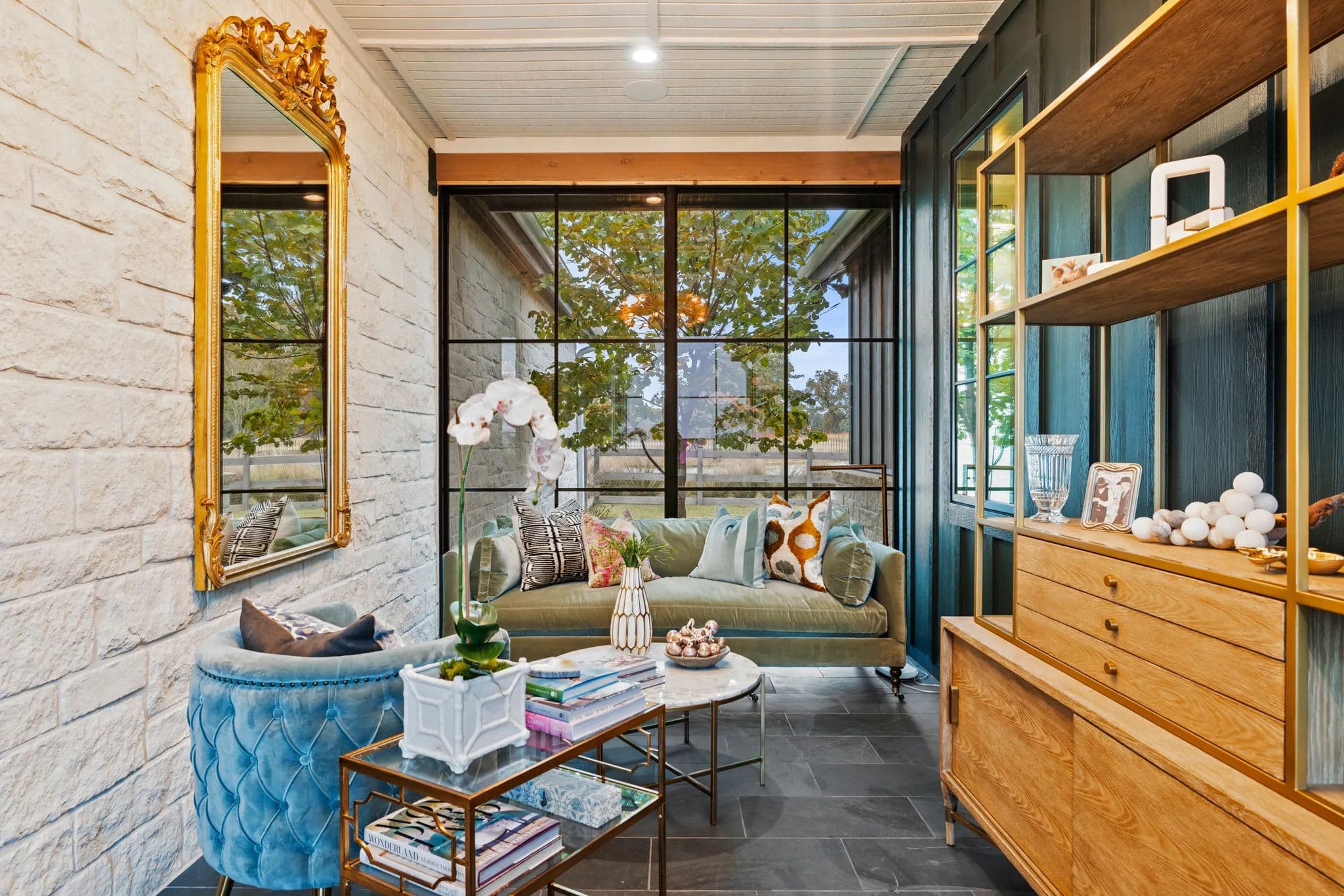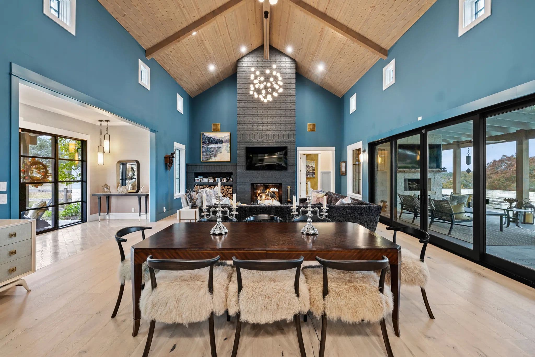 The home also boasts an office breezeway enclosed with heat and A/C, a bar with a third dishwasher, sink, 2 cold drawers, and a large wine fridge, as well as a small comfy den with 2 additional ensuite bedrooms. The living room is a great room with a dining table, sofa, chairs, TV, and a gas fireplace. The powder room is privately located off of the living room with access to the outdoor living area.
