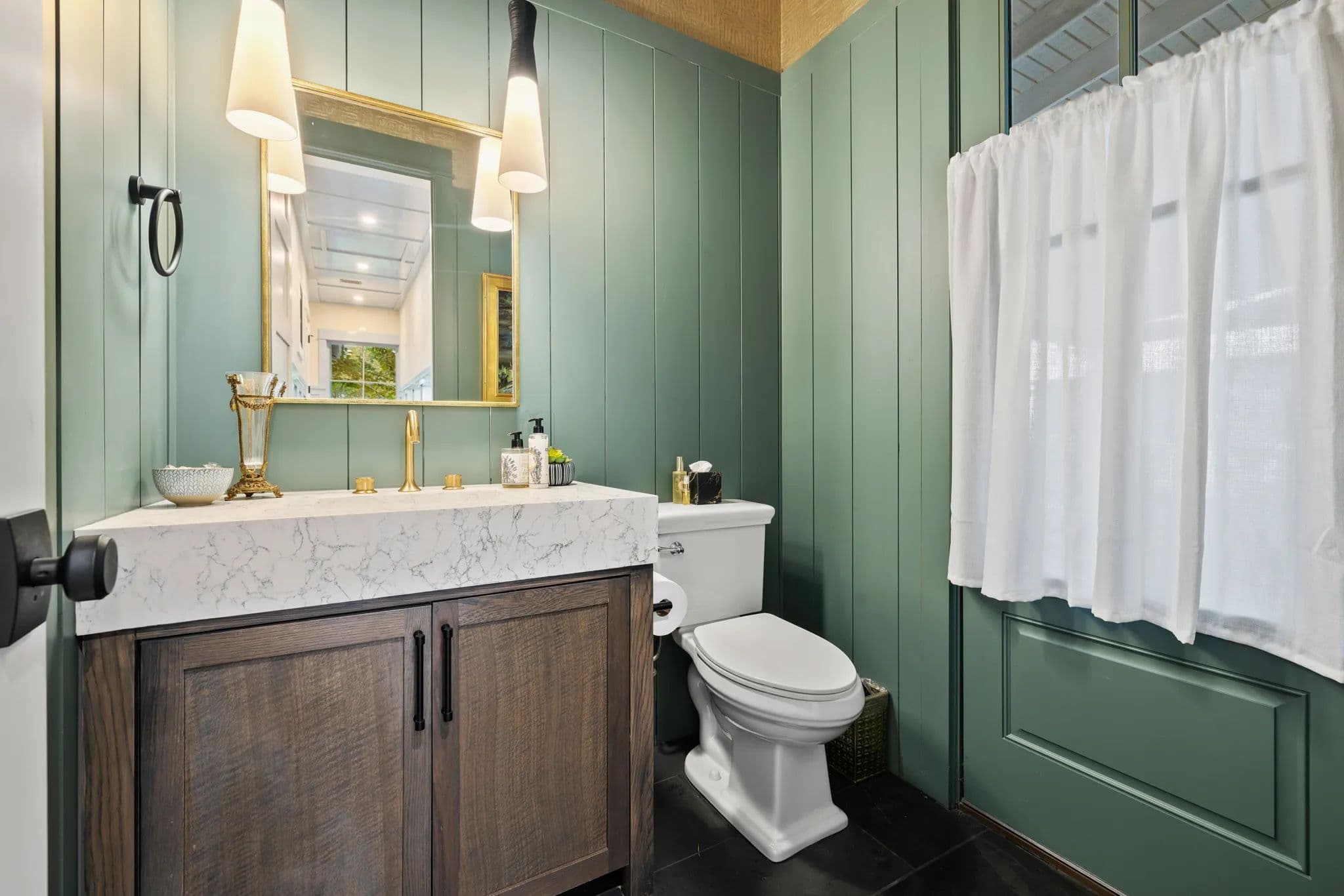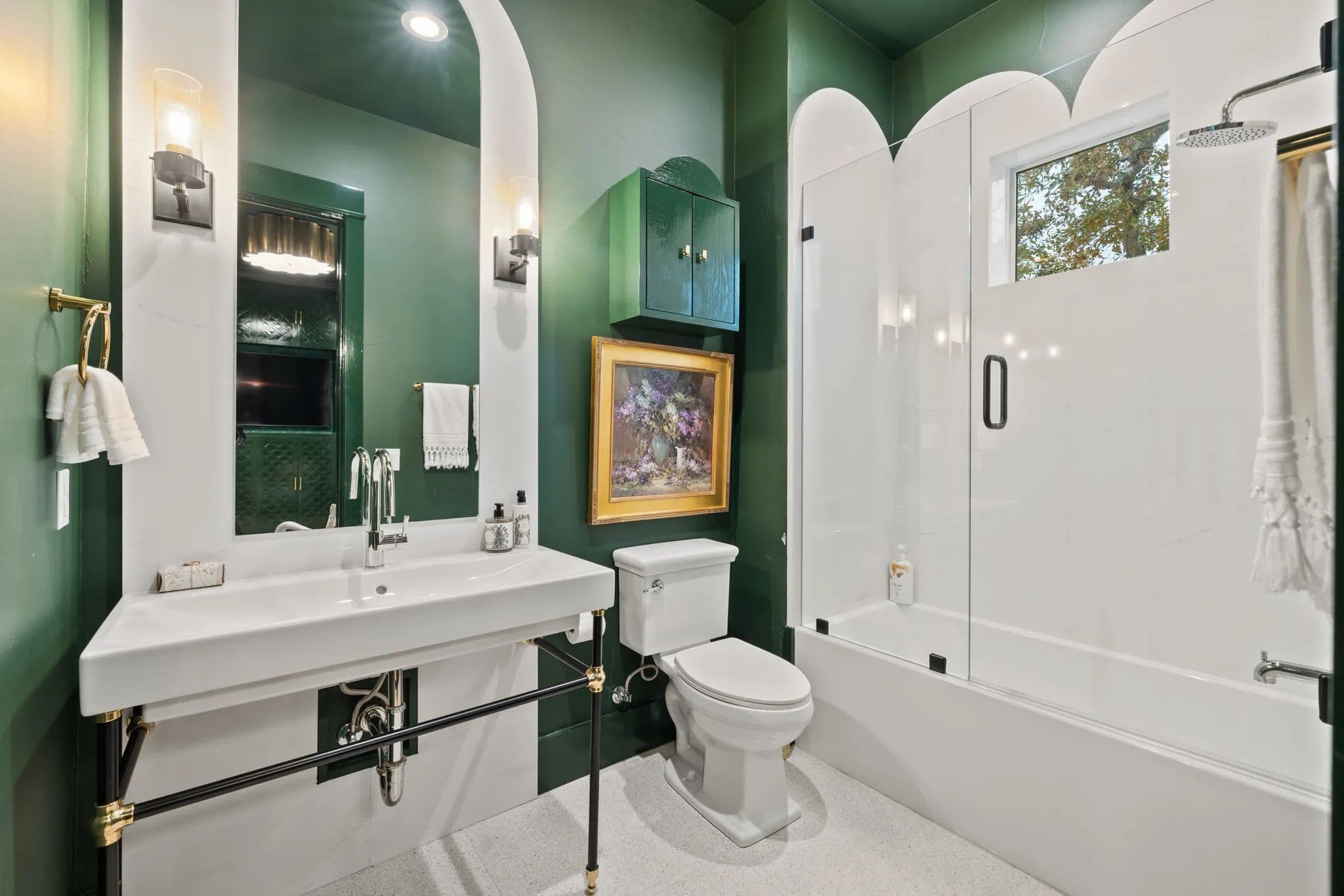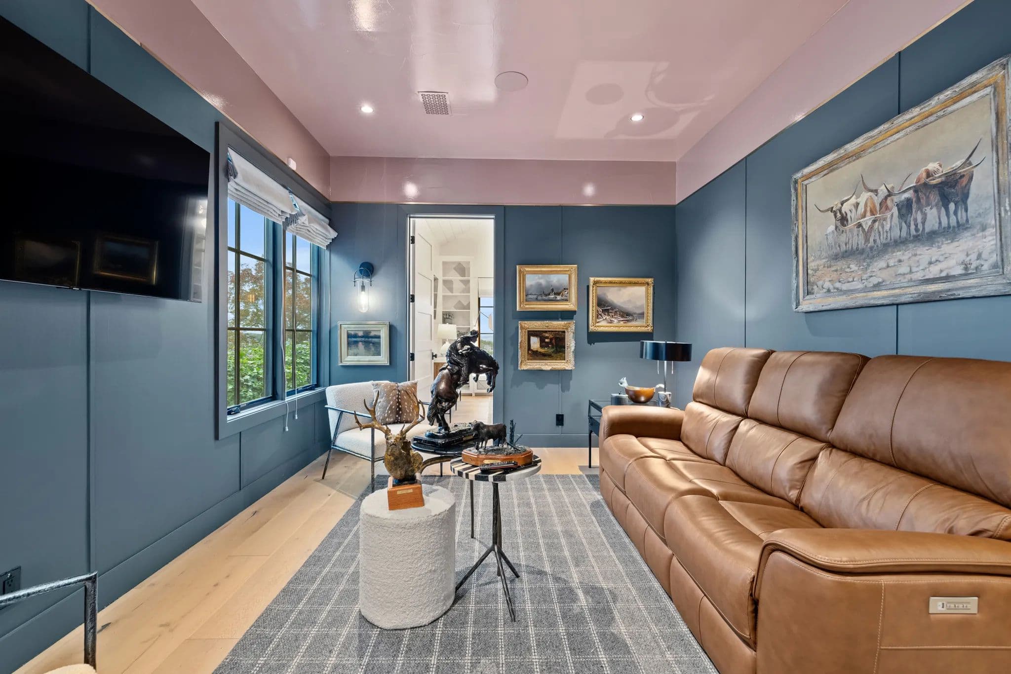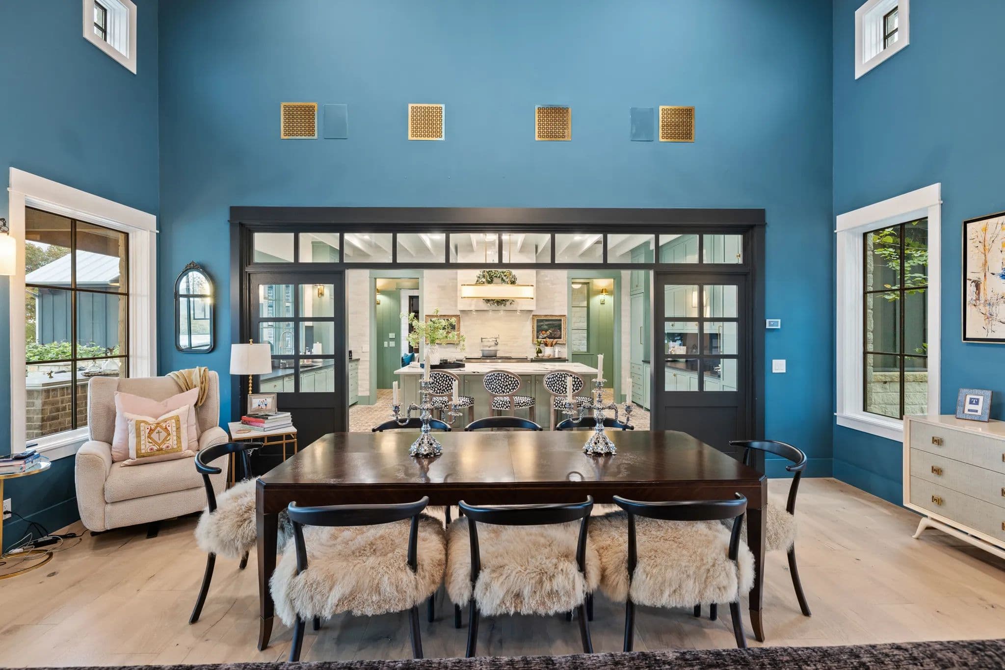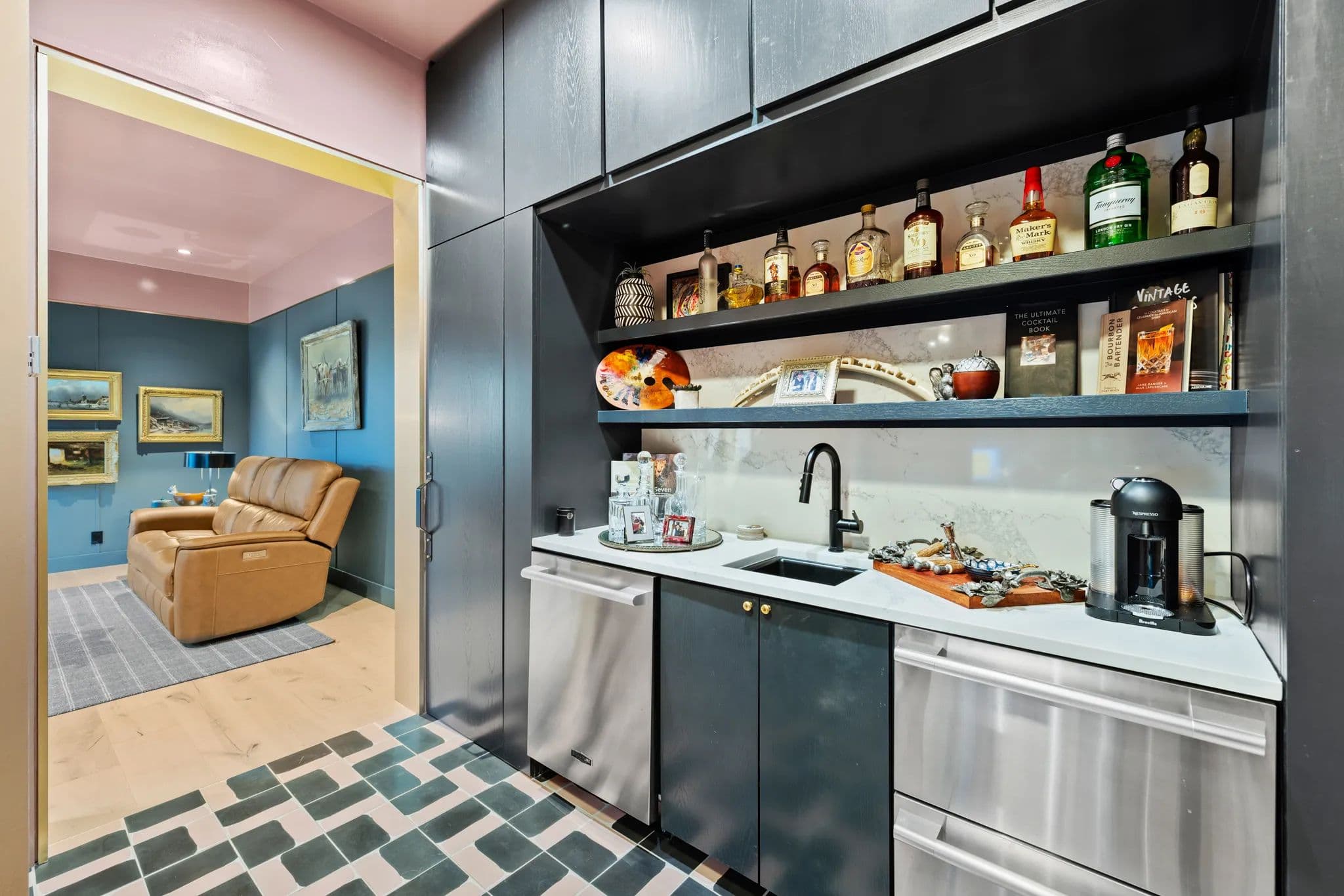The home also boasts an office breezeway enclosed with heat and A/C, a bar with a third dishwasher, sink, 2 cold drawers, and a large wine fridge, as well as a small comfy den with 2 additional ensuite bedrooms. The living room is a great room with a dining table, sofa, chairs, TV, and a gas fireplace. The powder room is privately located off of the living room with access to the outdoor living area.