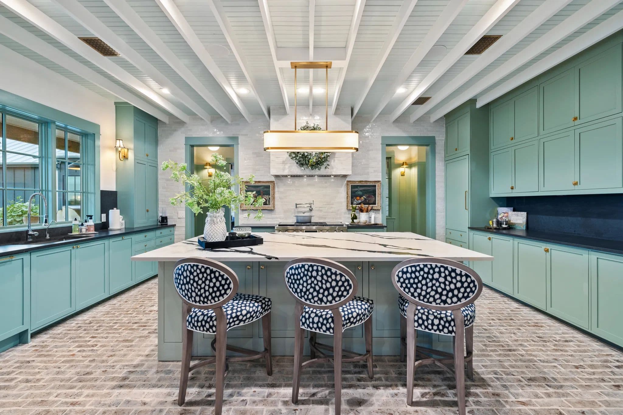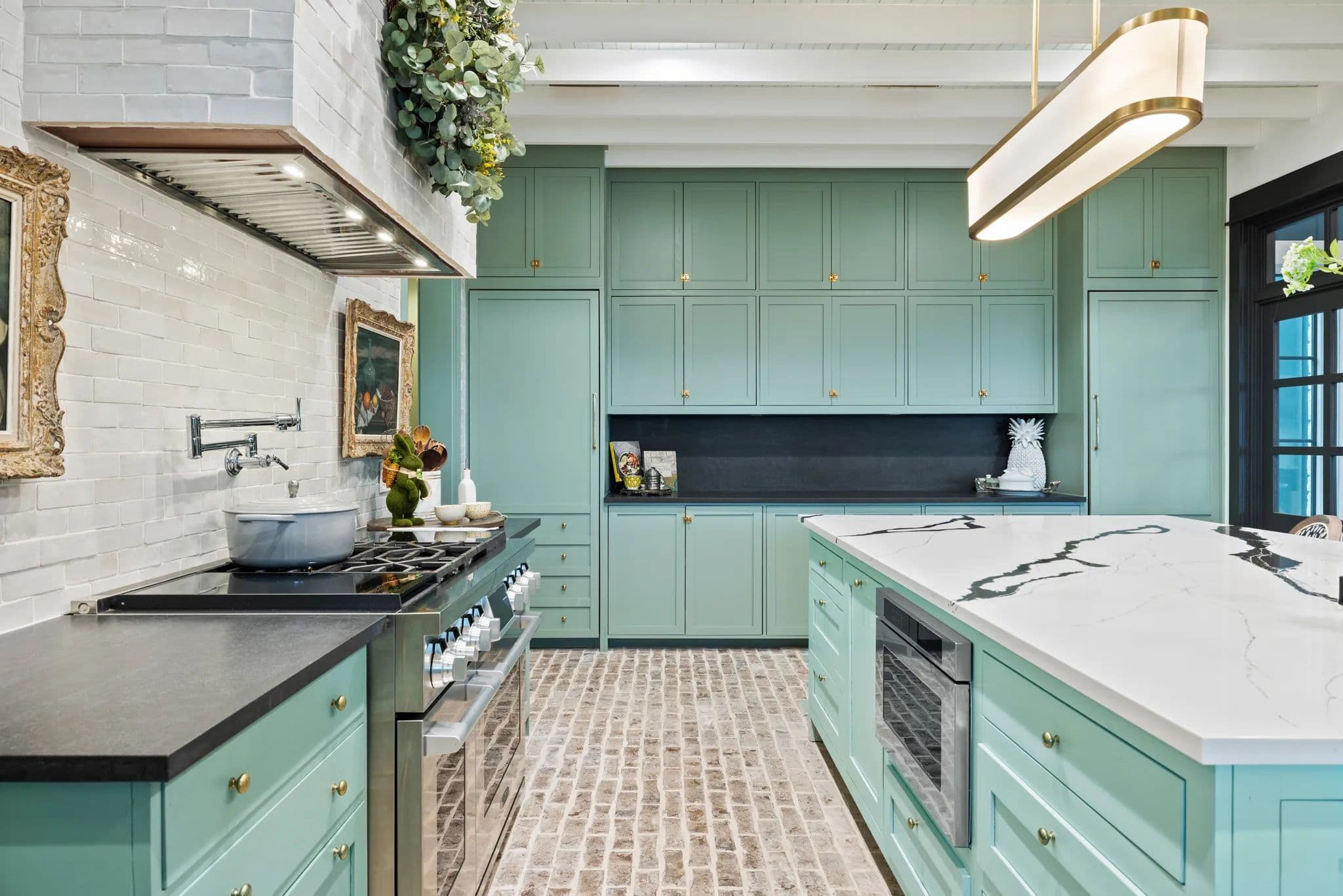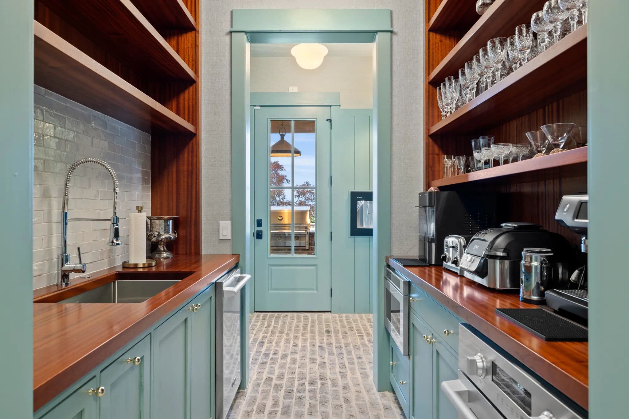 The home's kitchen is equipped with top-of-the-line Samsung Signature Series appliances, including a double oven, microwave, gas stove top with 4 burners, a sous vide, and an induction burner. There is also a separate fridge and freezer, dishwasher, and an extra-large island with quartz countertops. The butler's pantry features a second dishwasher, additional oven and microwave, sink, small wine fridge, and a drinking water dispenser. The laundry room includes a washer/dryer, sink, clothes steamer closet, and a dog bath/shower.