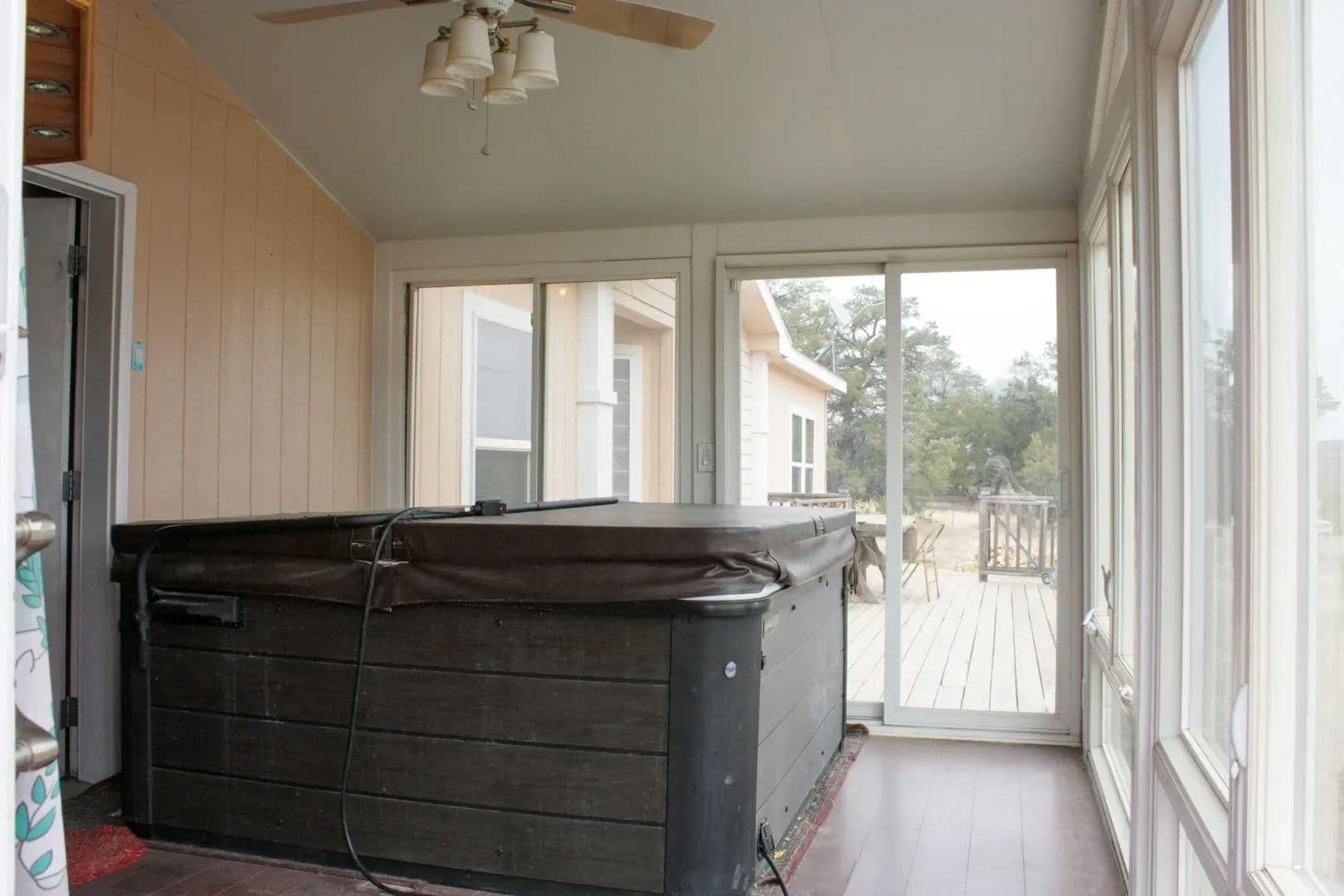 The main house is a 2052 sqft, 3 BR/2BA Clayton Homes custom manufactured home built in 2011. This home has all the amenities, including an indoor hottub and sauna in a sunroom as well as an outdoor sauna on the deck, and a wood-fired outdoor pizza oven. A large kitchen/dining area provides plenty of cabinet space for dishes and food. There are two wood burning fireplaces and two living areas, a large master suite with ensuite bath, and forced air heating.