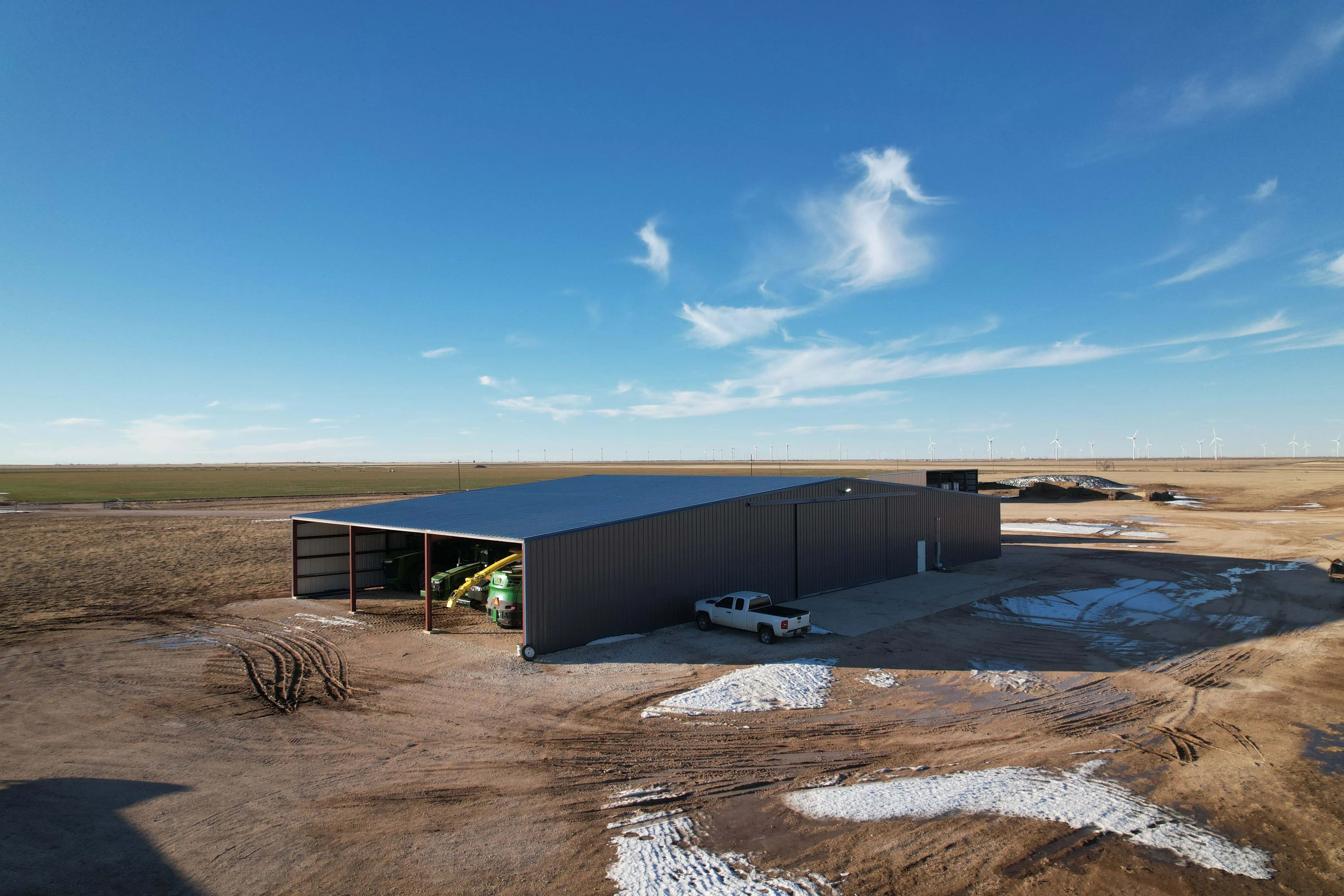 Feedyard/Headquarters: No expenses were spared on this newly constructed feedyard and farm headquarters. The yard offers 2,700’ of concrete bunk and apron with a 5,000 head CAFO permit. All drains and lagoons are in compliance with the permit. A multiple bay commodity barn and heated processing barn are in place, as well as shades in multiple pens.