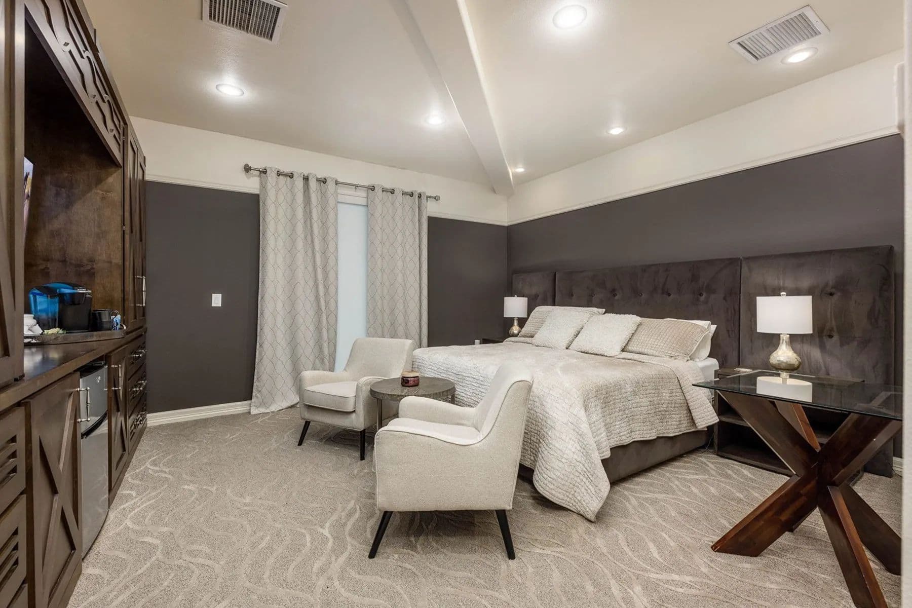 The guest home provides two separate living areas, ideal for family, guests, or rental income. Each unit includes a full kitchen, bathroom, bedroom, living room, and office space, along with a shared laundry area for added convenience.