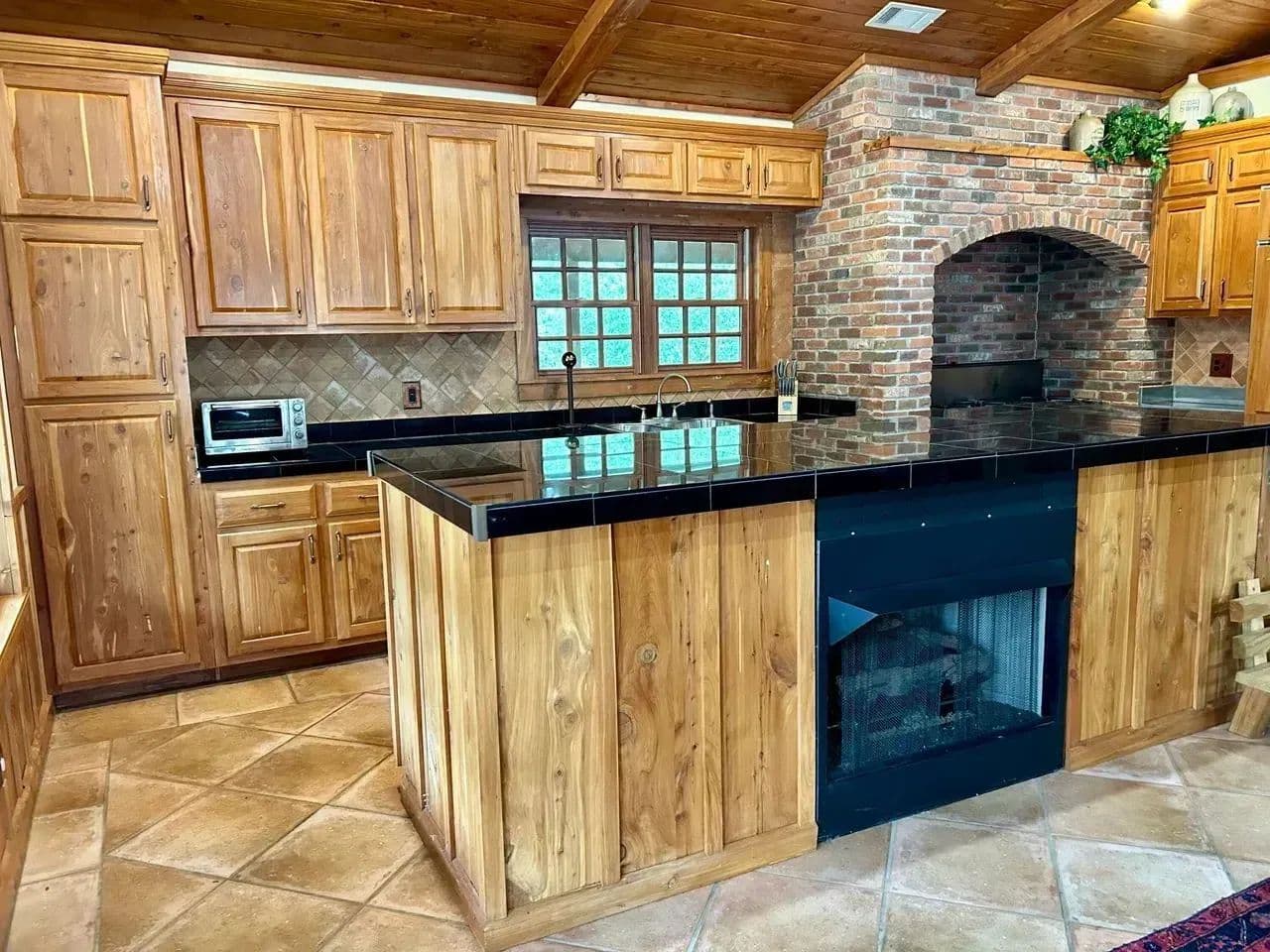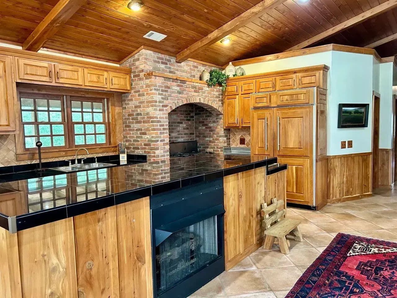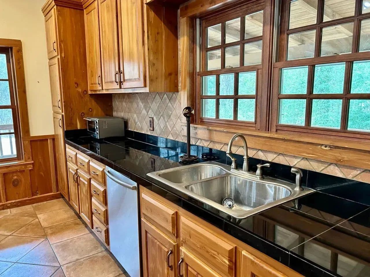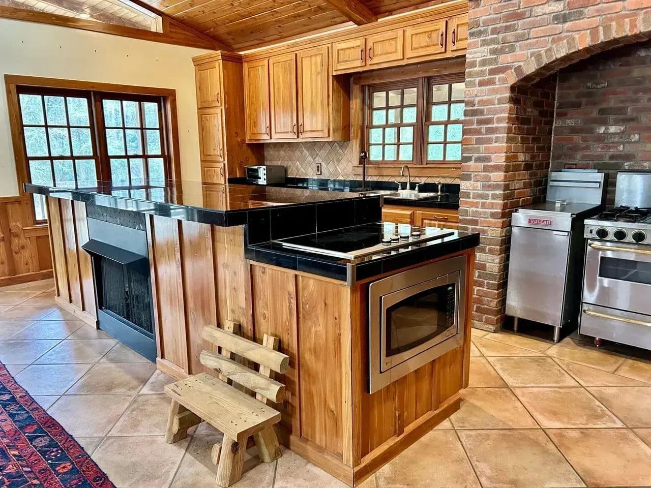 The kitchen area is equipped with a commercial gas stove and deep fryer,ice maker,dishwasher and black granite counter tops. The dining area is spacious and cozy with is own gas fireplace.