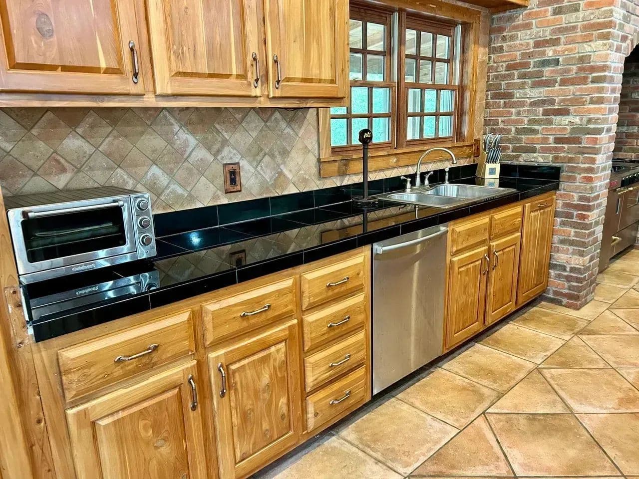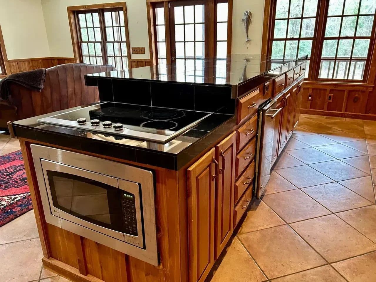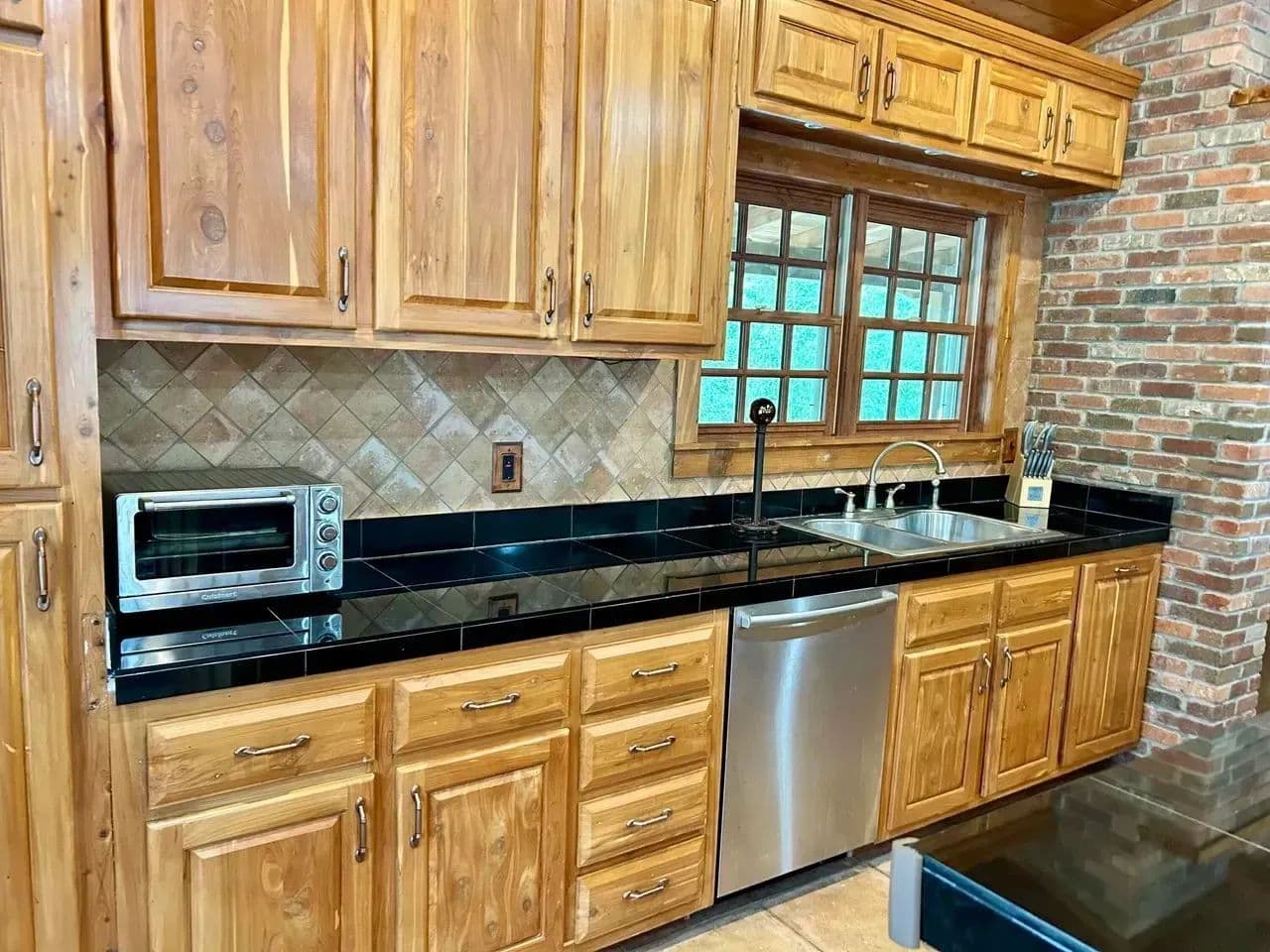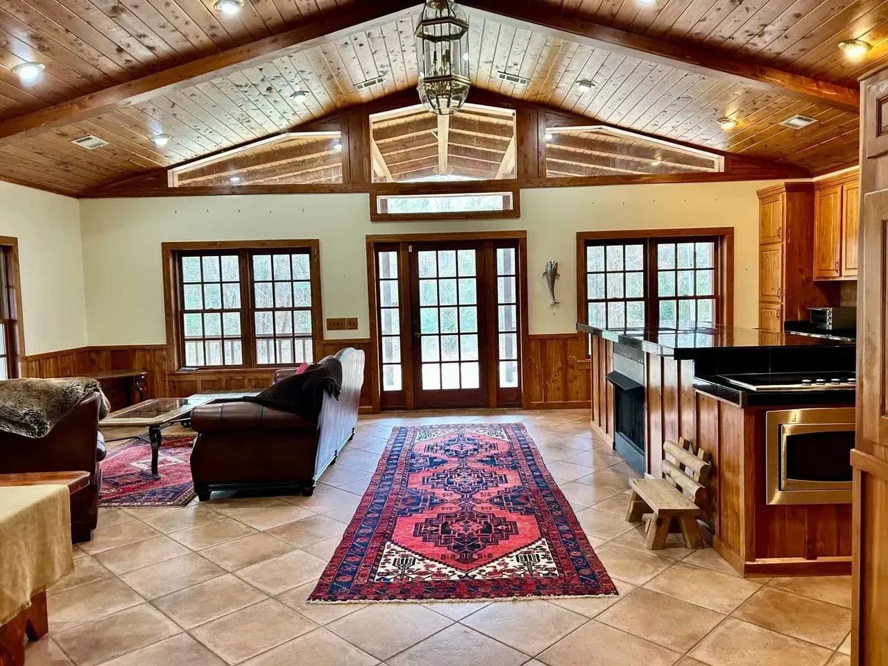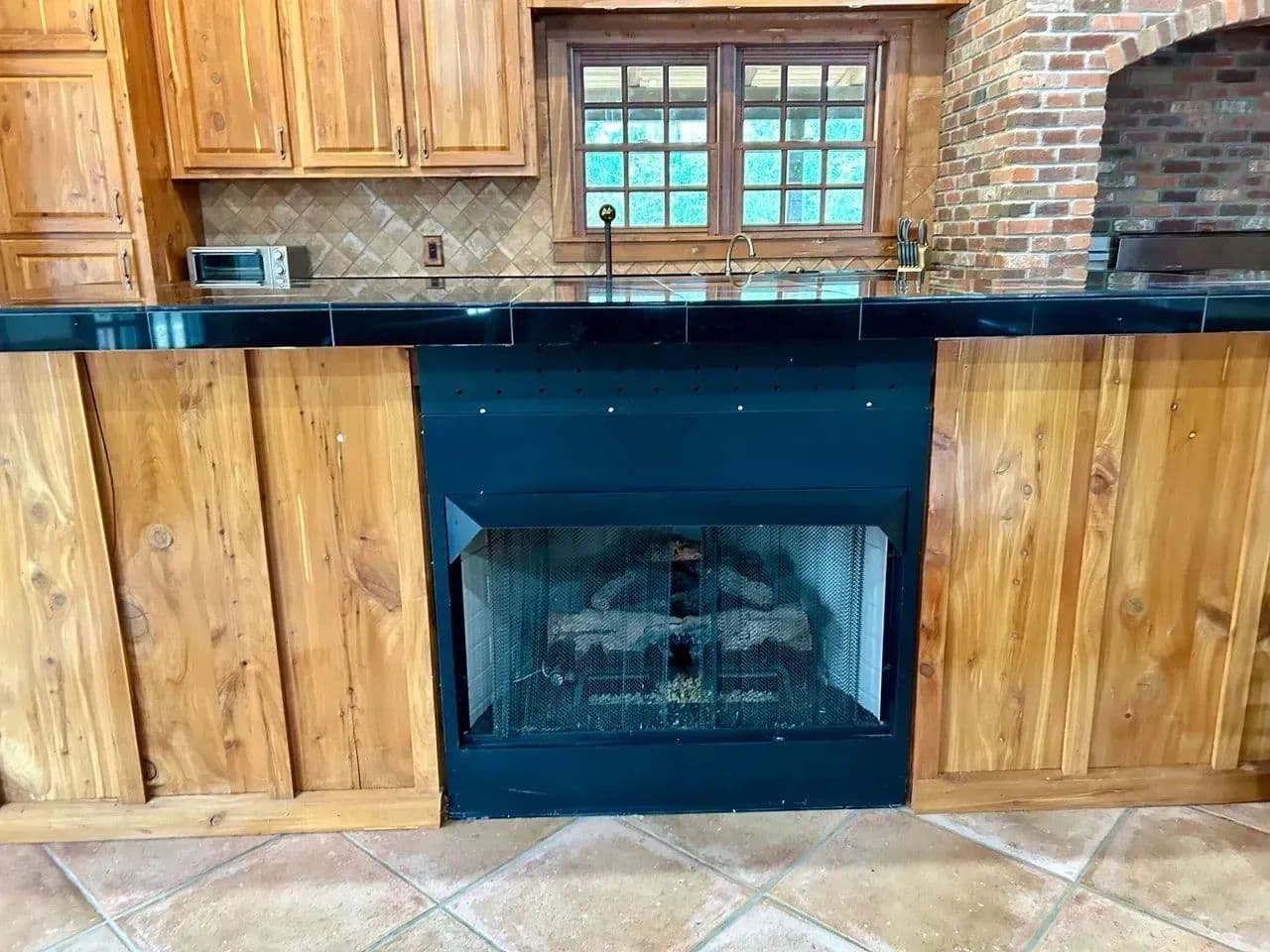 The kitchen area is equipped with a commercial gas stove and deep fryer,ice maker,dishwasher and black granite counter tops. The dining area is spacious and cozy with is own gas fireplace.