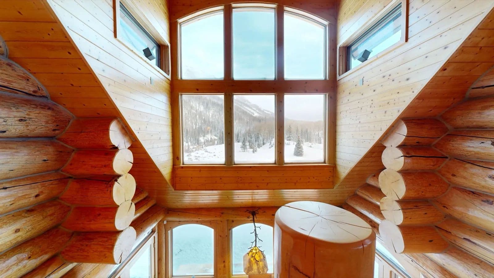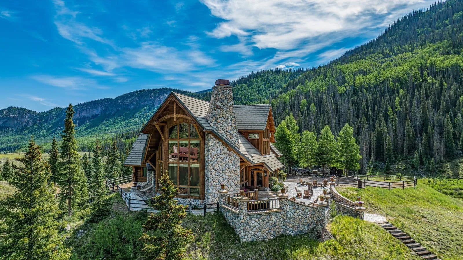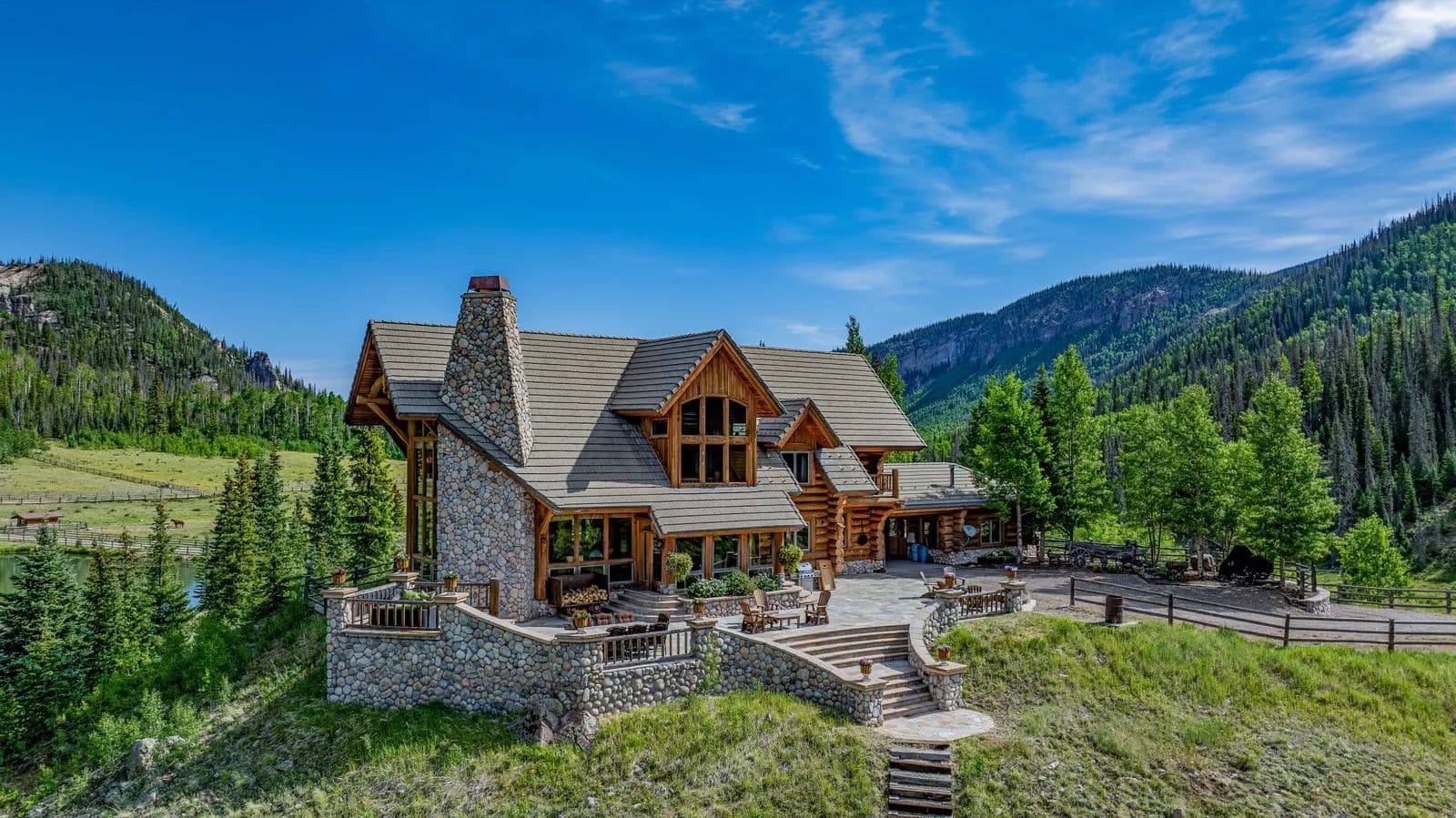 The estate includes multiple well-appointed structures, including an Engelmann Spruce Log Cabin boasting 4,193± square feet of living space with extraordinary high ceilings, a floor-to-ceiling three-story fireplace, and expansive windows showcasing the properties breathtaking views. Additional structures on the ranch include a large barn with a caretaker’s apartment above, a second log cabin, a fully equipped workshop, and a dedicated yoga/exercise room near the main house.