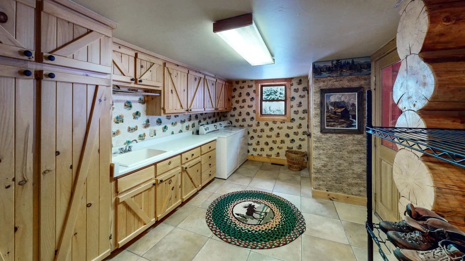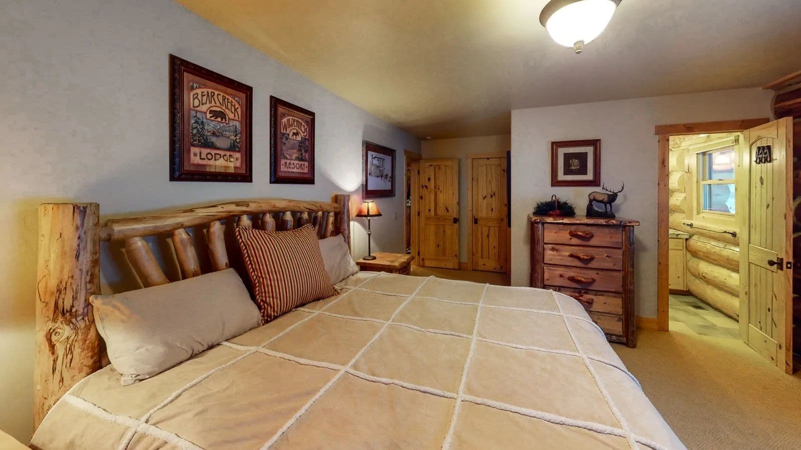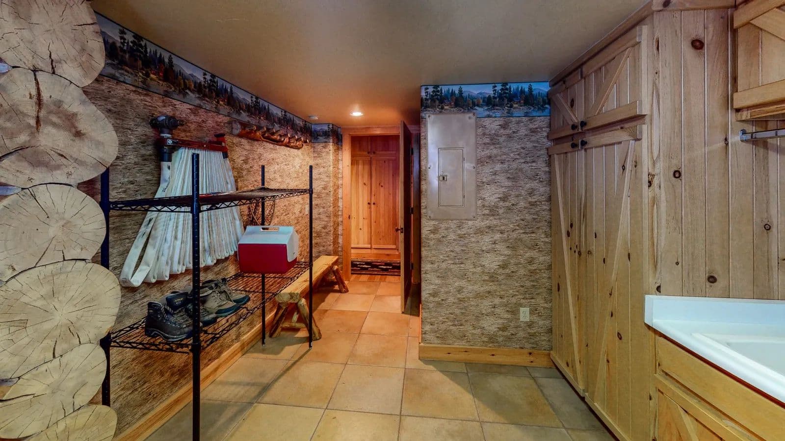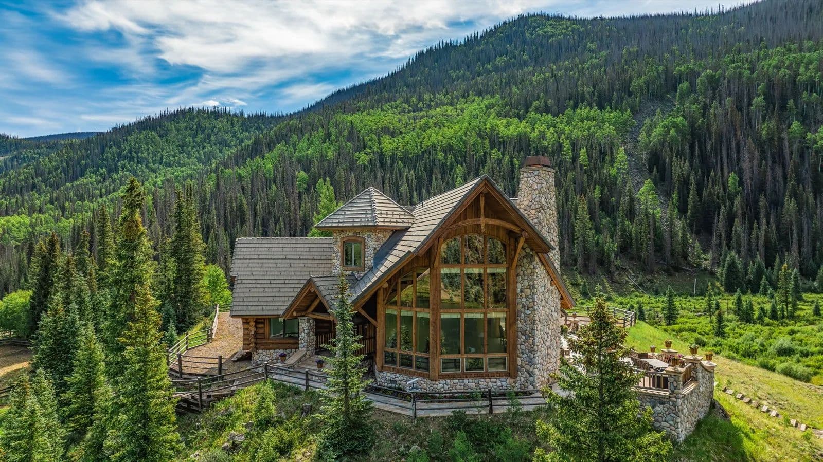 The estate includes multiple well-appointed structures, including an Engelmann Spruce Log Cabin boasting 4,193± square feet of living space with extraordinary high ceilings, a floor-to-ceiling three-story fireplace, and expansive windows showcasing the properties breathtaking views. Additional structures on the ranch include a large barn with a caretaker’s apartment above, a second log cabin, a fully equipped workshop, and a dedicated yoga/exercise room near the main house.