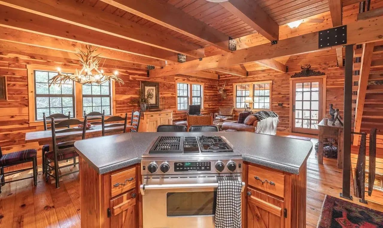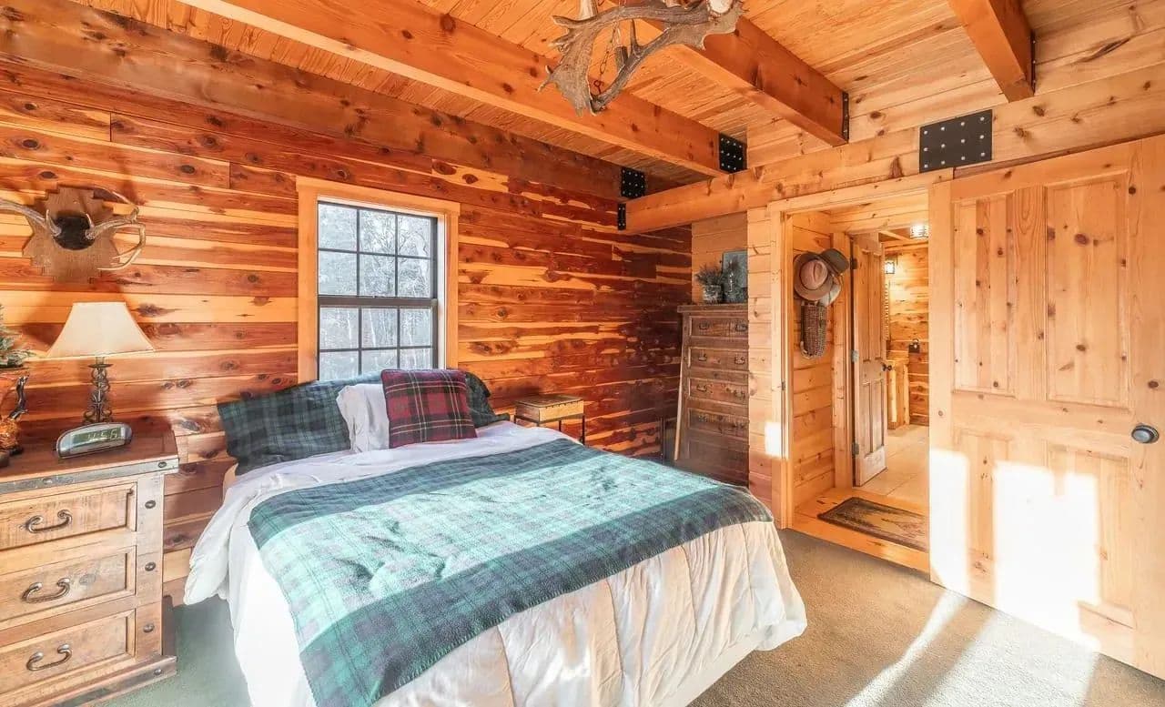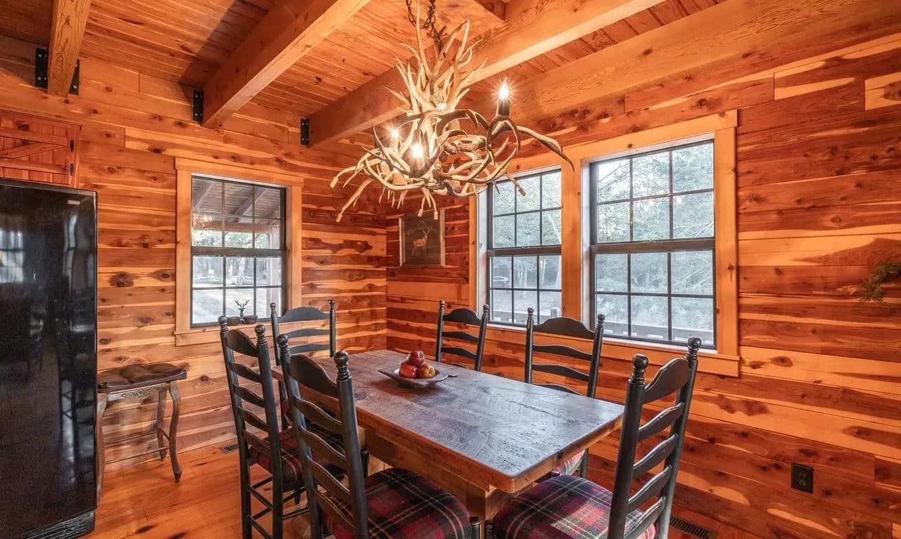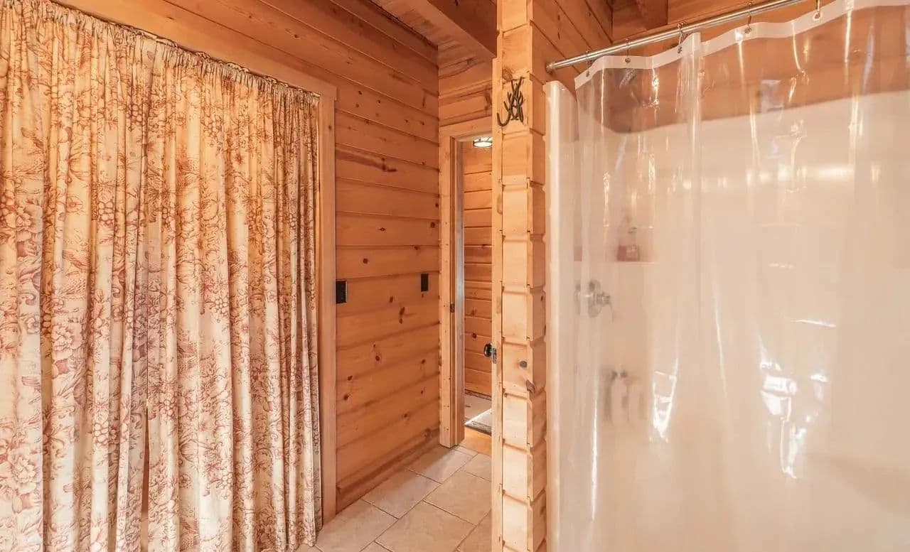 The custom-built cedar lodge spans over 2,100 sq ft and showcases true craftsmanship. With pine floors, custom beams, and elegant black iron railings, every detail of this home has been thoughtfully designed. The spacious layout includes 3 bedrooms and 2 full baths, offering both relaxation and ample space for entertaining.
