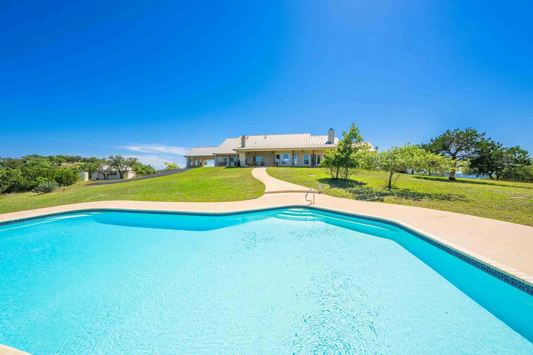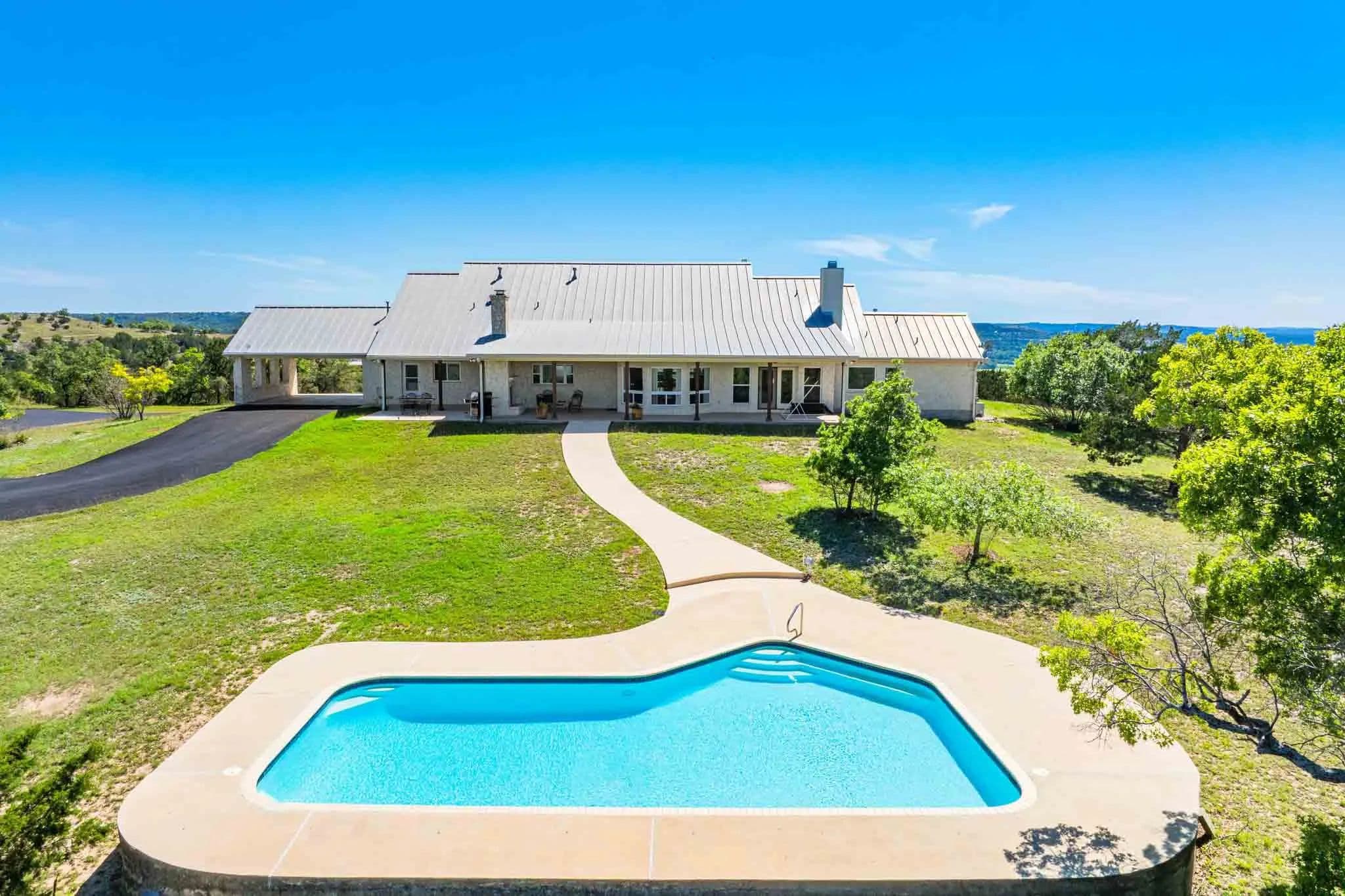 The outdoor space is equally impressive, designed for both entertaining and enjoying the landscape. A large covered back porch features a fireplace and plenty of room for seating, making it the perfect spot to relax and take in the incredible surroundings. A sidewalk leads from the porch to a pristine swimming pool, providing a luxurious oasis overlooking the rolling hills.