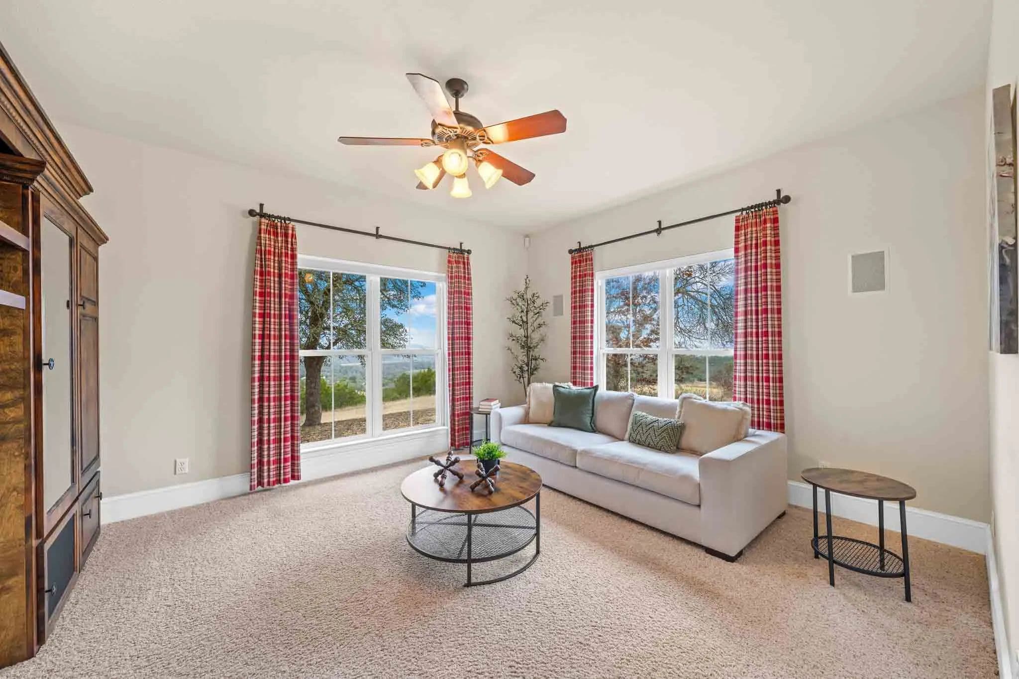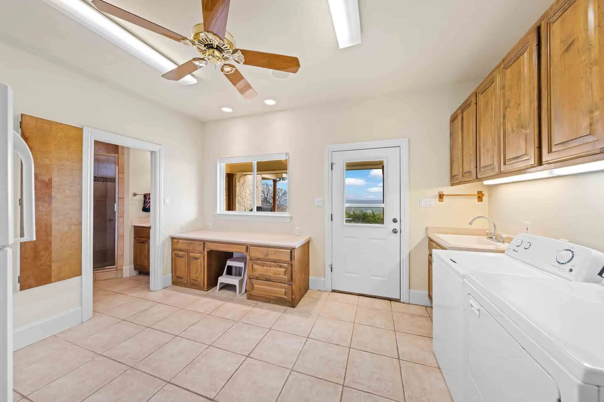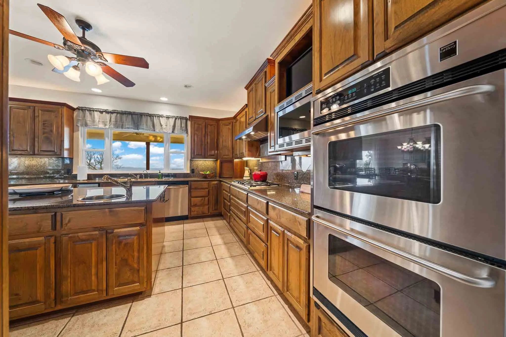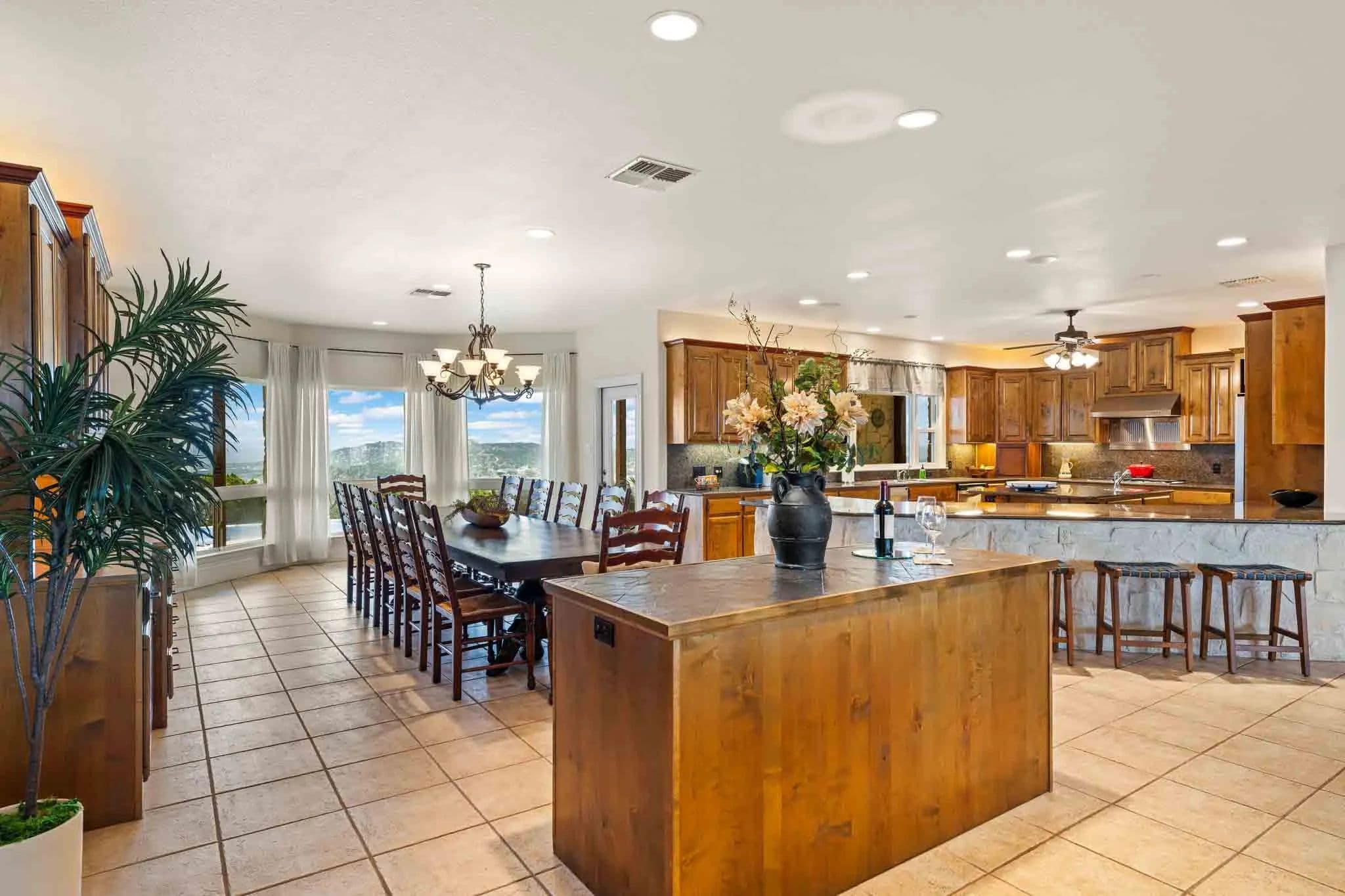 The headquarters of the ranch spans approximately 5± acres and is enclosed by high fencing, creating a private and well-maintained space for daily operations and enjoyment. A paved asphalt driveway leads to the home, which has a convenient porte-cochere for visiting guests. The 4,016± sf custom home is beautifully designed with three bedrooms and three-and-a-half bathrooms, ensuring both comfort and elegance. Inside, the home features vaulted ceilings, a floor-to-ceiling rock fireplace, and expansive windows that showcase the ranch’s unbelievable 360° views. The master suite is a luxurious retreat with a private fireplace, built-in shelving, a large walk-in closet, and an oversized dual spa-like bathroom, while the two additional bedrooms are ideal for guests. The kitchen is well-appointed with custom cabinetry, an island, bar seating, and high-end Frigidaire-Gallery appliances, all positioned to take advantage of natural light and breathtaking views. The home also features an office/media room and a spacious utility room with its own full bathroom.