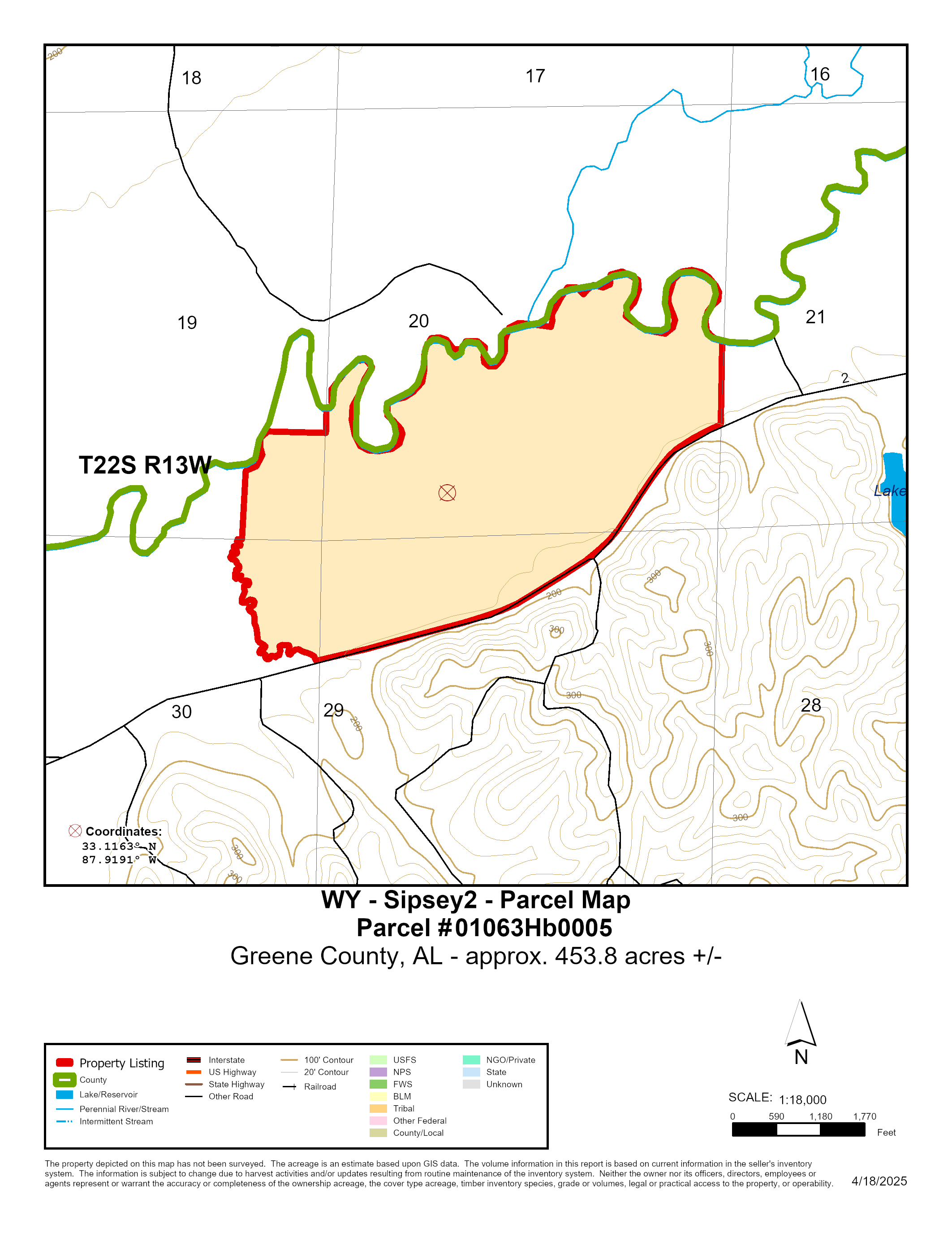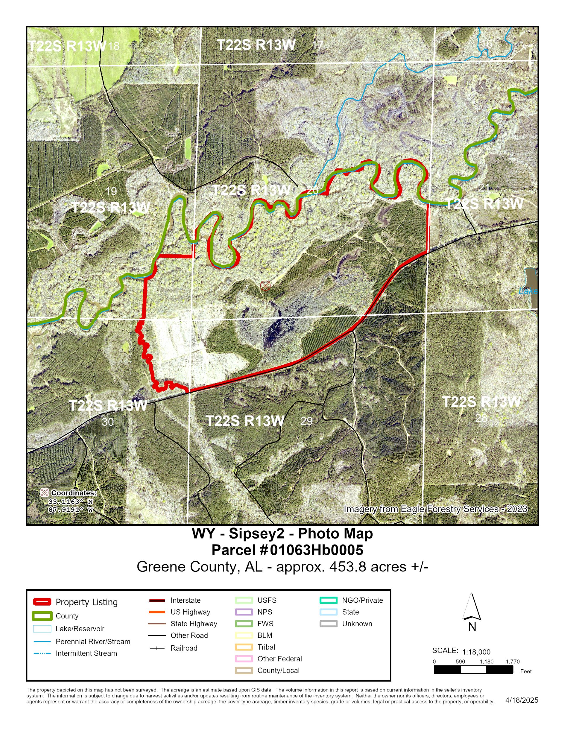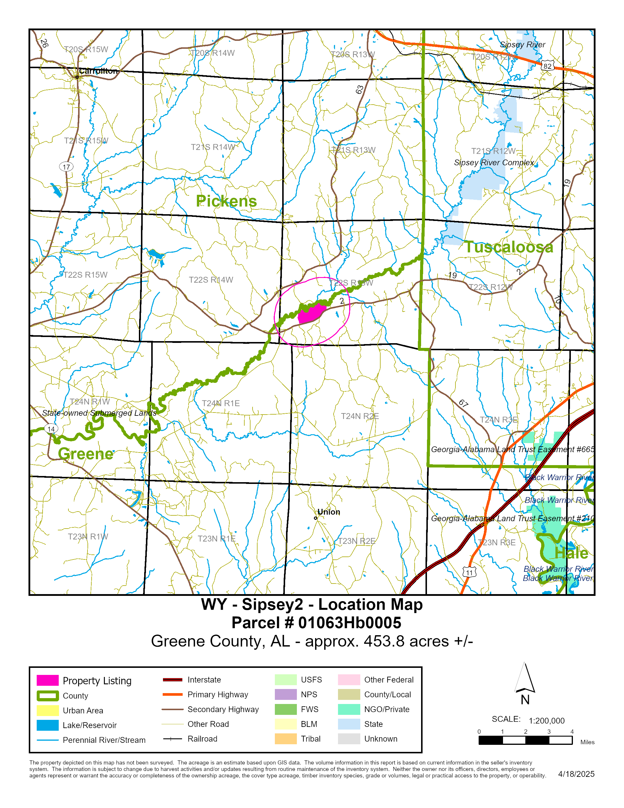 453.8 acres of prime timberland in Greene County, Alabama, featuring frontage on the scenic Sipsey River. Located just 17± miles from I-59/20 and Fosters, 30± miles from Tuscaloosa, and 81± miles from Birmingham, this property offers a rare blend of convenience and seclusion. With 227± acres of mature hardwoods, Tupelo Gum, and Cypress sloughs lined with beaver ponds, it’s a waterfowl hunter’s dream. The tract also includes 143± acres of 2015 pine plantation and 57± acres of versatile recently harvested land—perfect for reforestation, making into pasture, or wildlife habitat. Frontage on paved County Road 156, along with an internal road system and ATV trails, makes access a breeze. Excellent deer, turkey, and small game hunting, plus fishing and camping opportunities, make this a true outdoor enthusiast’s haven.