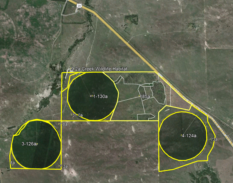 Equipment: Three center pivots with diesel power units and fuel tanks, seller owned fertilizer tanks, gearheads, and pumps.
