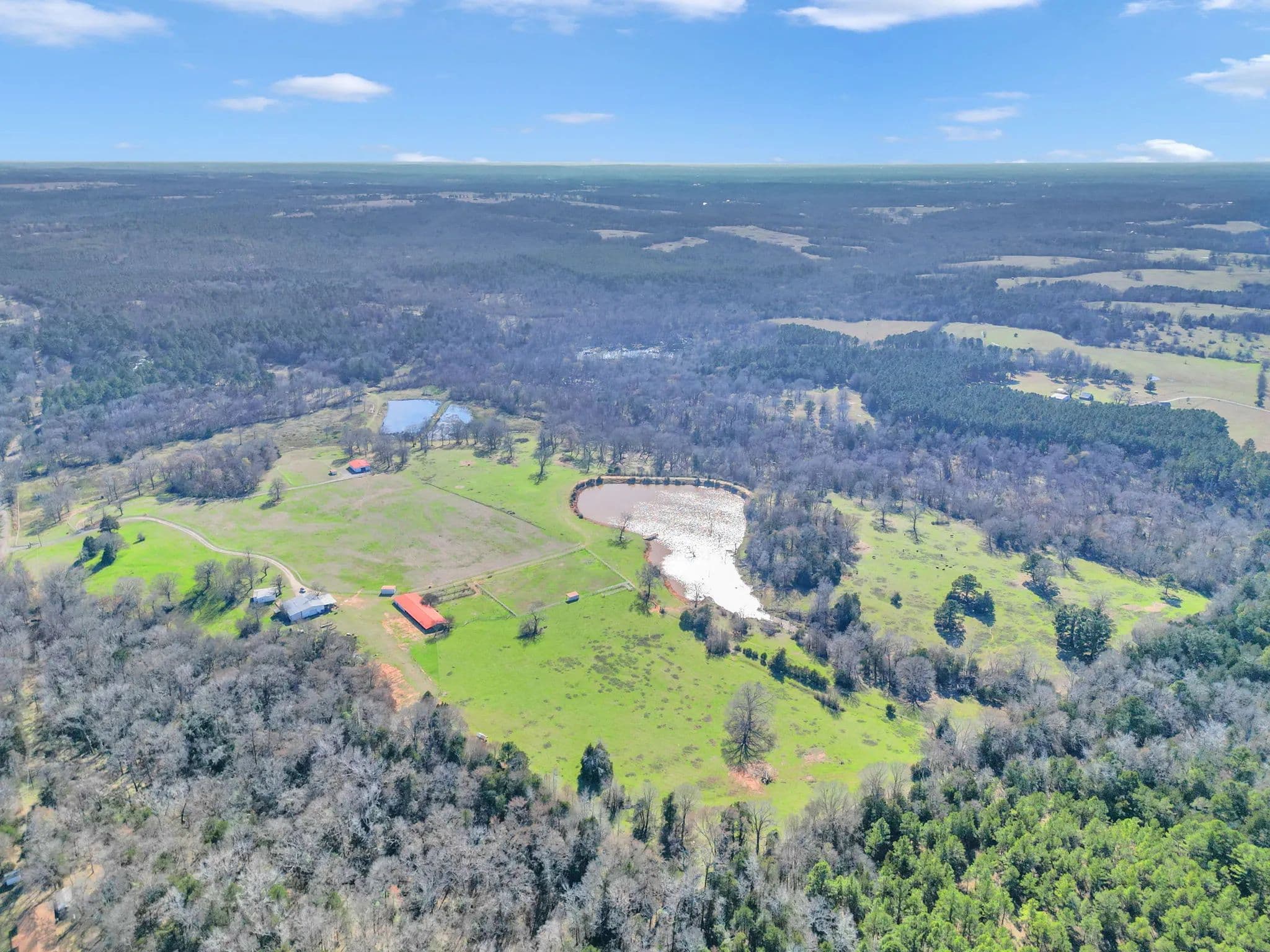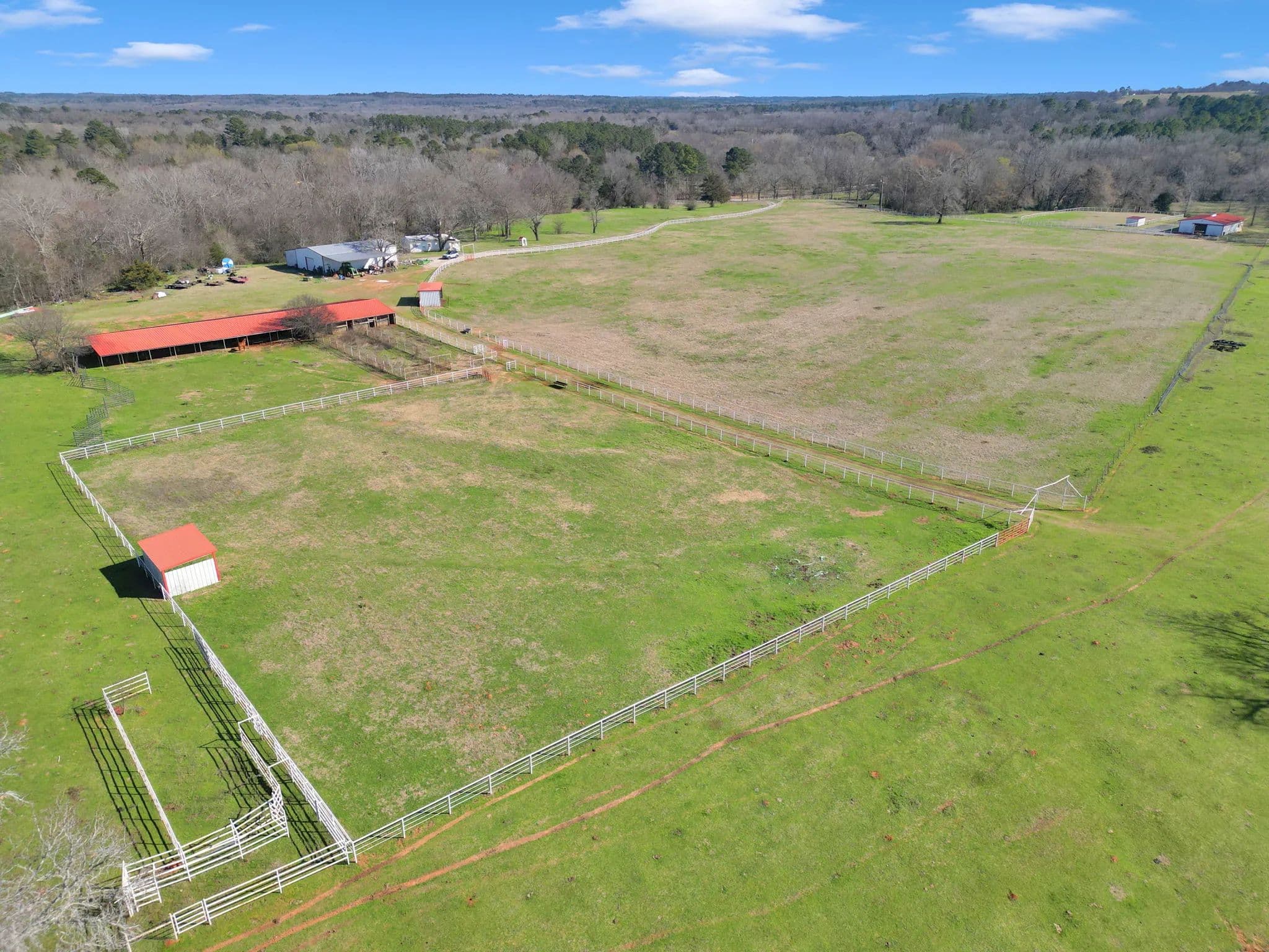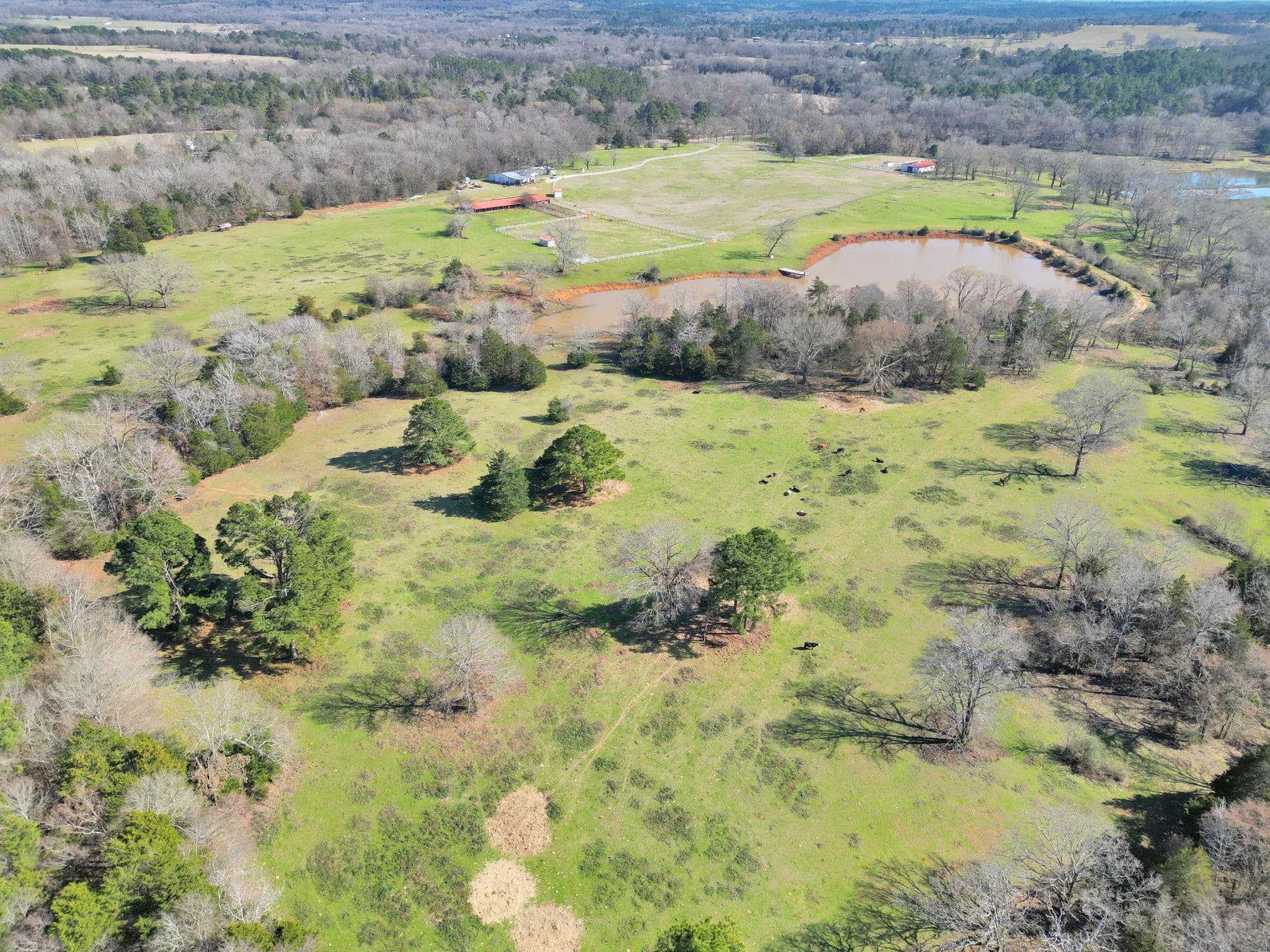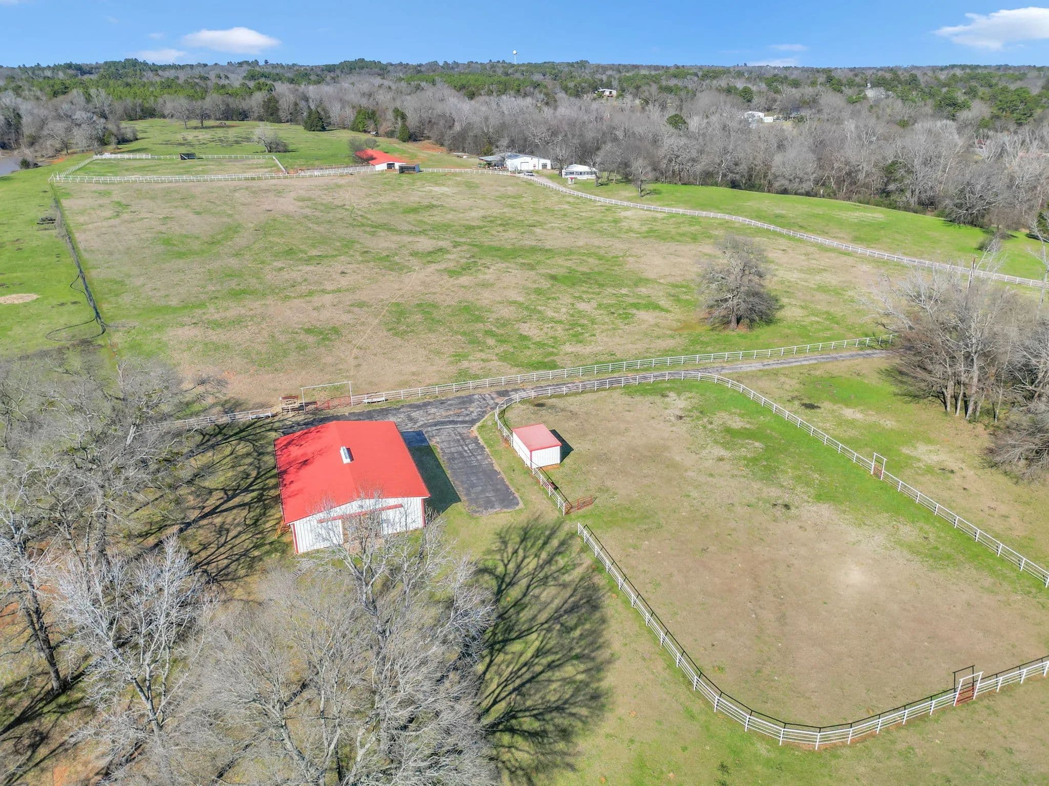 The 125-acre Fletcher Ranch in Lindale, East Texas, offers a unique and diversified experience. The property features pipe fencing, equine facilities, cattle grazing, a fishing lake, duck ponds, a live water creek, wildlife habitat, paved roads, a small cabin, and a workshop. Its location is very convenient to I-20 and US Highway 69, with Tyler, TX, being the largest major city nearby. There is plenty of shopping and dining in Lindale as well. The property includes 2,500 linear feet of road frontage on CR 481, with entry through a wrought iron gate from CR 481. The main ranch roads throughout the property are paved and lined with pipe fencing, leading to the 840 sq. ft. cabin, a 40 x 60 workshop, a horse barn, and an arena. Several scenic building sites are available. The centerpiece is a 45 x 60 barn featuring seven stalls with turnouts, including two foaling stalls, a tack room, and a feed room with excellent overhead lighting. For training purposes, a 125 x 200 arena with pipe fencing is in place. Just north of the barn is a 35-acre pipe-fenced grazing pasture with a loafing shed, and just north of that is a 10-acre pipe-fenced holding area, also with a loafing shed. There are scenic riding trails throughout the property. The grazing pastures outside the pipe fence provide ample grass for a small cattle operation. The propertys perimeter fencing secures the livestock, while the three bodies of water and creeks supply water for them. The property features three bodies of water and three live water creeks. For anglers, there is a three-acre stock lake with a pier. Duck hunters will find two shallow duck ponds, one two acres and the other one acre. Duck Creek, Hall Branch, and Bartley Branch traverse the property, enhancing the wildlife habitat. The northwest corner of the ranch is surrounded by heavy timber on neighboring properties, providing great wildlife habitat for whitetail deer. The terrain in the northern portion of the property is rolling, with timber-lined live creeks further enhancing the wildlife habitat. Find your freedom!