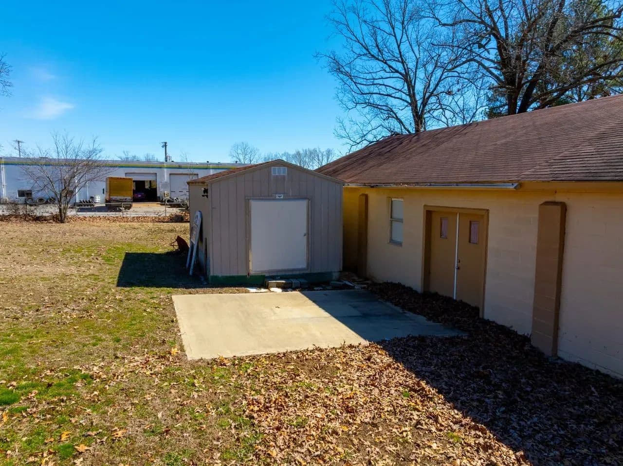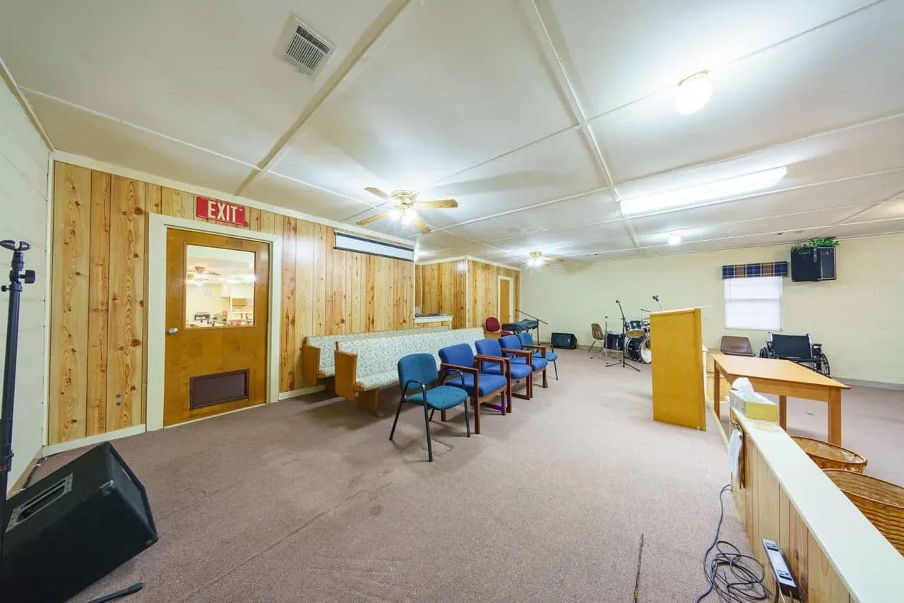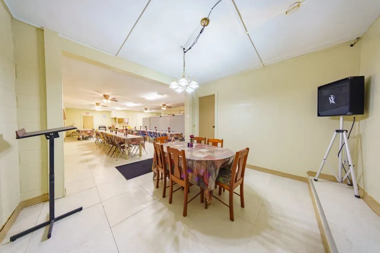 The property features a spacious, open sanctuary, ideal for retail, office space, or community-oriented businesses. A fully equipped kitchen provides added convenience, while three half baths and a separate shower room enhance the functionality of the space. A detached storage building offers ample room for inventory, equipment, or additional workspace.