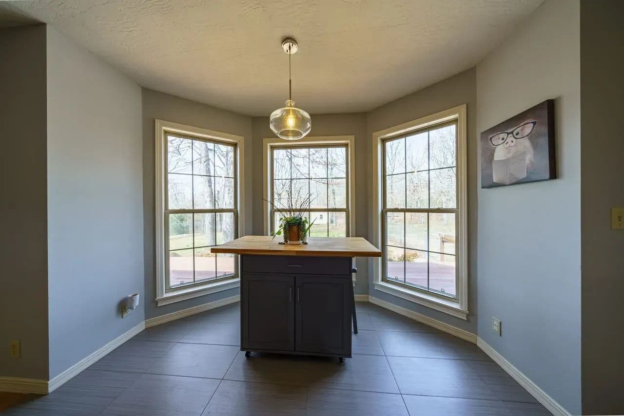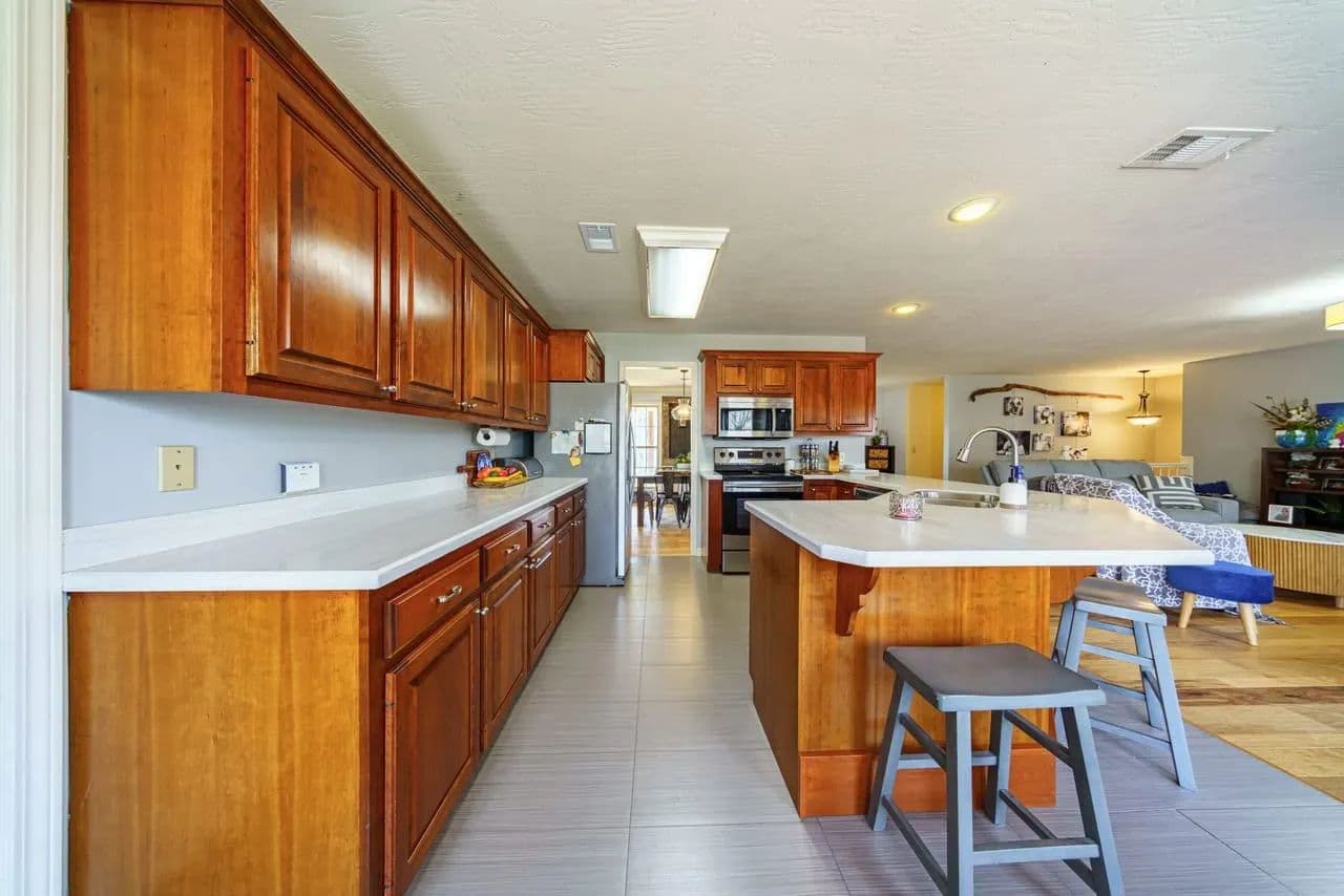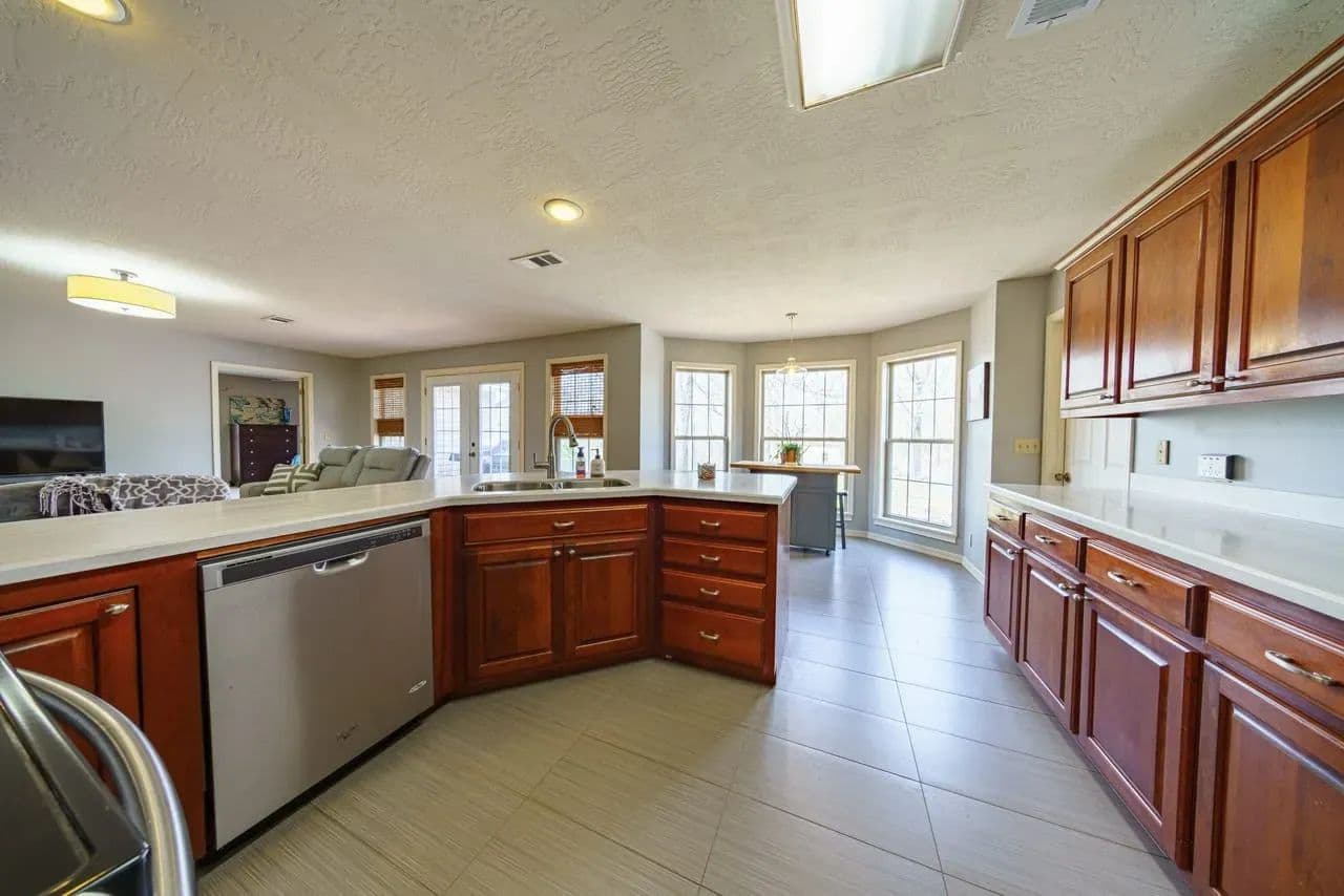 Bright, open living with large windows and a spacious kitchen featuring an oversized bar for seating, abundant cabinetry, and easy flow to dining and living.
