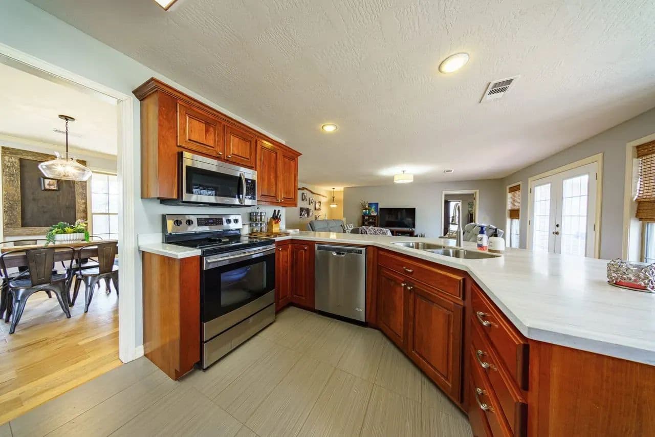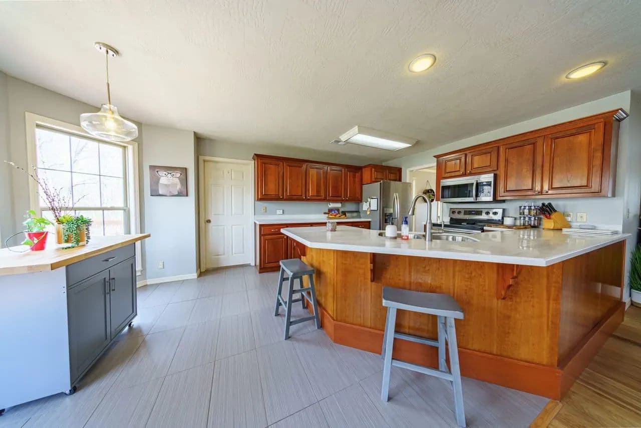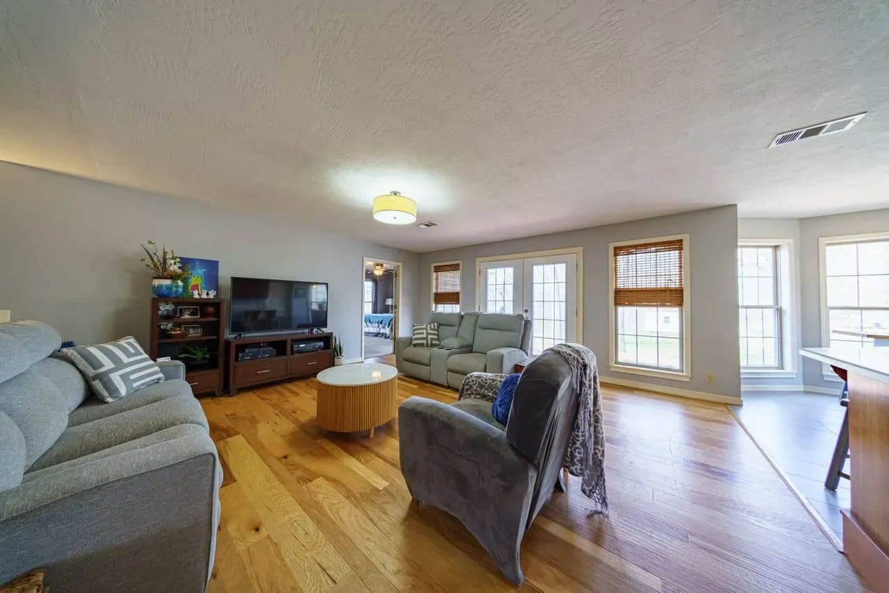 Bright, open living with large windows and a spacious kitchen featuring an oversized bar for seating, abundant cabinetry, and easy flow to dining and living.