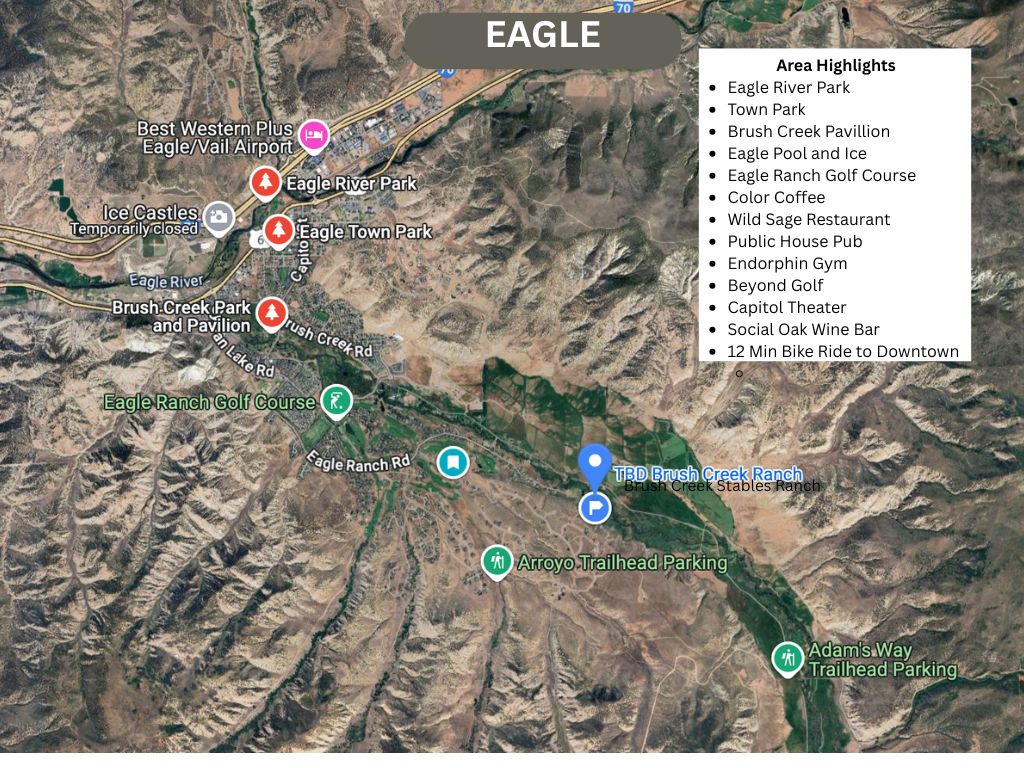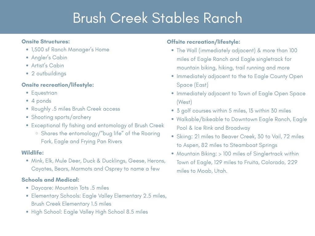 Tucked along Brush Creek in a secluded valley, this 36-acre ranch offers a rare blend of natural beauty and convenience. Just minutes from downtown Eagle, and adjacent to 1,671 acres of protected open space, Brush Creek Stables Ranch provides direct access to wildlife corridors, recreation trails, and private fishing along the creek.