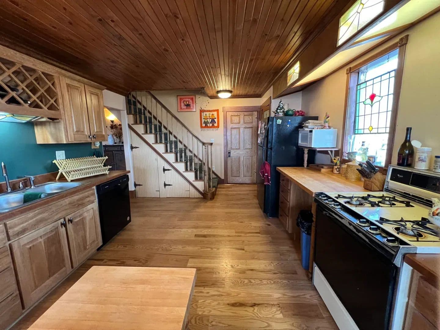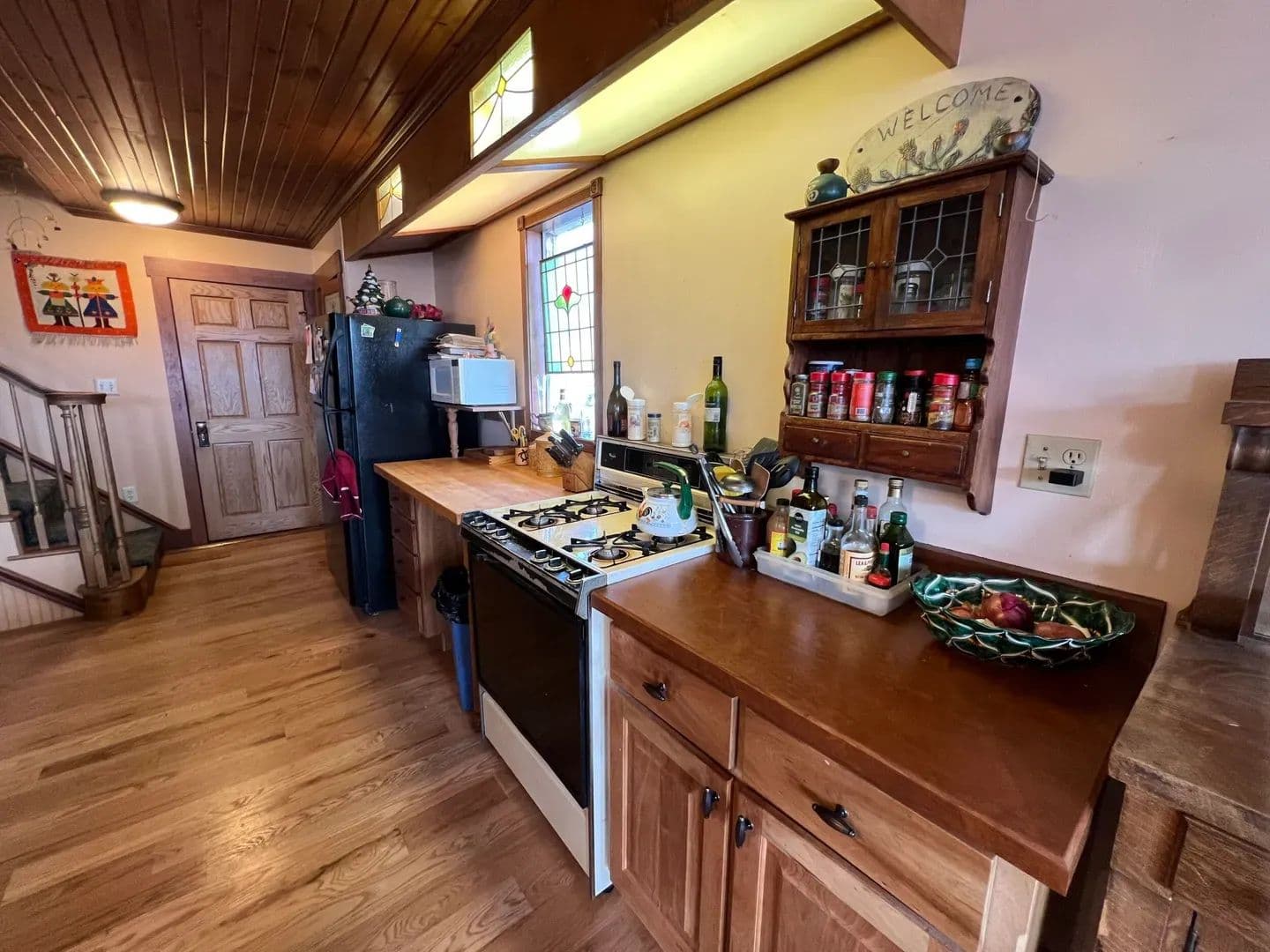 High ceilings (9½ ft), hardwood floors, and custom cherry cabinets