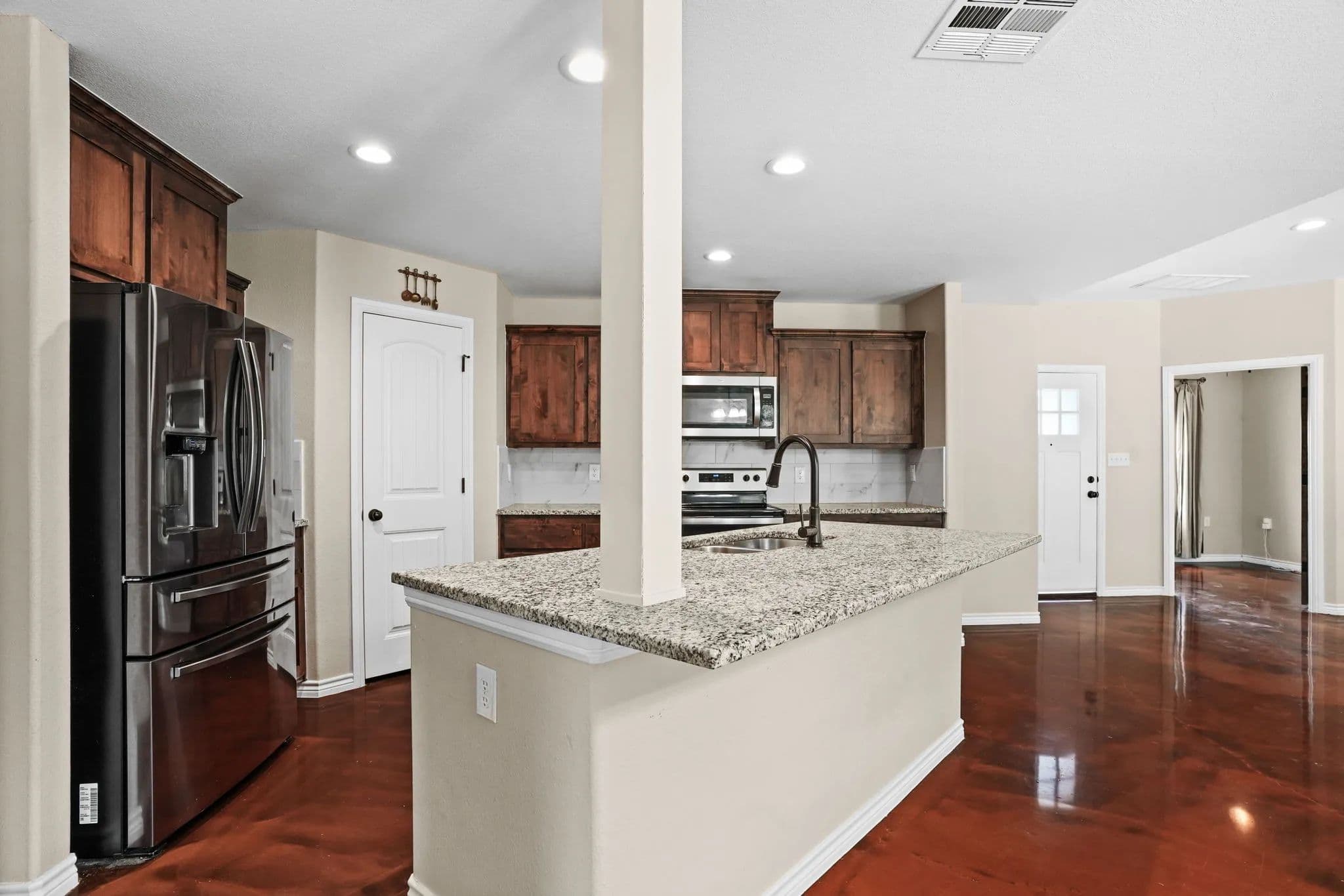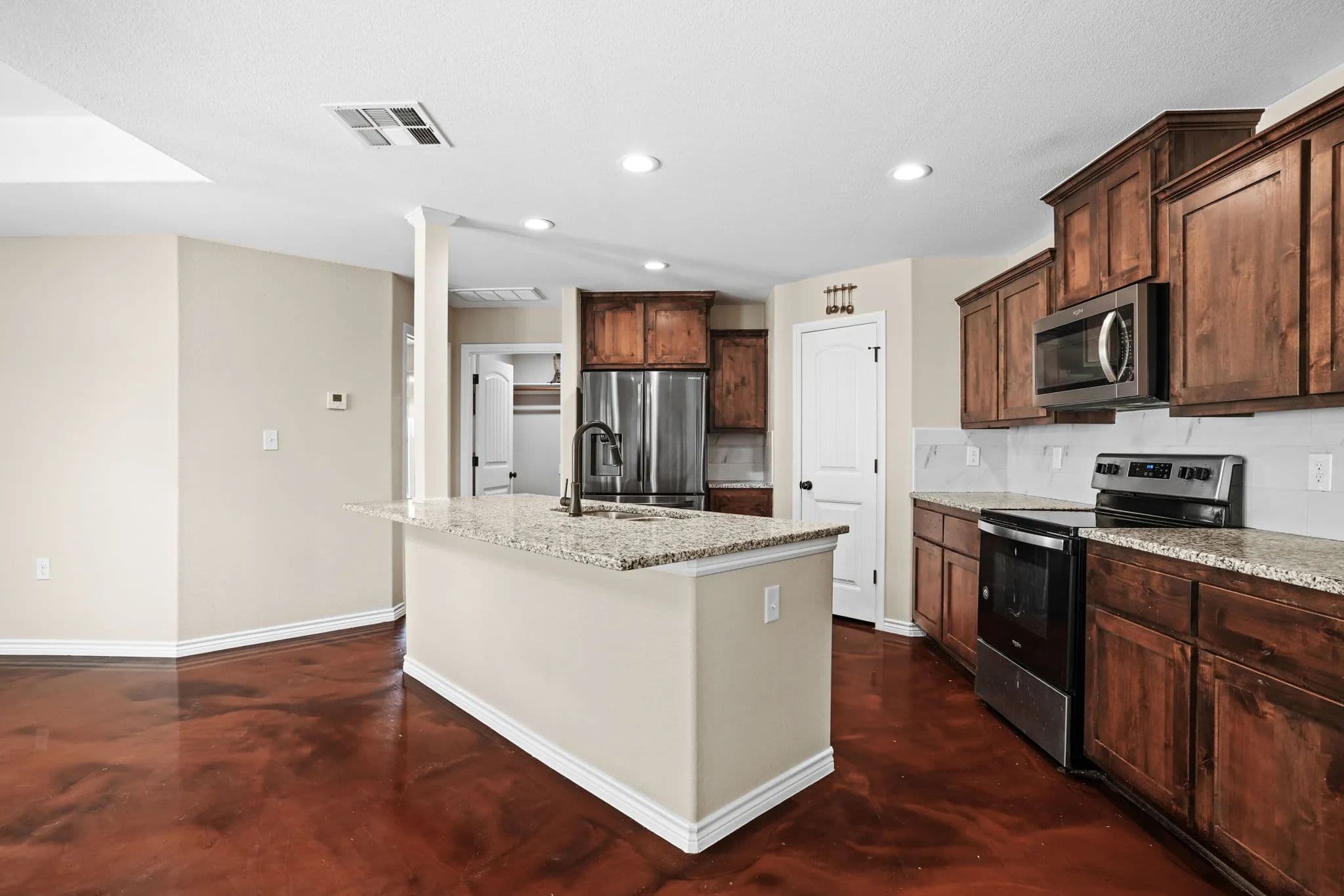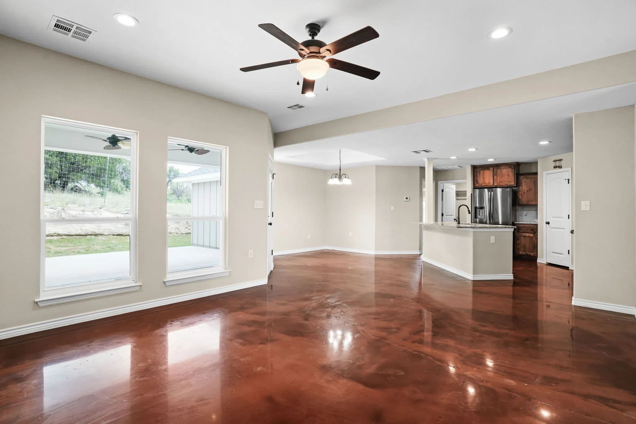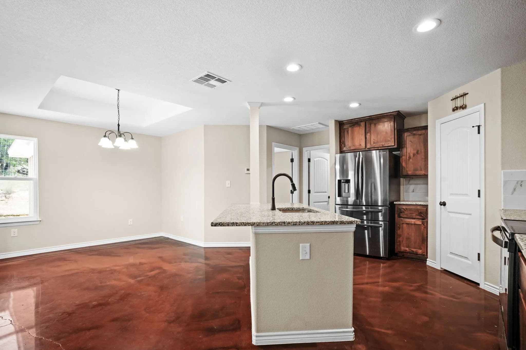 This spacious 3-bedroom, 2-bathroom home in the desirable Stone Valley Subdivision offers a perfect blend of functionality and luxury. With concrete floors throughout, an open and split floor plan, and a double garage, this property is perfect for families looking for a comfortable and practical living space. The kitchen is equipped with a breakfast island, separate dining space, custom cabinets, walk-in pantry, and stainless steel appliances that convey. The master bathroom features a double vanity, his and her closets, and a doorless walk-in shower, while the privacy-fenced backyard provides ample space for outdoor recreation and relaxation. Plus, the property backs up to a plot of land that will not be developed, ensuring a peaceful and serene atmosphere. The neighborhood is also great for outdoor activities like walking, biking, and playing, making it an ideal location for families.