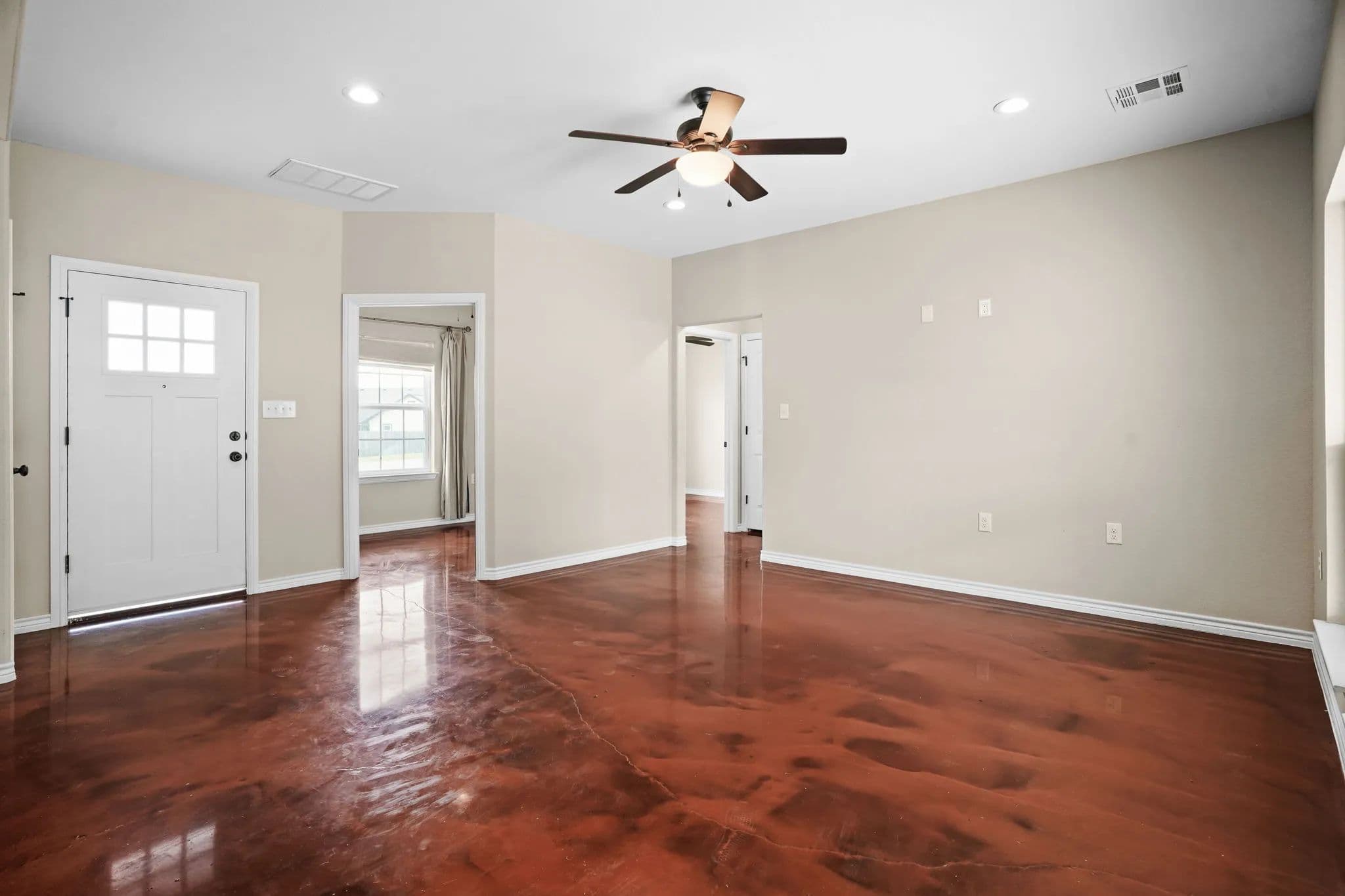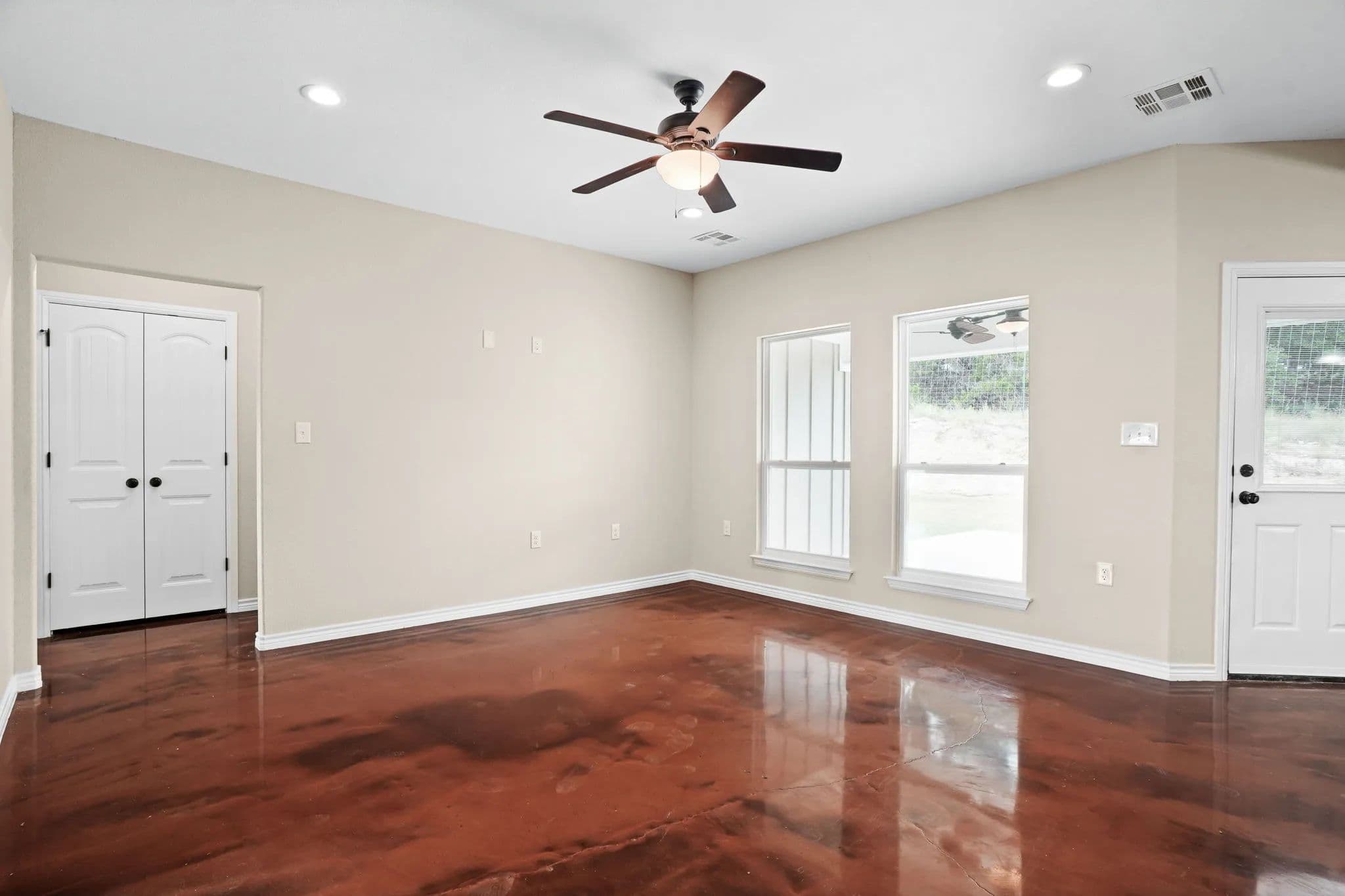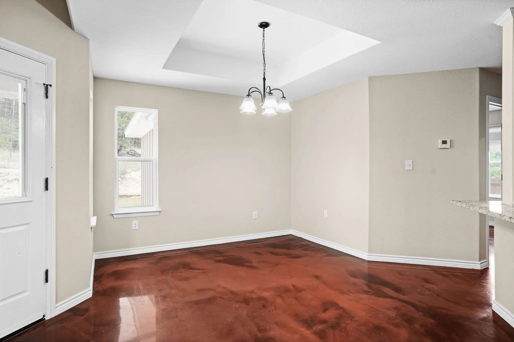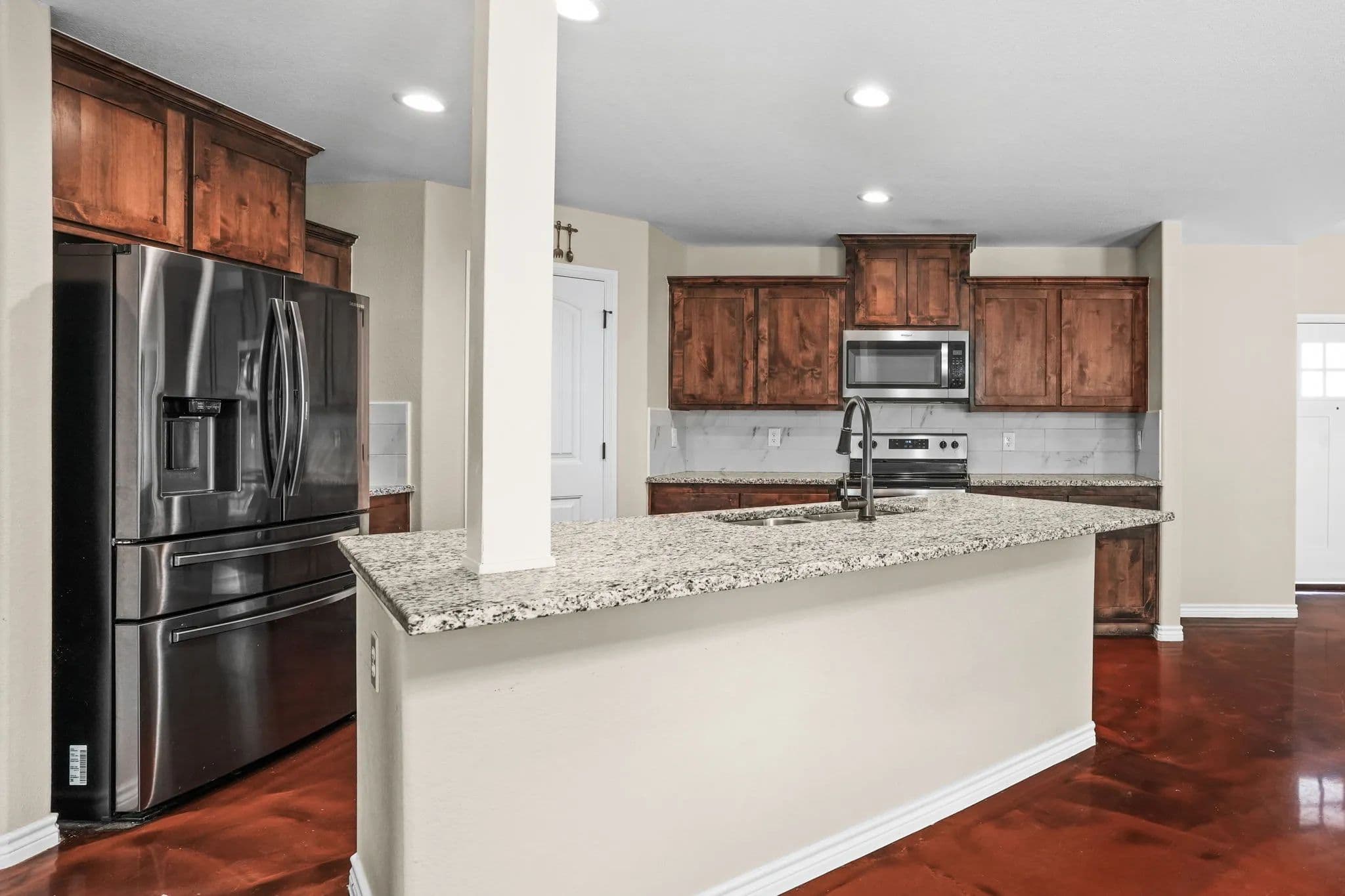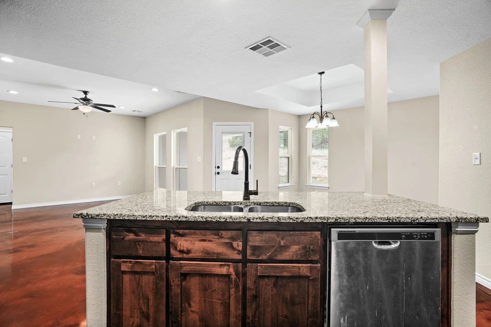 This spacious 3-bedroom, 2-bathroom home in the desirable Stone Valley Subdivision offers a perfect blend of functionality and luxury. With concrete floors throughout, an open and split floor plan, and a double garage, this property is perfect for families looking for a comfortable and practical living space. The kitchen is equipped with a breakfast island, separate dining space, custom cabinets, walk-in pantry, and stainless steel appliances that convey. The master bathroom features a double vanity, his and her closets, and a doorless walk-in shower, while the privacy-fenced backyard provides ample space for outdoor recreation and relaxation. Plus, the property backs up to a plot of land that will not be developed, ensuring a peaceful and serene atmosphere. The neighborhood is also great for outdoor activities like walking, biking, and playing, making it an ideal location for families.