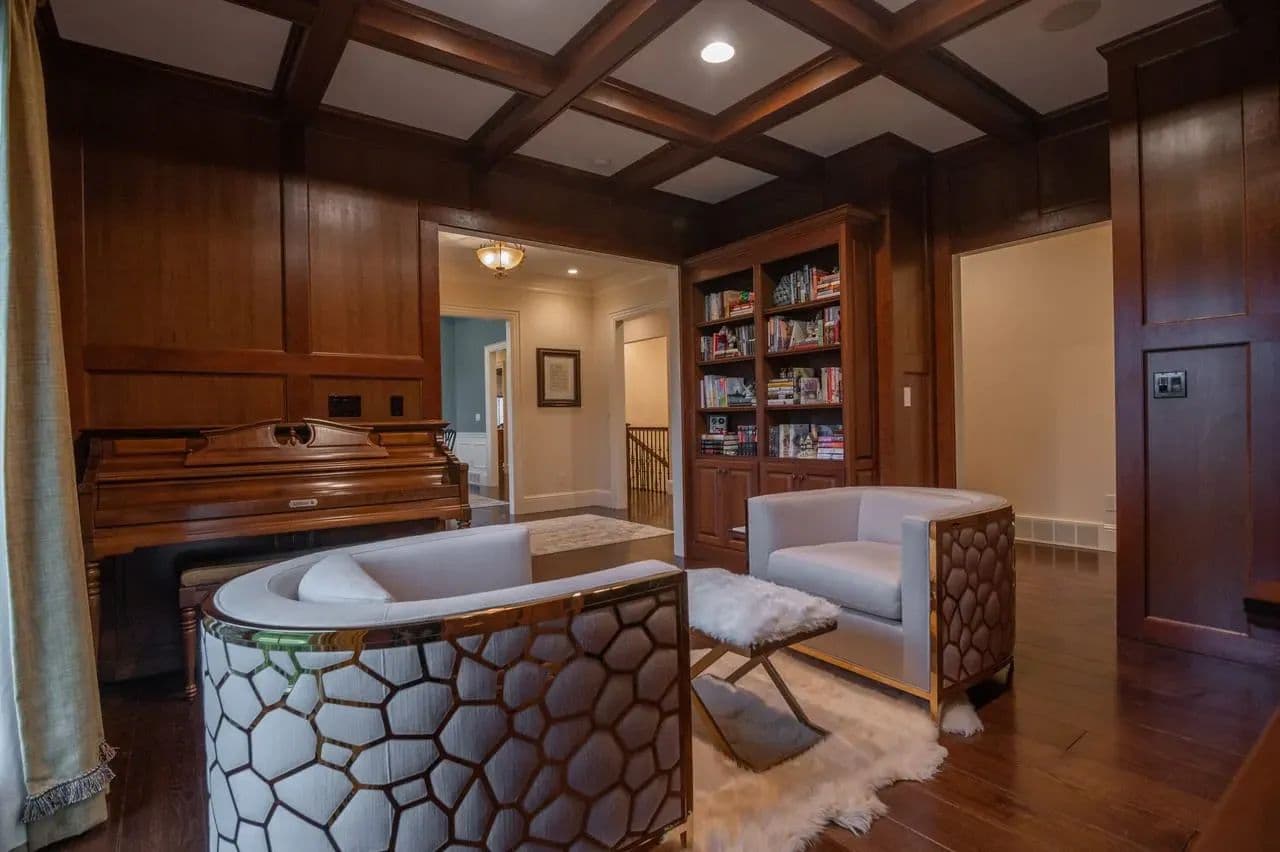 As you walk in, you're greeted by a main floor boasting vaulted ceilings, two large living areas, a formal dining room, and an office/library space with elegant built-ins. The spacious primary bedroom features a luxurious, feature-rich bathroom.