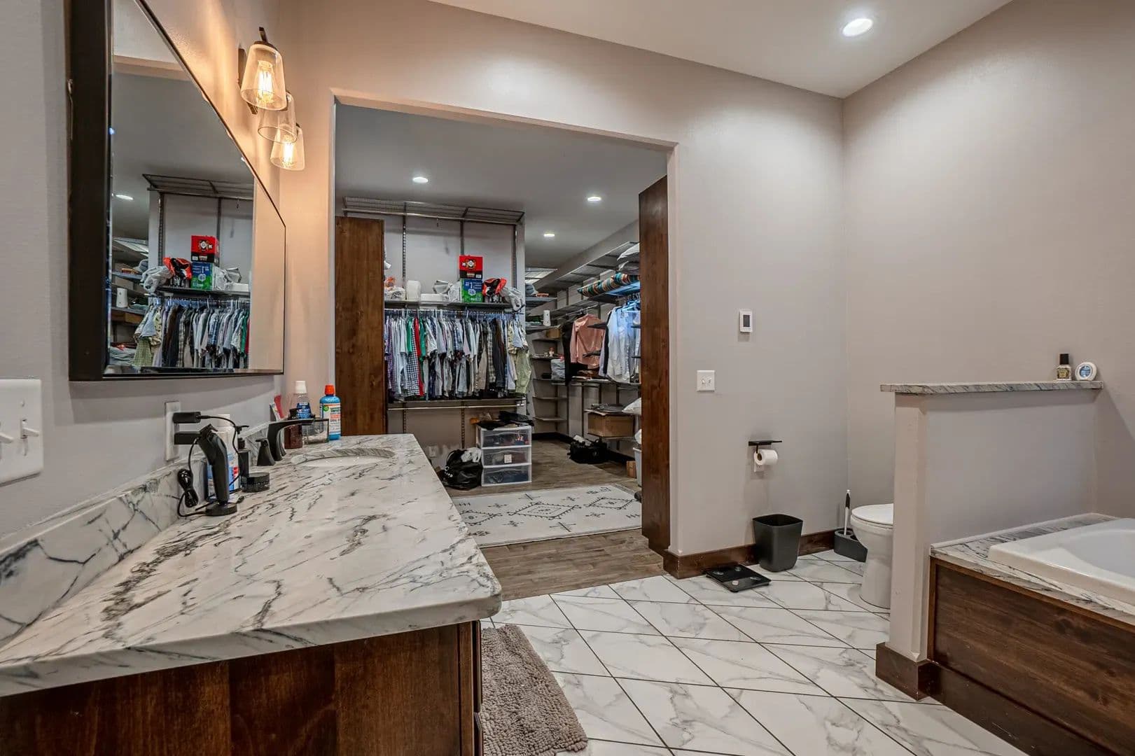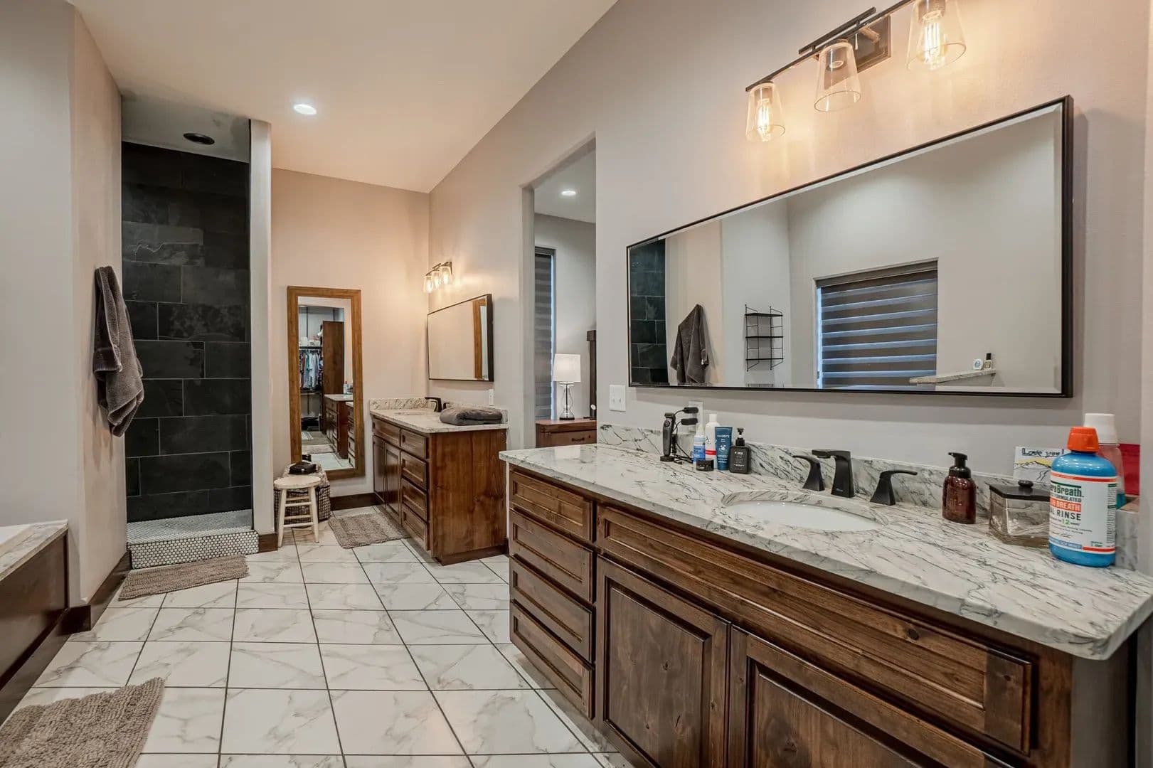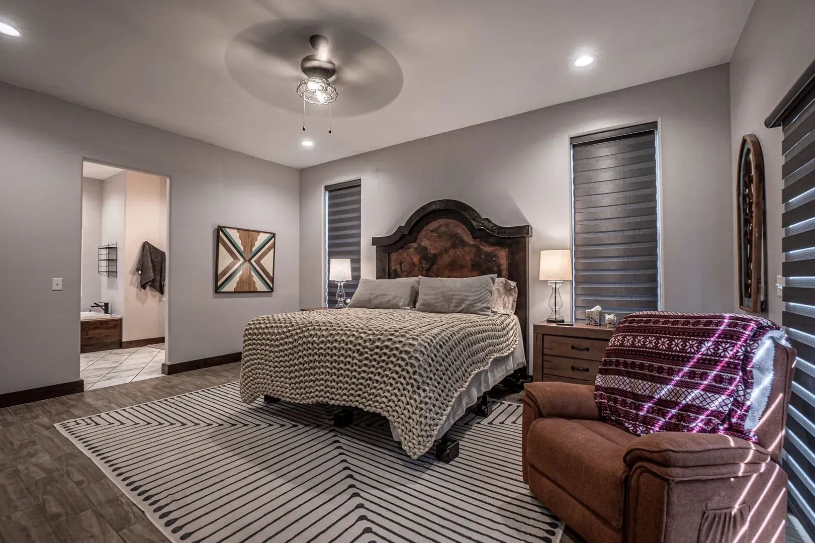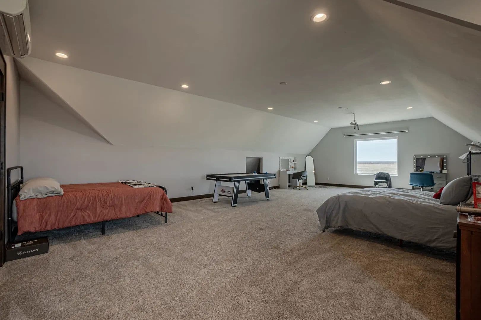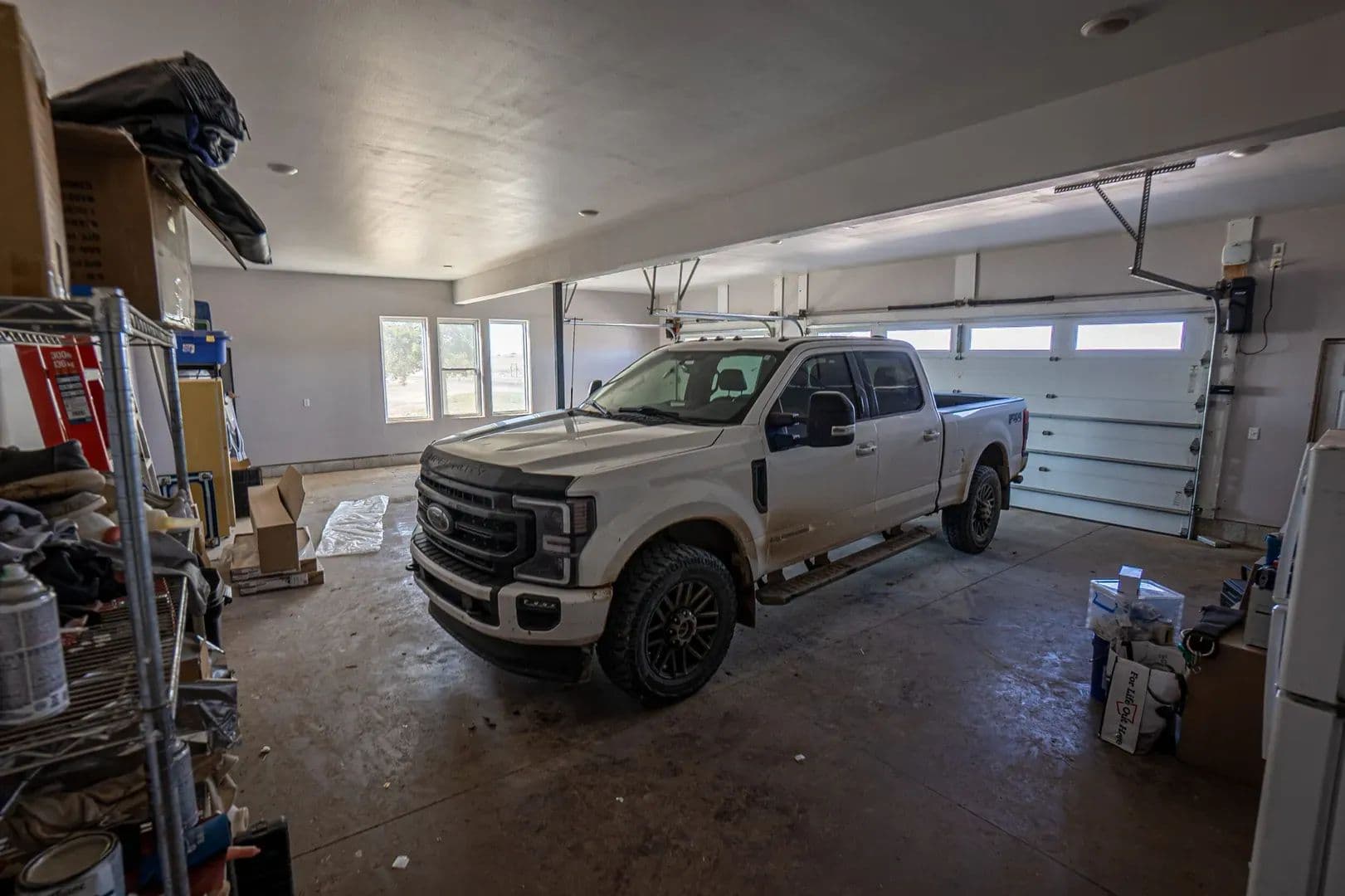 The master suite is a true retreat, complete with heated floors, a jacuzzi tub, a floor-to-ceiling tiled walk-in shower with a rain head, and an oversized walk-in closet with a built-in gun safe and direct access to a laundry room equipped with two washers, two dryers, and a dog bath. The 1,200 sq. ft. 3-car garage features 8-ft tall doors, accommodating pickups with ease. Comfort is guaranteed year-round with two A/C units, two furnaces, and a whole-home generator powered by its own 500-gallon propane tank. Thoughtfully designed for both efficiency and elegance, this home is the ultimate modern ranch retreat.
