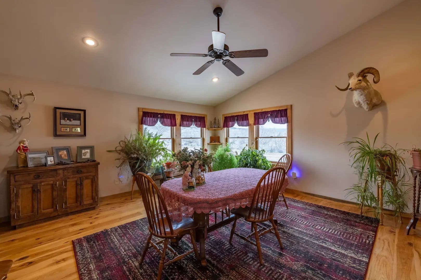 The custom-built ranch home, completed in 2006, offers a 4 bedrooms & 2 1/2 bathrooms with 2,800 square feet of thoughtfully designed living space. The open-concept layout, cathedral ceilings, and large Andersen windows create a bright and welcoming atmosphere, complemented by a striking stone fireplace at the heart of the home. Hickory and tile flooring run throughout, while the kitchen stands out with its unique blue-trim cabinetry and custom window coverings. With four bedrooms and two and a half bathrooms, there is plenty of space for family and guests. The home is supported by a private well with a reverse osmosis system and a 1,000-gallon owned propane tank, ensuring efficiency and self-sufficiency.