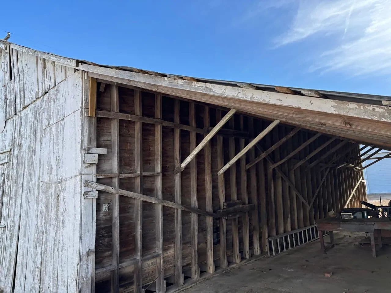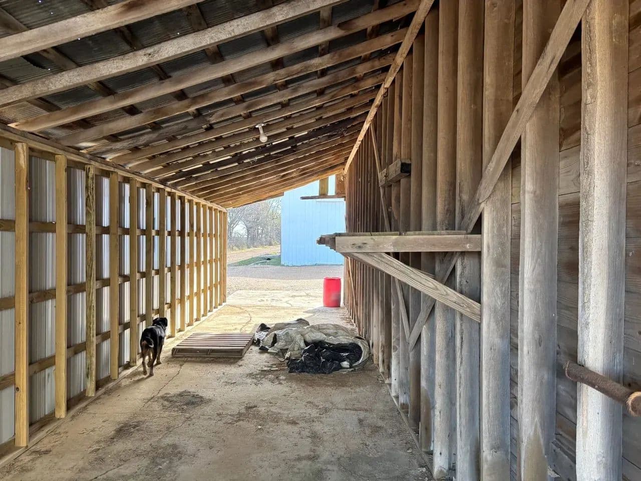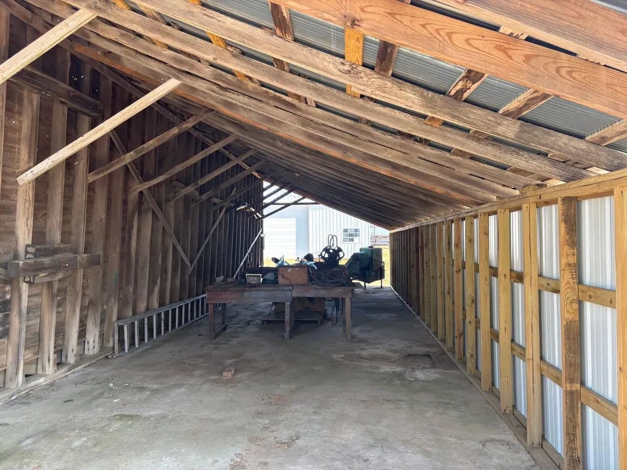 1 Wooden storage barn/shed 50 feet by 54 feet with sheet metal roof and with two lean to sides that have concrete floors. No electric power at this time.