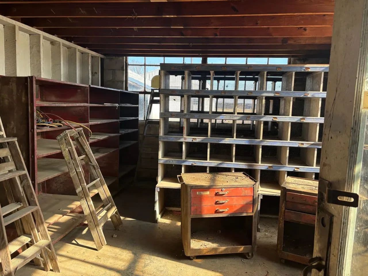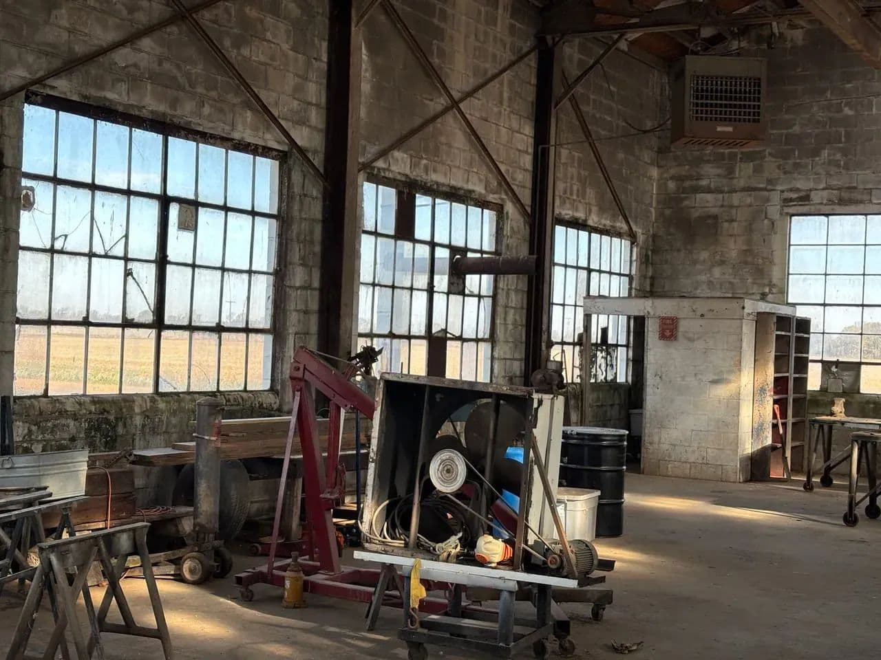 1 Farm Shop with parts storage bins and 3 story office/ inventory/ workshop bunkroom 70feet by 70 Feet 35 feet tall 2 overhead doors (25 feet tall) bathroom, cinder block walls, and metal framed building. Full electric LED lighting,150-psig compressor, one welding plug, 110 volt plugs, overhead crane with junction box to place a 2 ton hoist if needed. Fully code compliant. Electric outlets can be added to meet the lessee's needs.