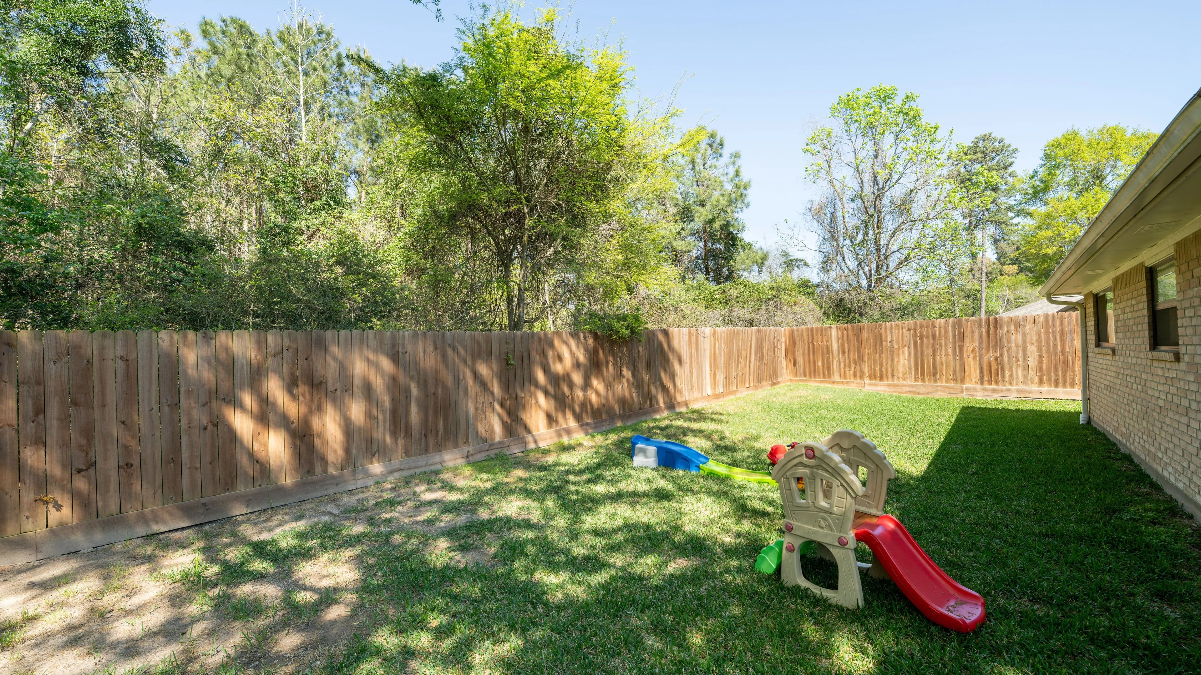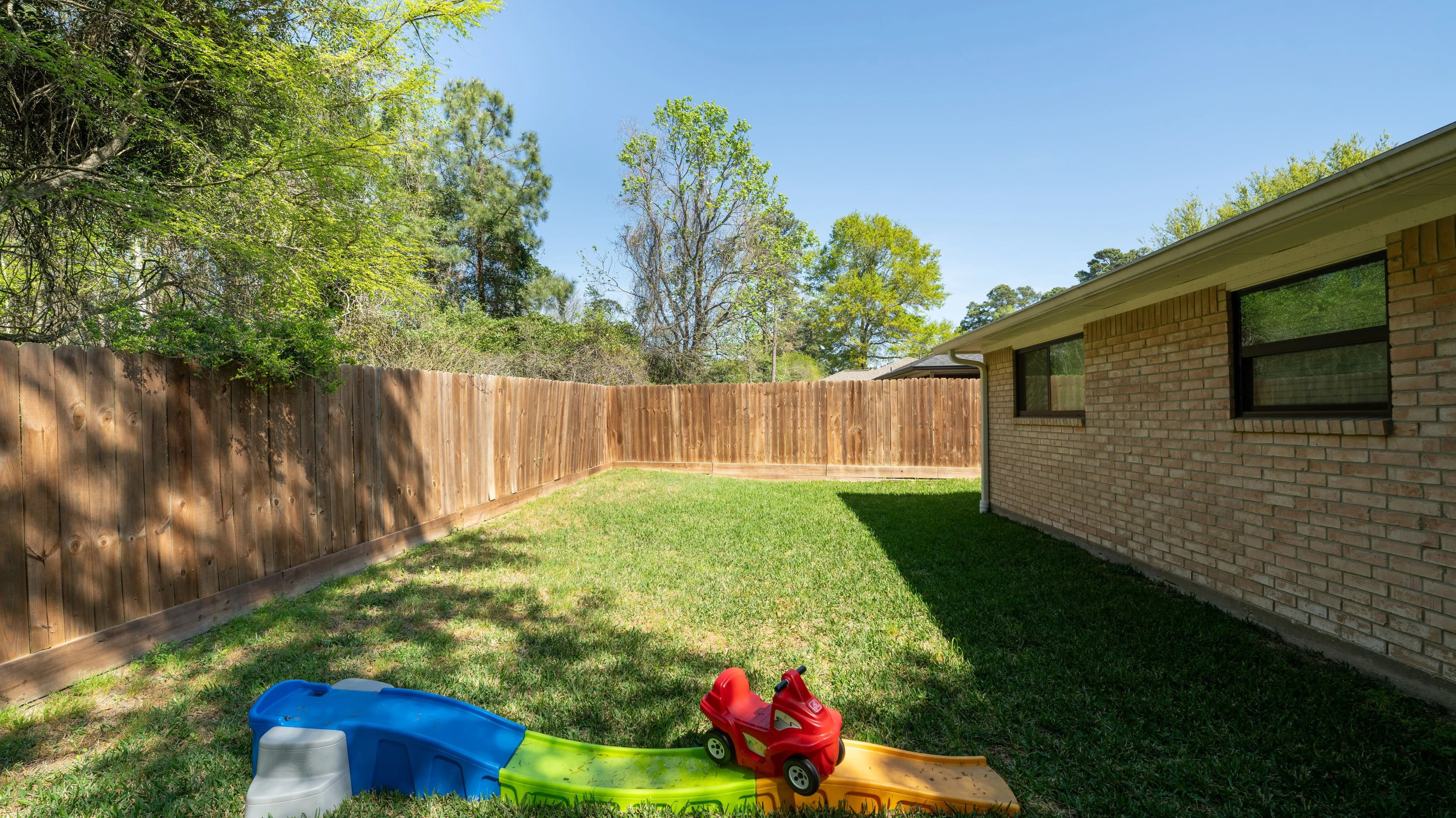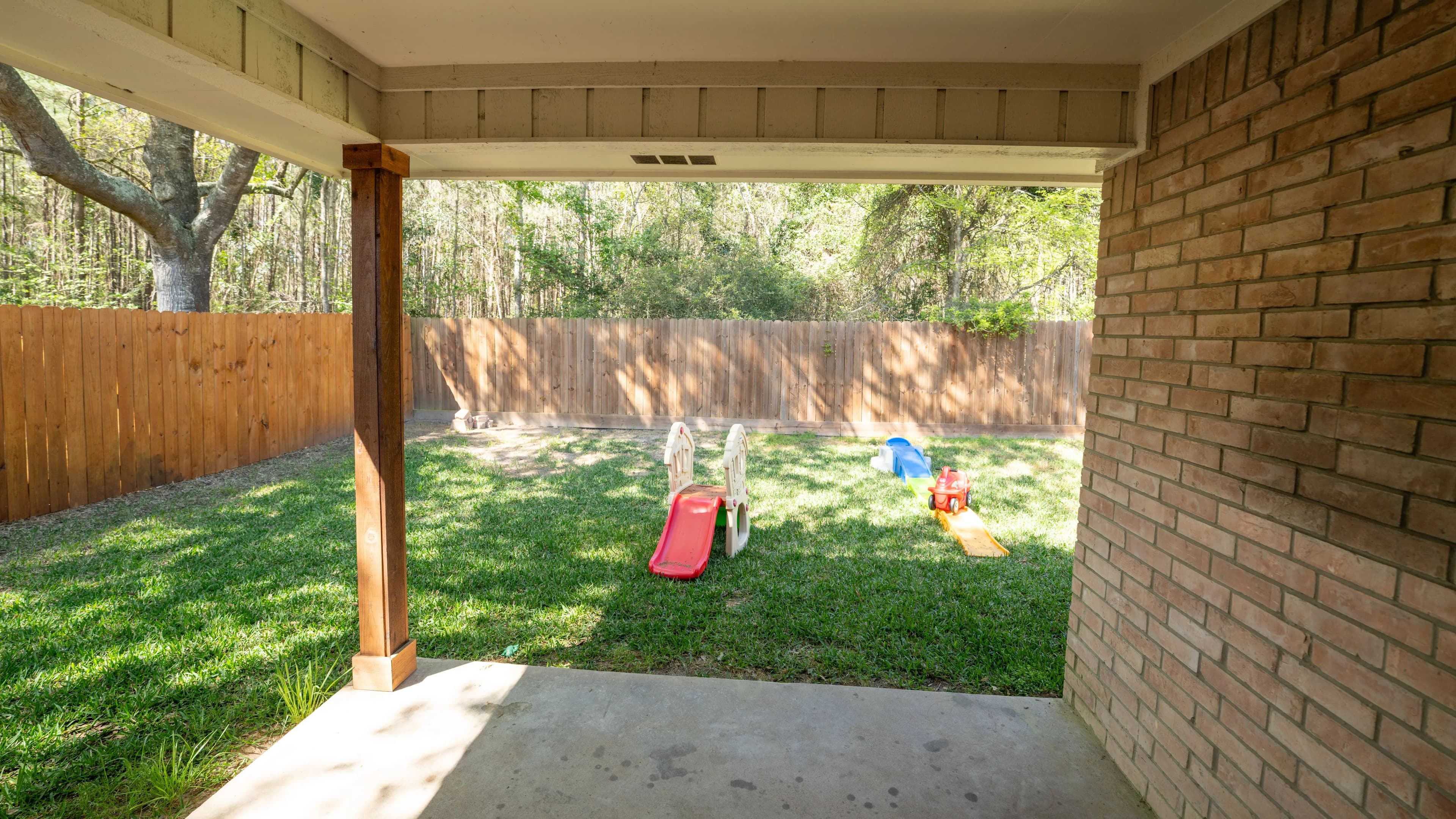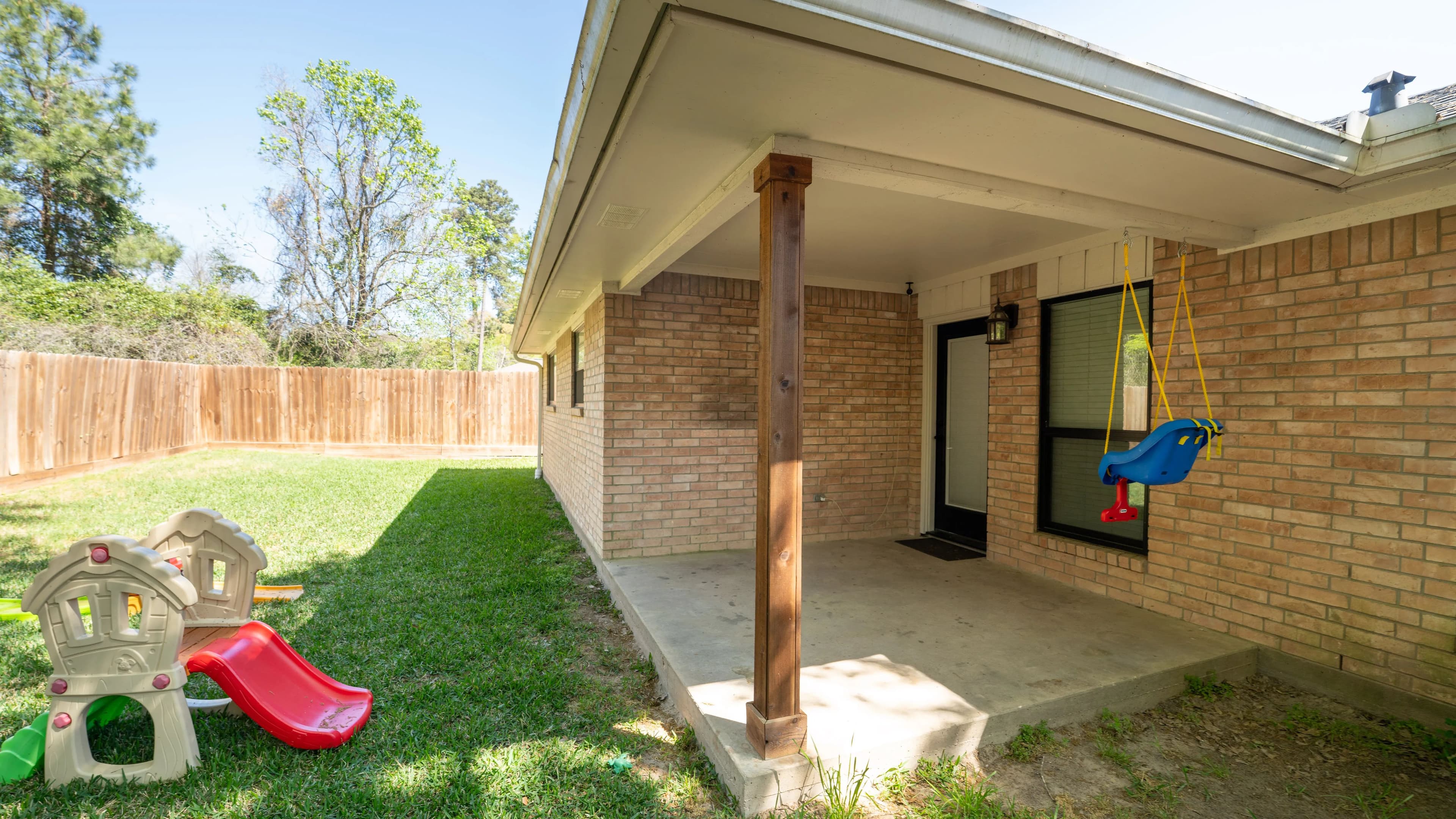 In the back yard, you'll find a covered patio area for grilling and relaxing with plenty of shade in your privately fenced in yard.