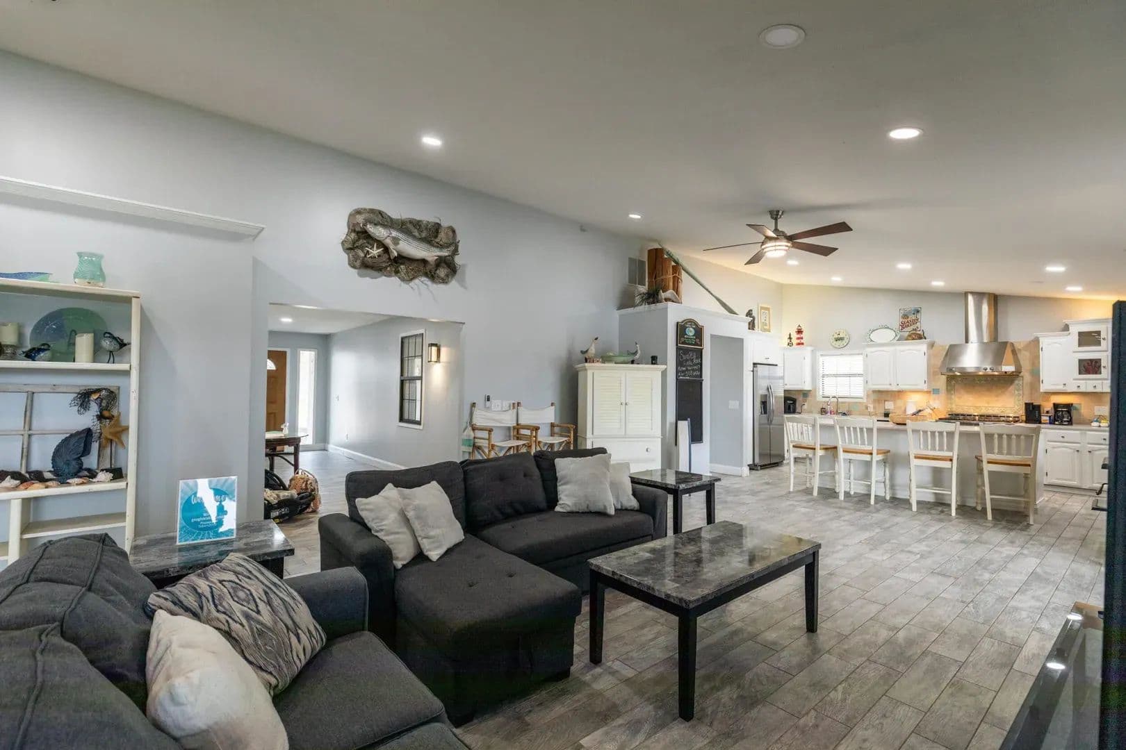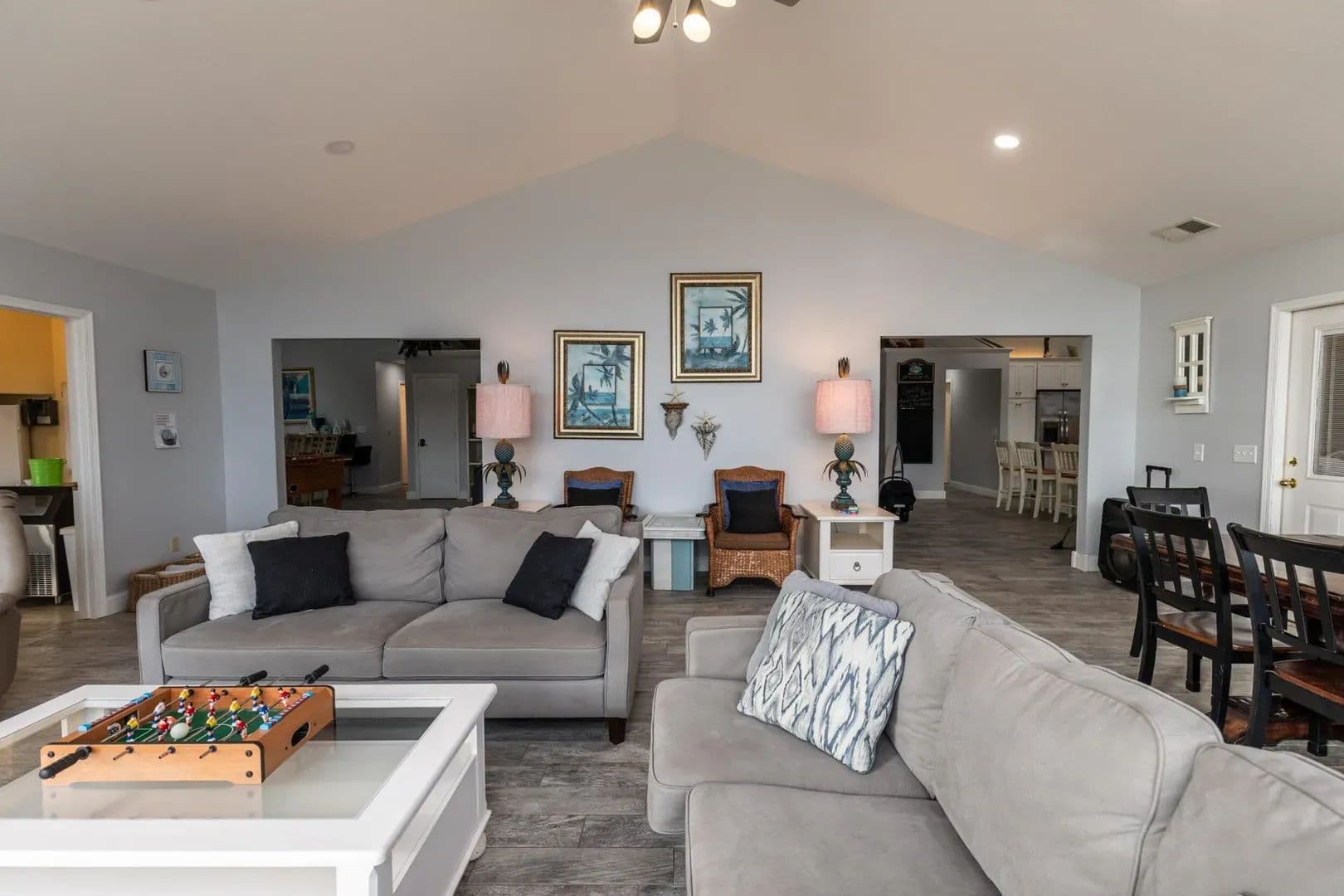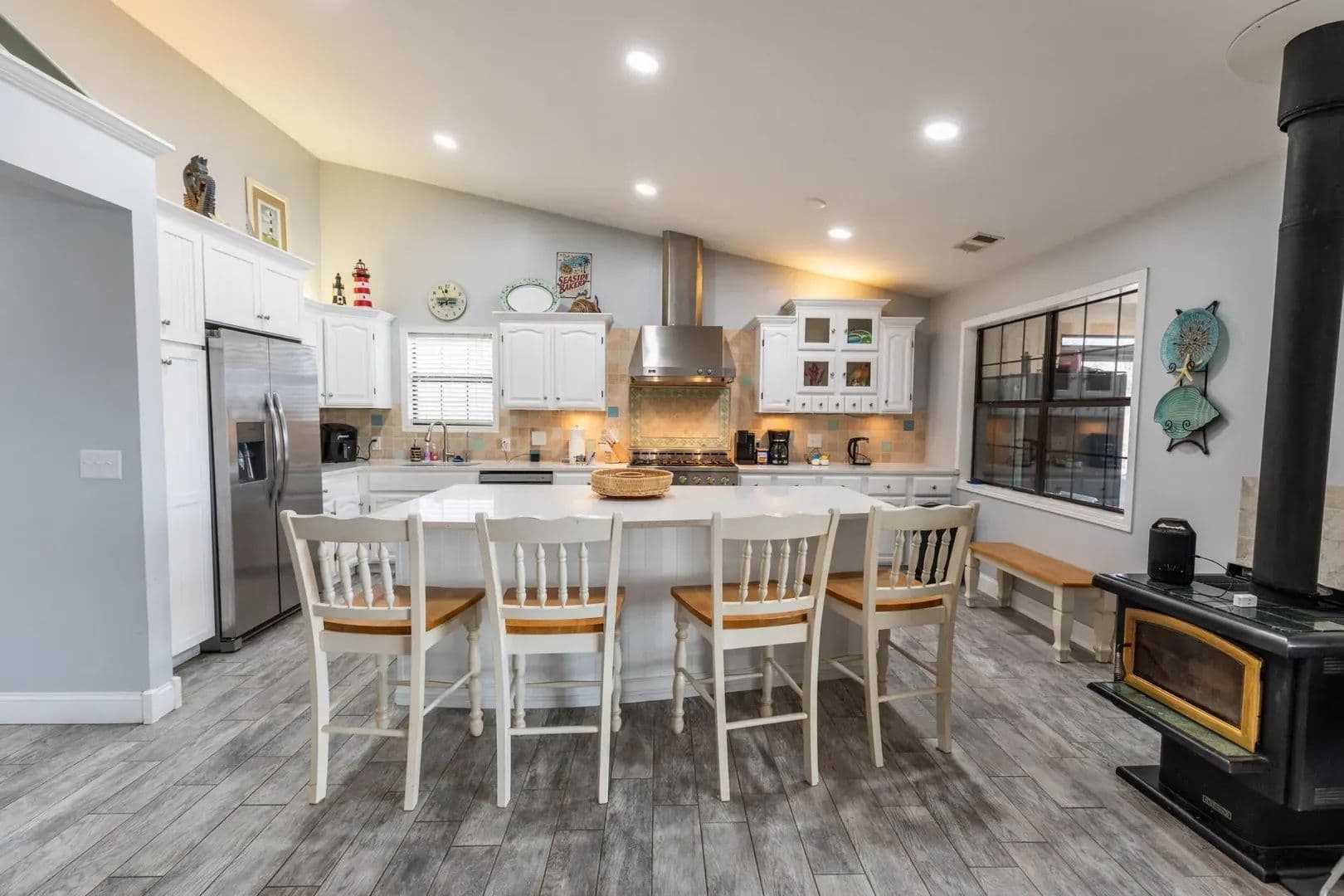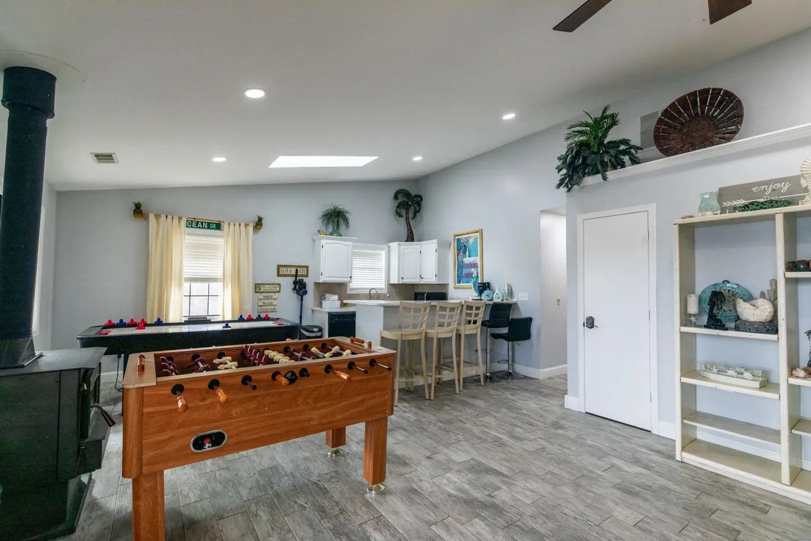 Designed for both private retreats and Airbnb success, this fully furnished 6-bedroom, 3.5-bath home offers stunning lake views from the open-concept living area. The kitchen boasts granite countertops, stainless steel appliances, and a gas stovetop, seamlessly flowing into a wet bar and entertainment space. Cozy up by one of the two fireplace stoves, or step into the hot tub room, which leads directly to the sandy beach. A screened-in outdoor patio allows for year-round enjoyment, while multiple TVs, foosball, and air hockey ensure indoor entertainment for guests of all ages.